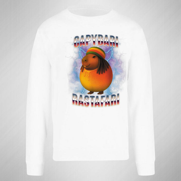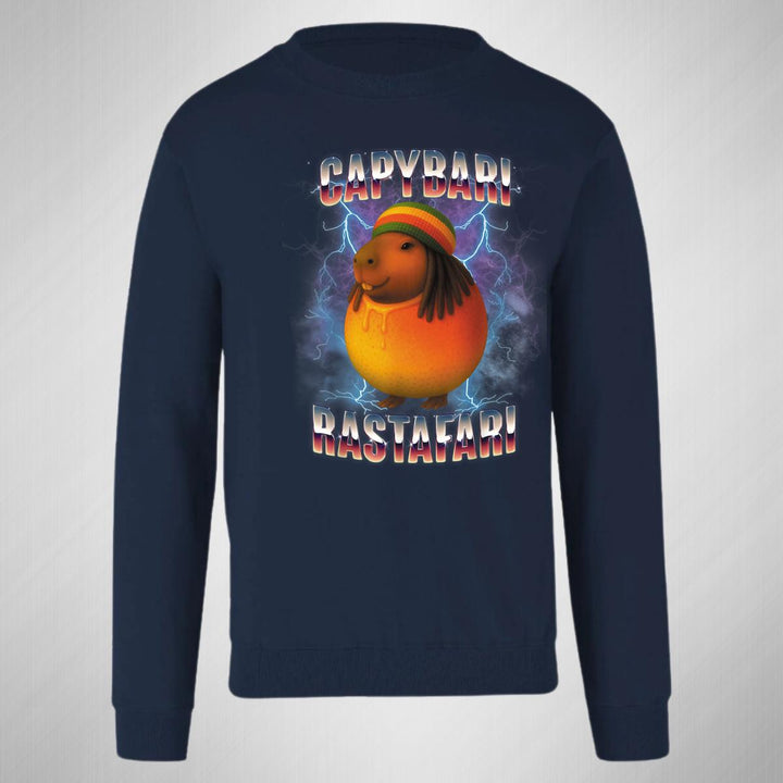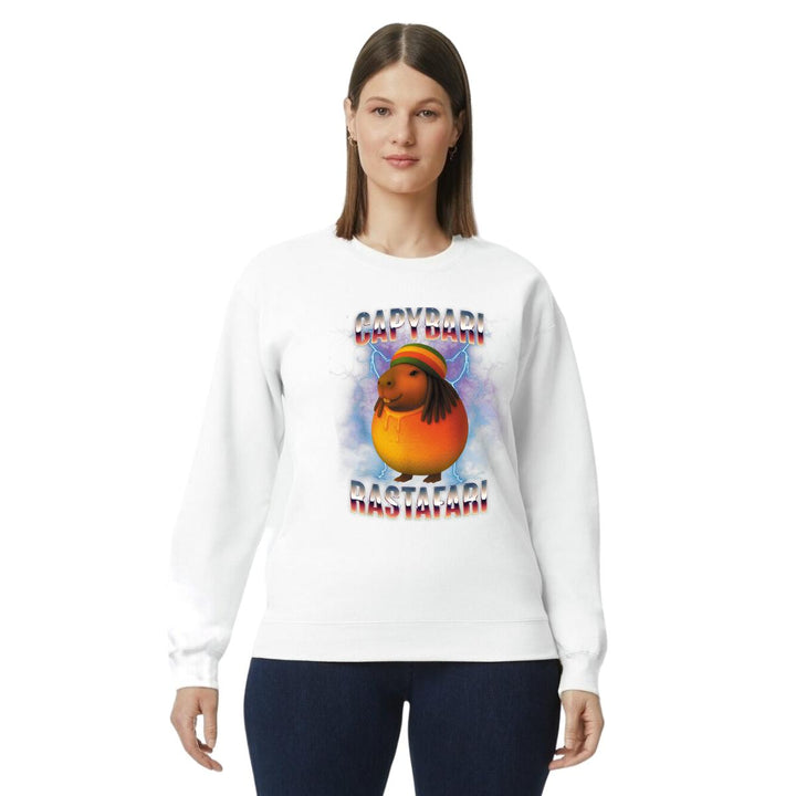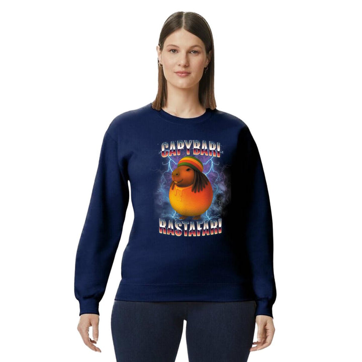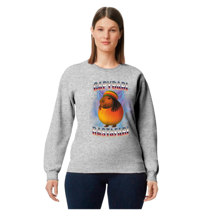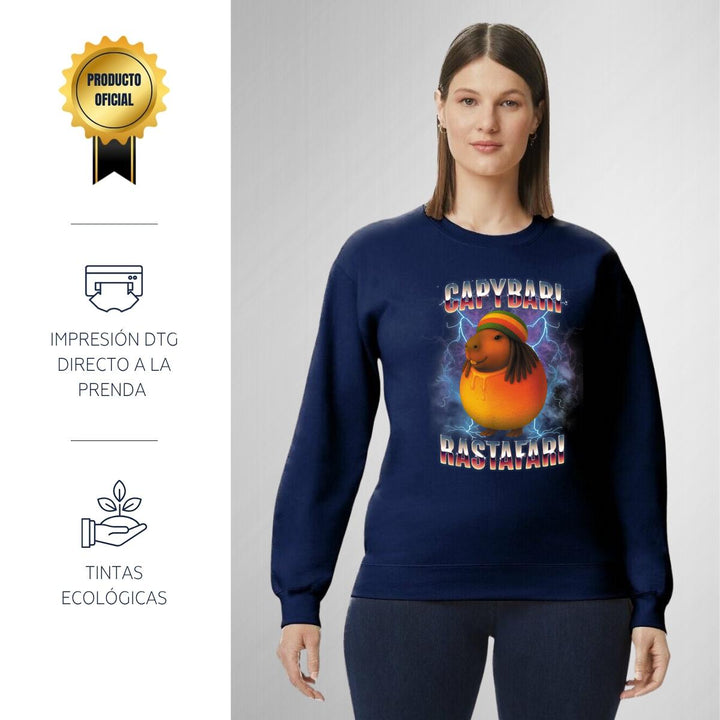 Sudadera de adulto cuello redondo sin gorro o capucha, para mujer nueva, diseño Brainrot Capybari Rastafari original impreso con tecnología DTG (directo a la prenda) tacto cero, uso casual o deportiva, 50% algodón y 50% poliéster, estructura sin costura en los costados con ajuste clásico. Colores de sudadera: Negro, Blanco, Azul Marino, Gris.