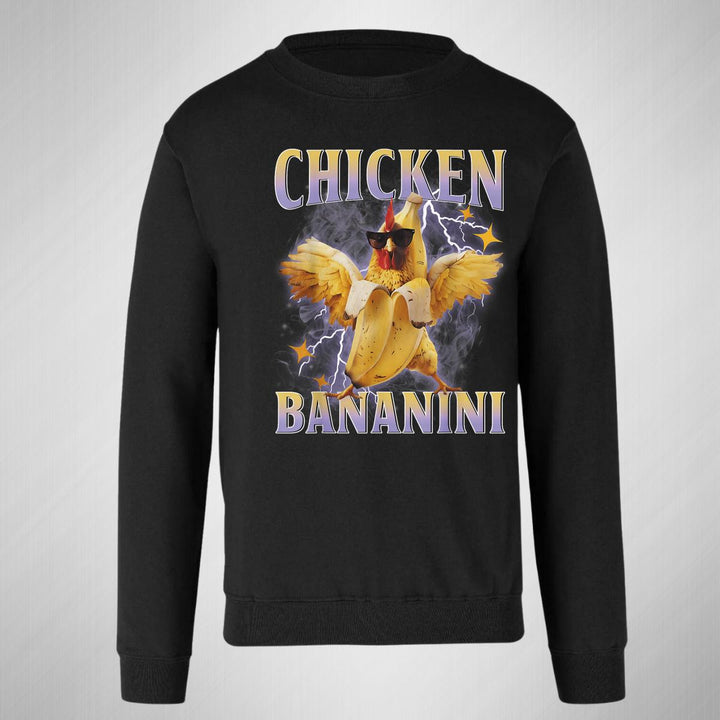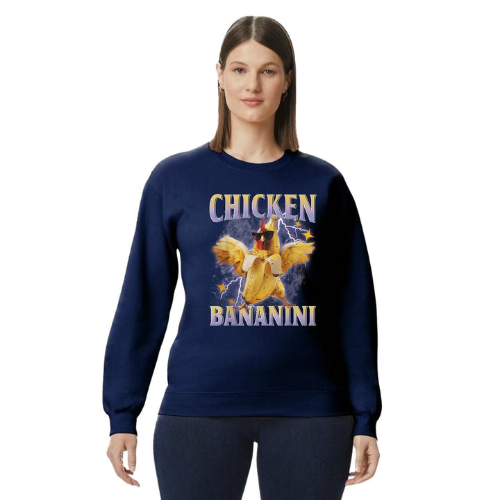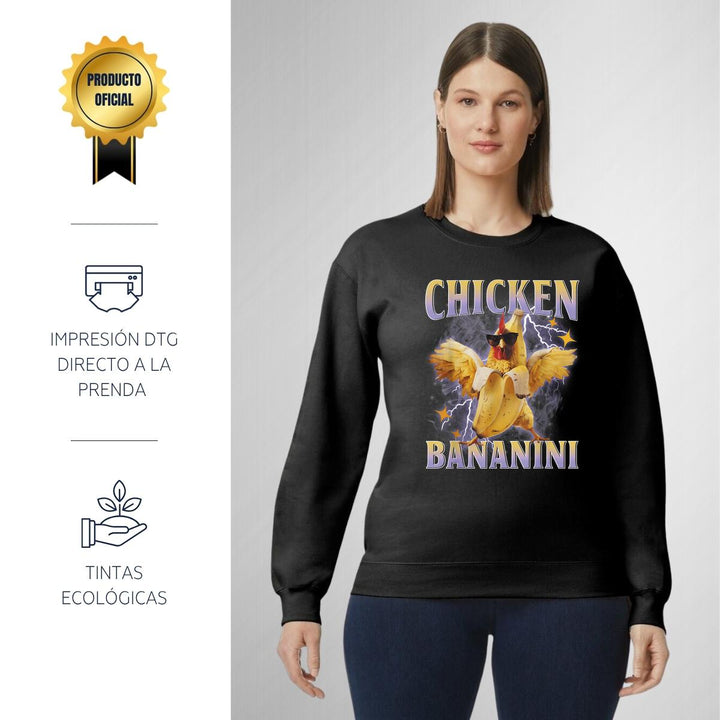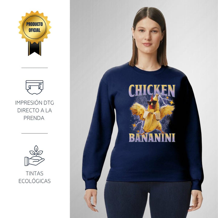 Sudadera de adulto cuello redondo sin gorro o capucha, para mujer nueva, diseño Brainrot Chicken Banana original impreso con tecnología DTG (directo a la prenda) tacto cero, uso casual o deportiva, 50% algodón y 50% poliéster, estructura sin costura en los costados con ajuste clásico. Colores de sudadera: Negro, Blanco, Azul Marino, Gris.