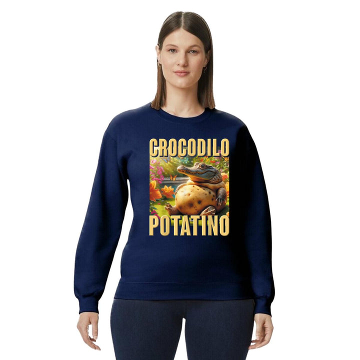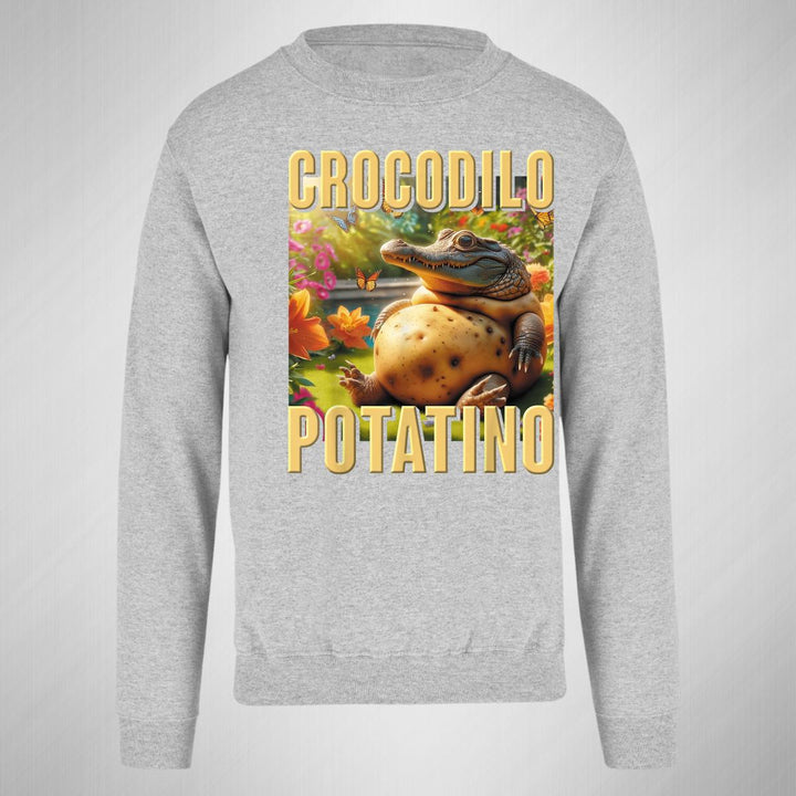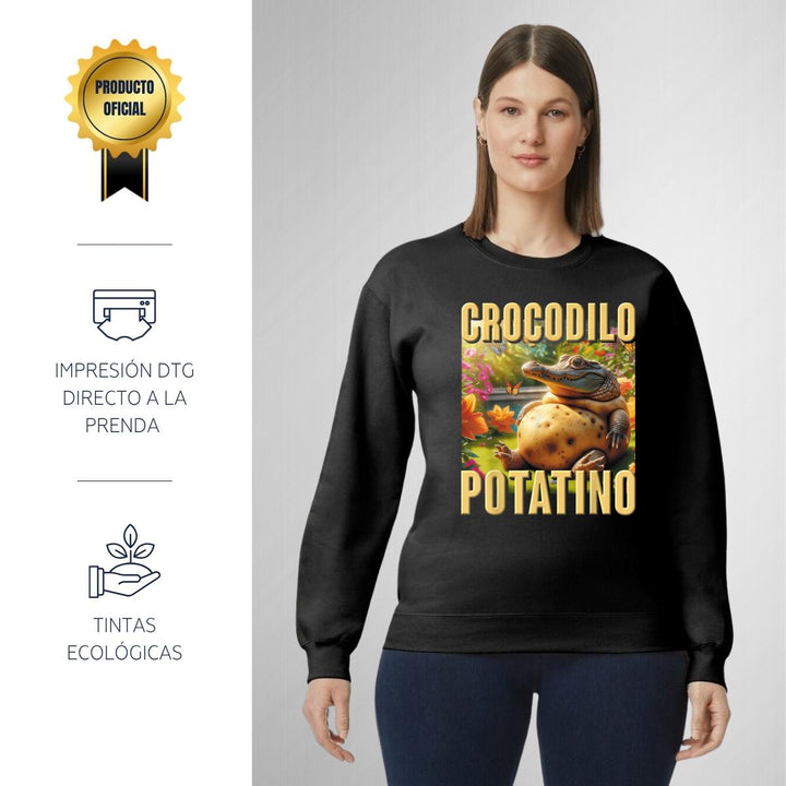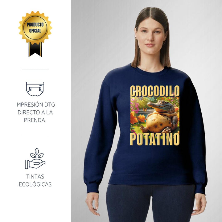 Sudadera de adulto cuello redondo sin gorro o capucha, para mujer nueva, diseño Brainrot Crocodilo Potatino original impreso con tecnología DTG (directo a la prenda) tacto cero, uso casual o deportiva, 50% algodón y 50% poliéster, estructura sin costura en los costados con ajuste clásico. Colores de sudadera: Negro, Blanco, Azul Marino, Gris.
