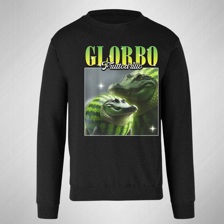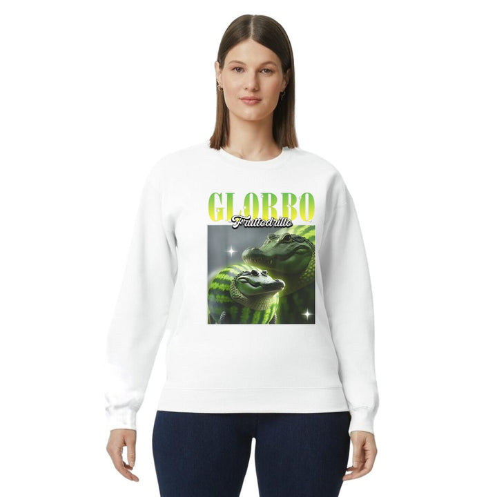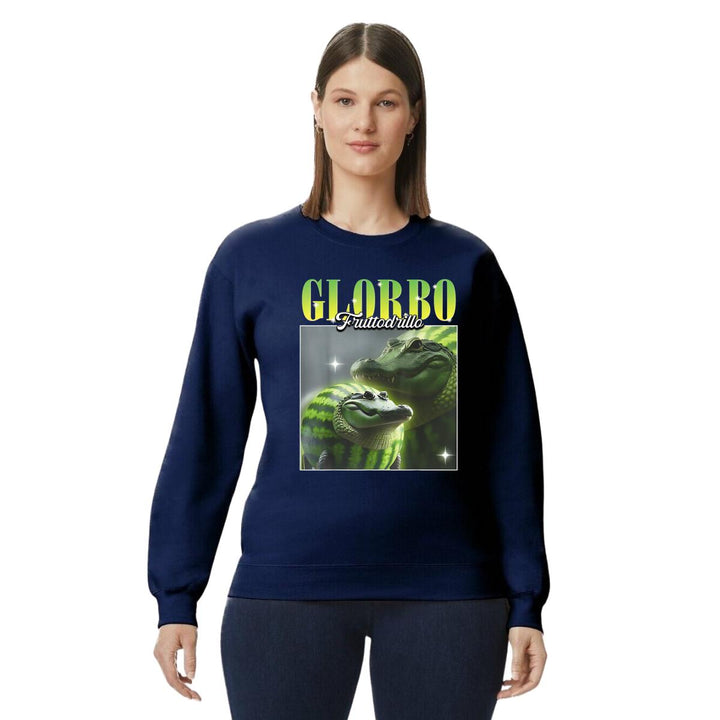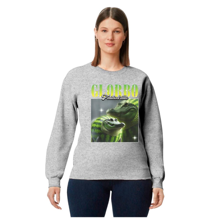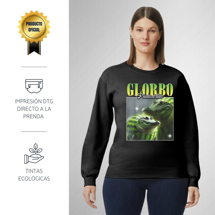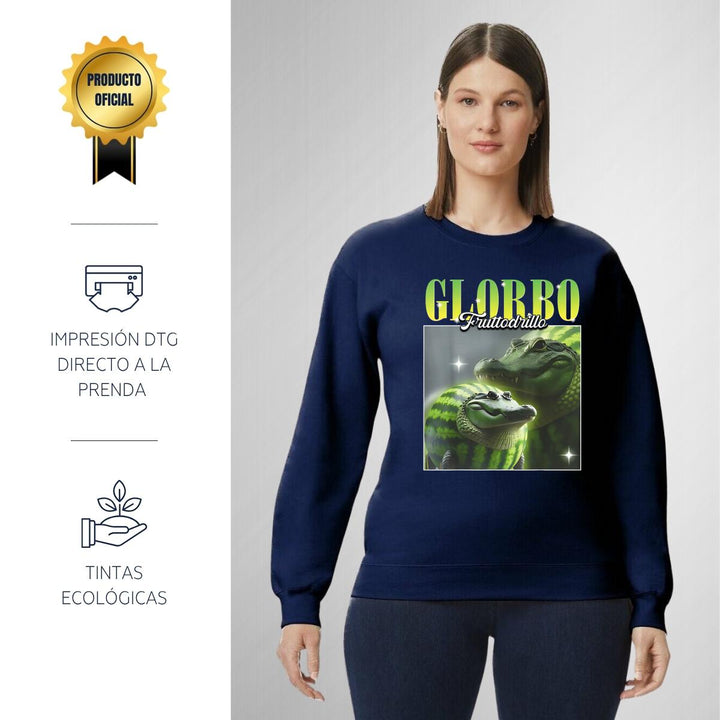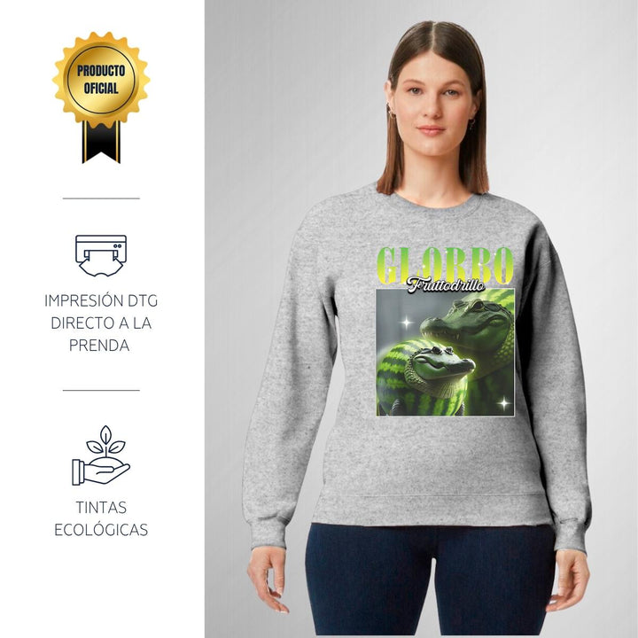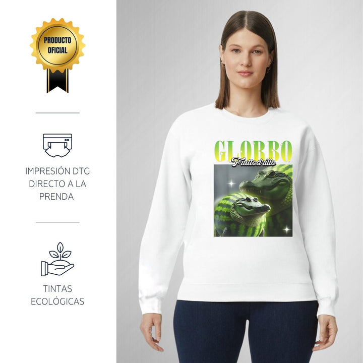 Sudadera de adulto cuello redondo sin gorro o capucha, para mujer nueva, diseño Brainrot Glorbo Fruttodrillo original impreso con tecnología DTG (directo a la prenda) tacto cero, uso casual o deportiva, 50% algodón y 50% poliéster, estructura sin costura en los costados con ajuste clásico. Colores de sudadera: Negro, Blanco, Azul Marino, Gris.