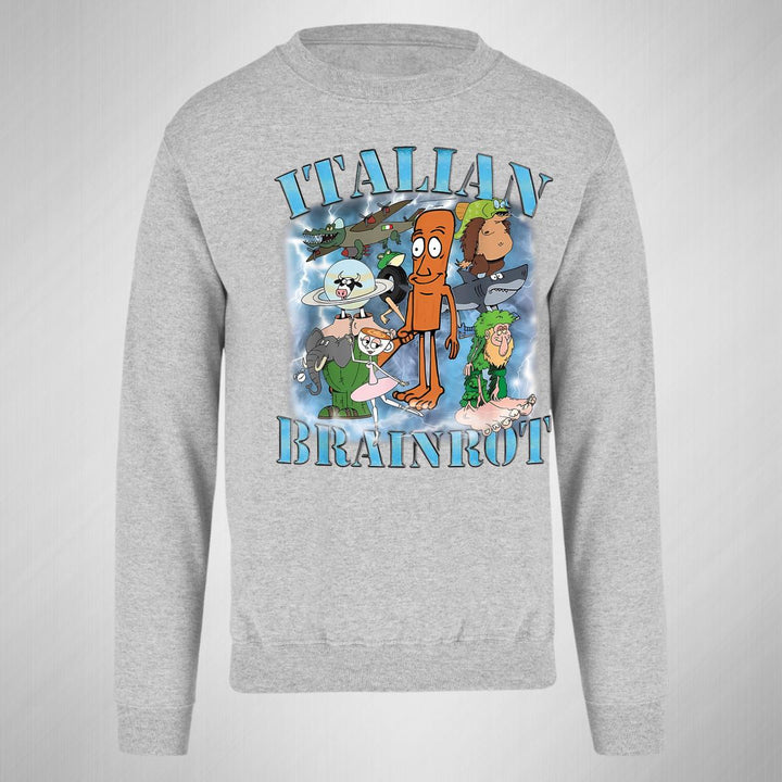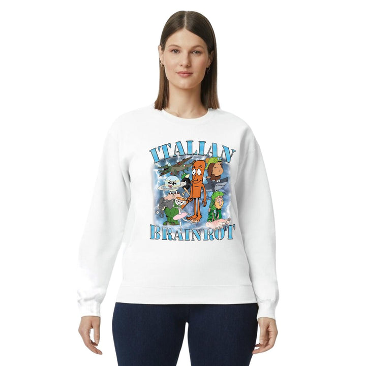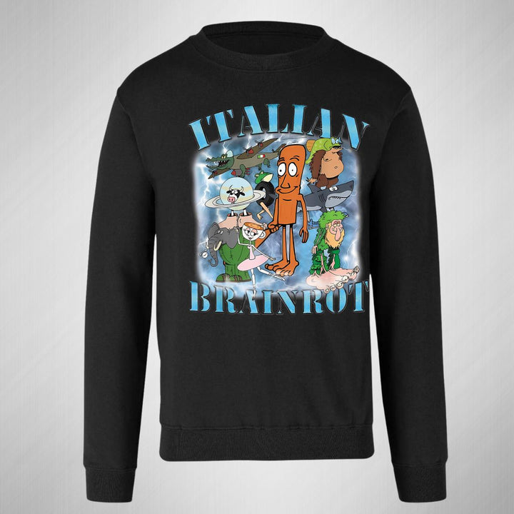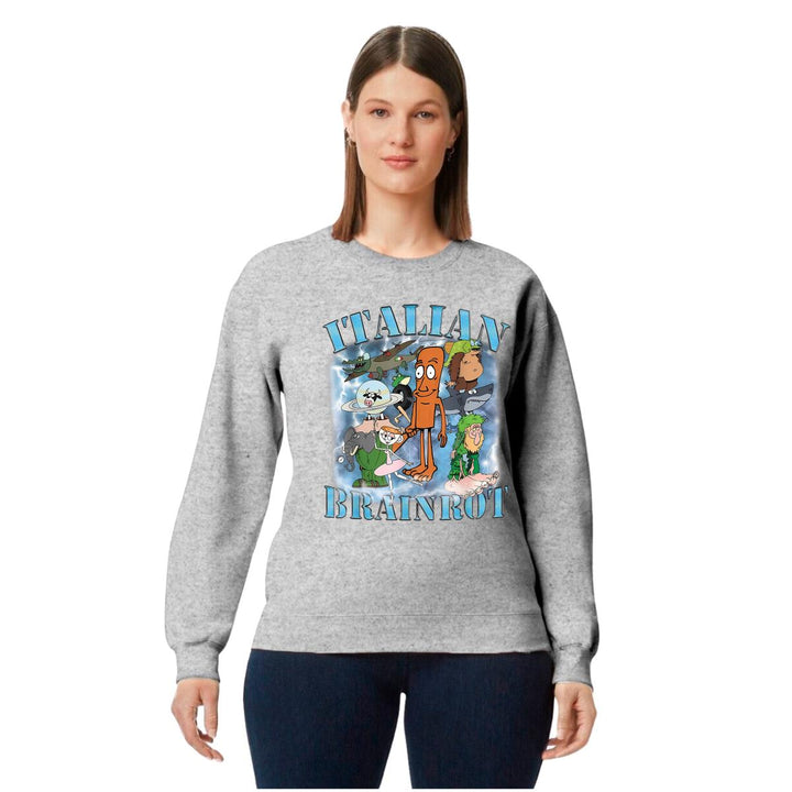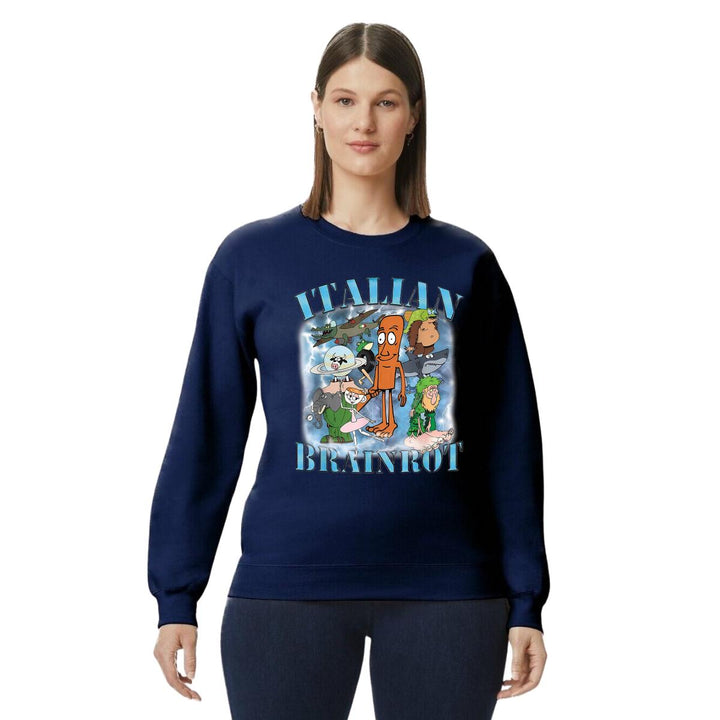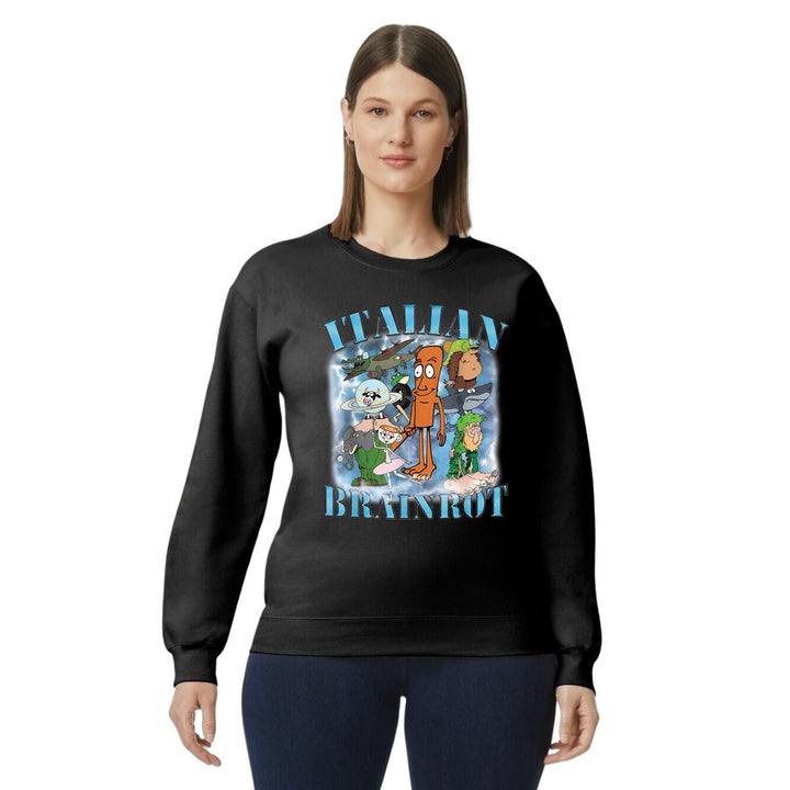 Sudadera de adulto cuello redondo sin gorro o capucha, para mujer nueva, diseño Brainrot Italianos original impreso con tecnología DTG (directo a la prenda) tacto cero, uso casual o deportiva, 50% algodón y 50% poliéster, estructura sin costura en los costados con ajuste clásico. Colores de sudadera: Negro, Blanco, Azul Marino, Gris.