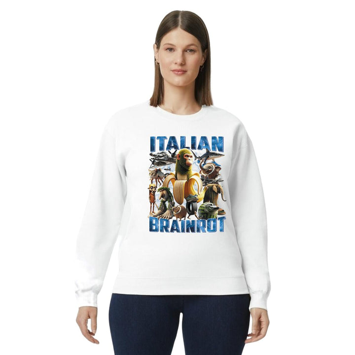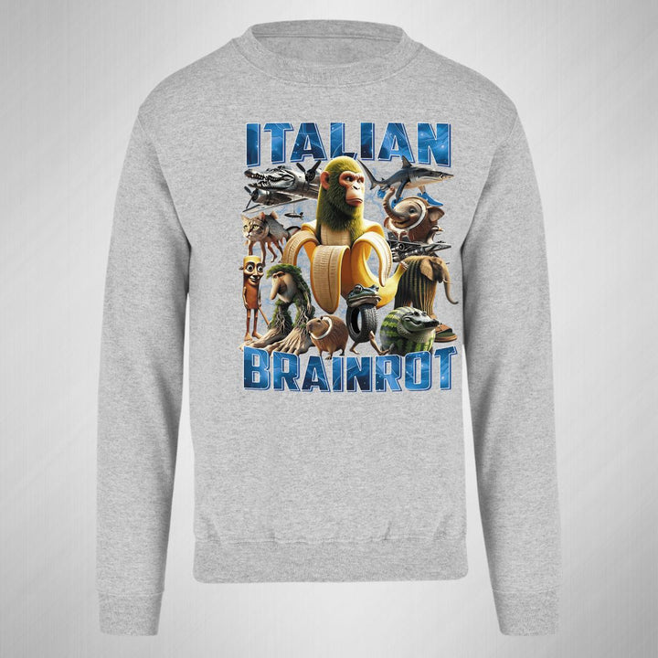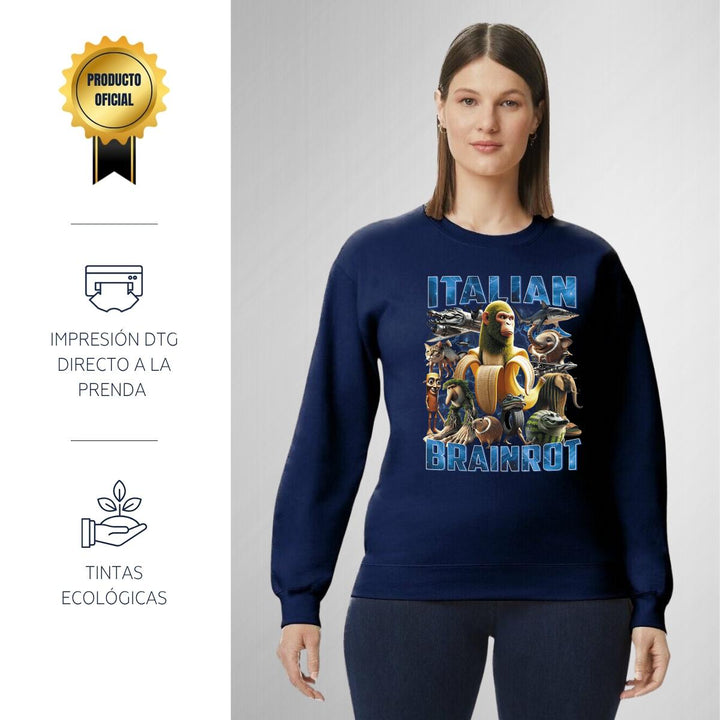 Sudadera de adulto cuello redondo sin gorro o capucha, para mujer nueva, diseño Brainrot Italianos original impreso con tecnología DTG (directo a la prenda) tacto cero, uso casual o deportiva, 50% algodón y 50% poliéster, estructura sin costura en los costados con ajuste clásico. Colores de sudadera: Negro, Blanco, Azul Marino, Gris.