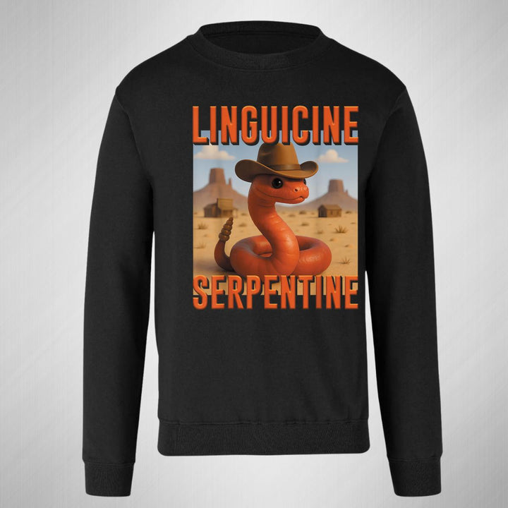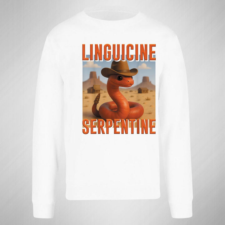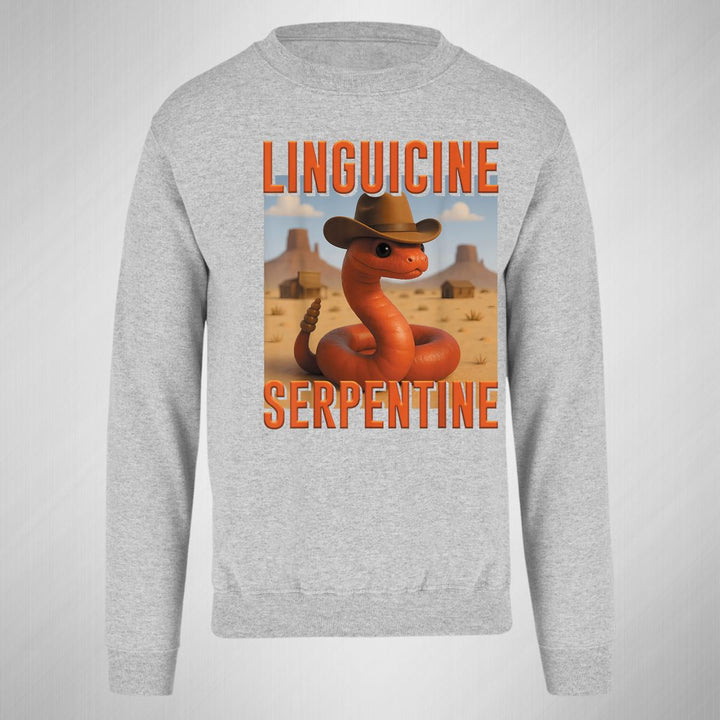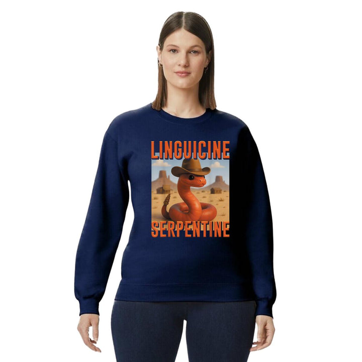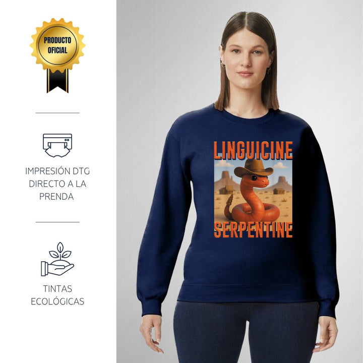 Sudadera de adulto cuello redondo sin gorro o capucha, para mujer nueva, diseño Brainrot Linguicine Serpentine original impreso con tecnología DTG (directo a la prenda) tacto cero, uso casual o deportiva, 50% algodón y 50% poliéster, estructura sin costura en los costados con ajuste clásico. Colores de sudadera: Negro, Blanco, Azul Marino, Gris.