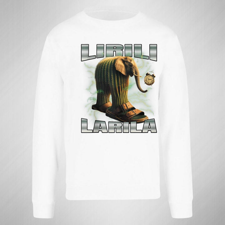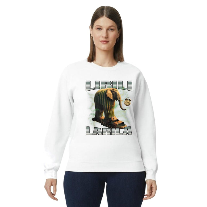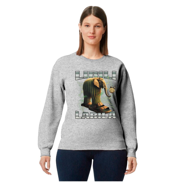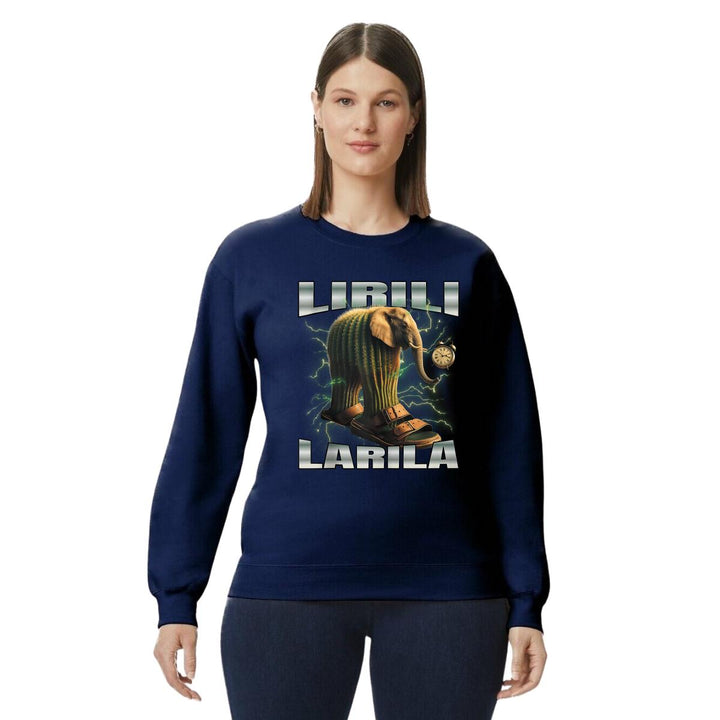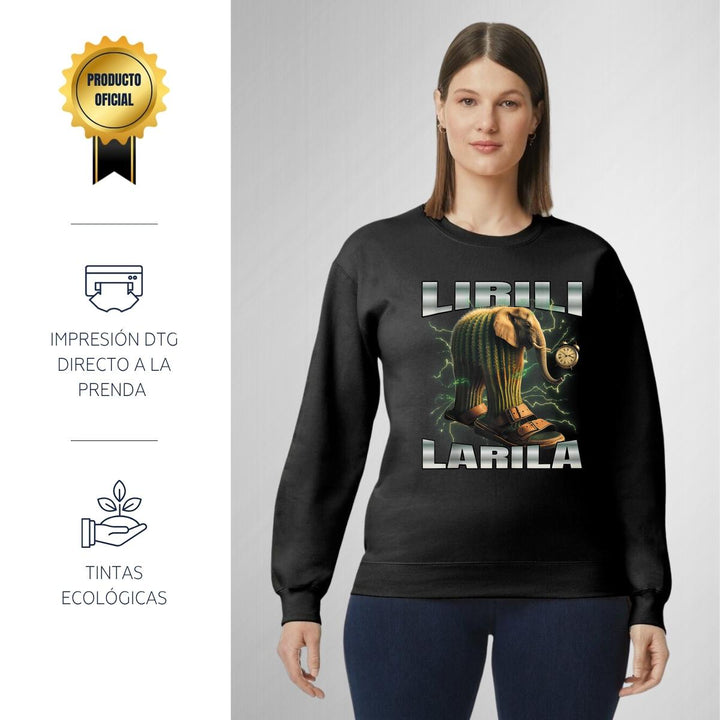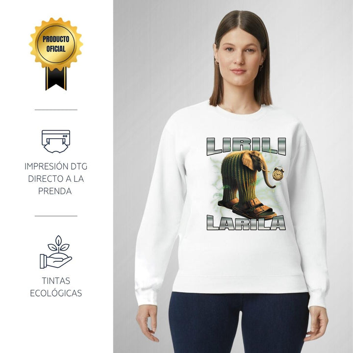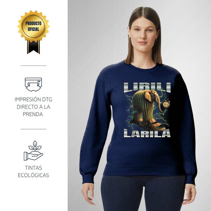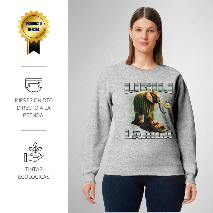 Sudadera de adulto cuello redondo sin gorro o capucha, para mujer nueva, diseño Brainrot Lirili Larila original impreso con tecnología DTG (directo a la prenda) tacto cero, uso casual o deportiva, 50% algodón y 50% poliéster, estructura sin costura en los costados con ajuste clásico. Colores de sudadera: Negro, Blanco, Azul Marino, Gris.