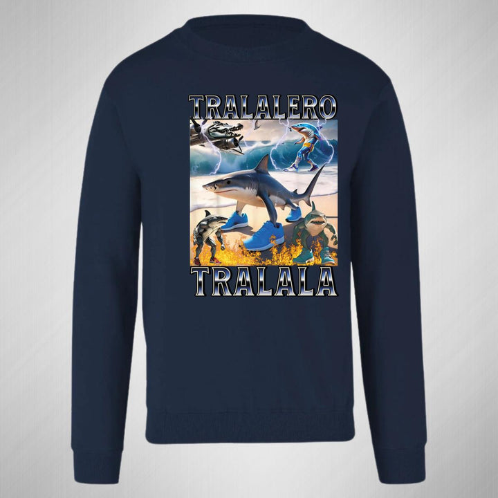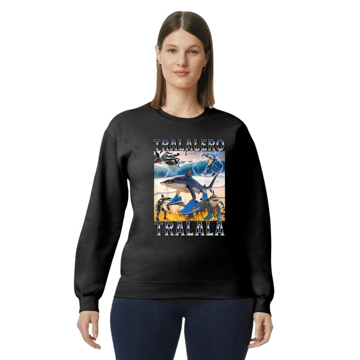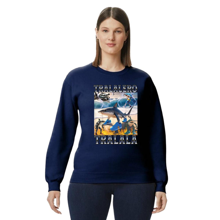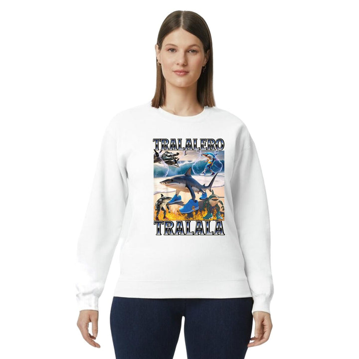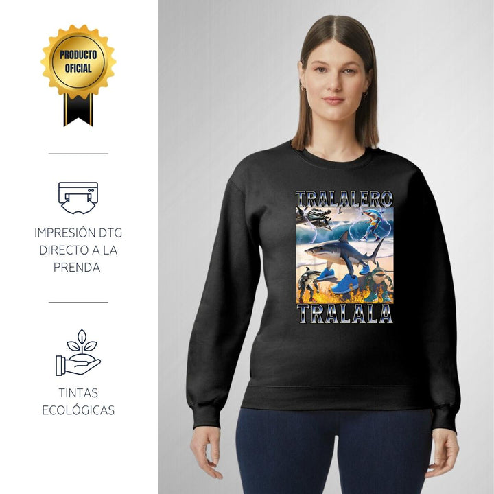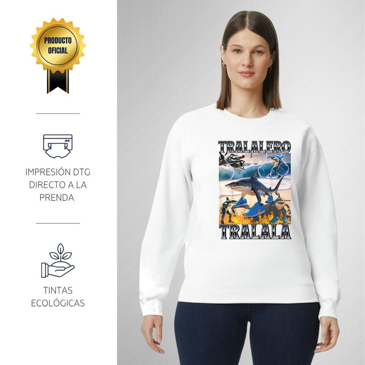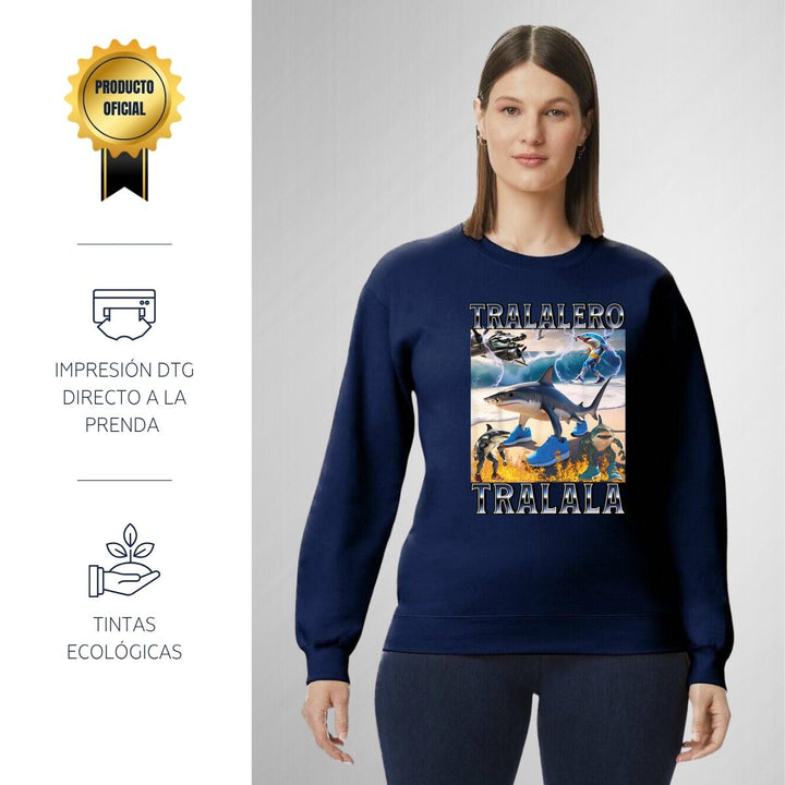 Sudadera de adulto cuello redondo sin gorro o capucha, para mujer nueva, diseño Brainrot Tralalero Tralala original impreso con tecnología DTG (directo a la prenda) tacto cero, uso casual o deportiva, 50% algodón y 50% poliéster, estructura sin costura en los costados con ajuste clásico. Colores de sudadera: Negro, Blanco, Azul Marino, Gris.
