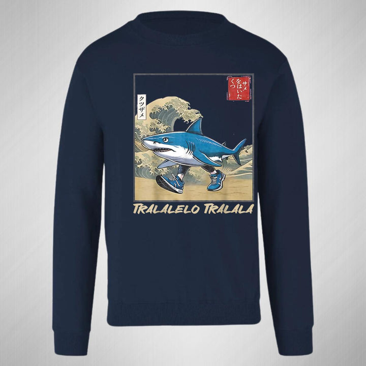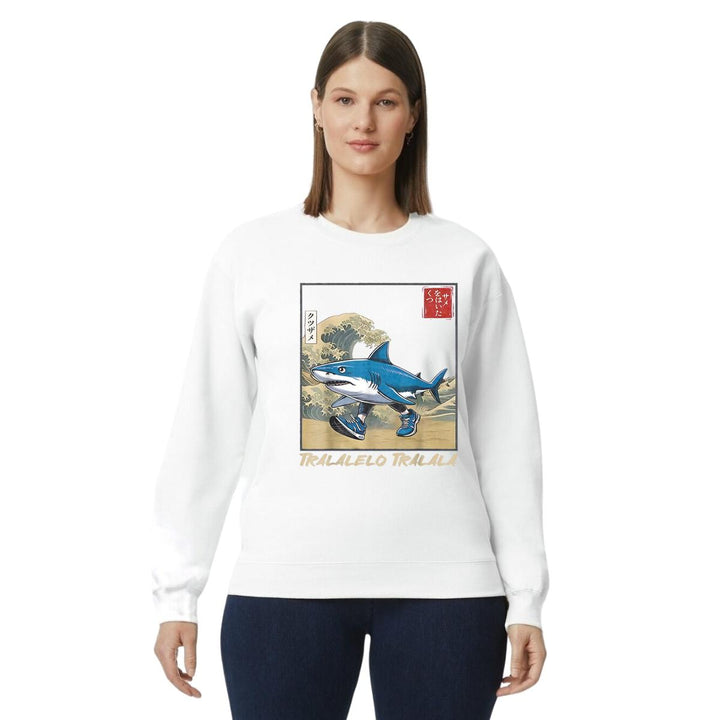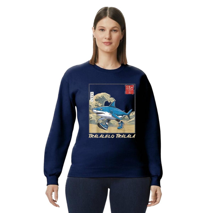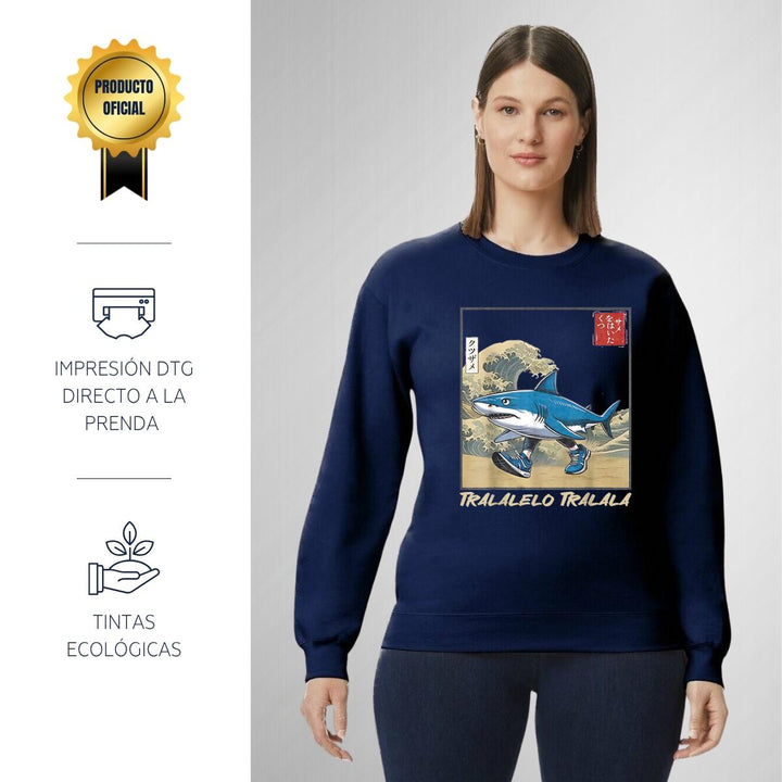 Sudadera de adulto cuello redondo sin gorro o capucha, para mujer nueva, diseño Brainrot Tralalero Tralala original impreso con tecnología DTG (directo a la prenda) tacto cero, uso casual o deportiva, 50% algodón y 50% poliéster, estructura sin costura en los costados con ajuste clásico. Colores de sudadera: Negro, Blanco, Azul Marino, Gris.