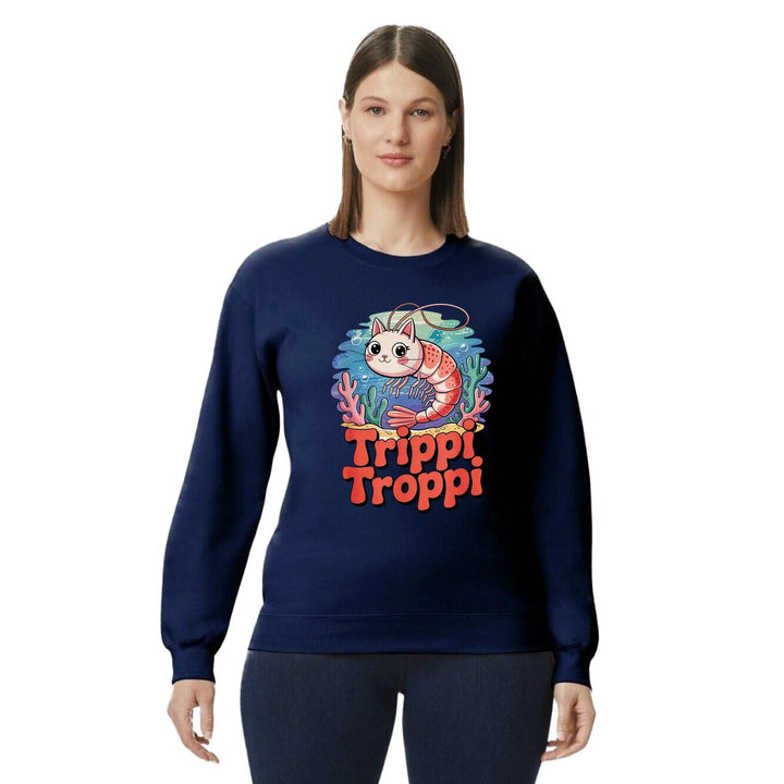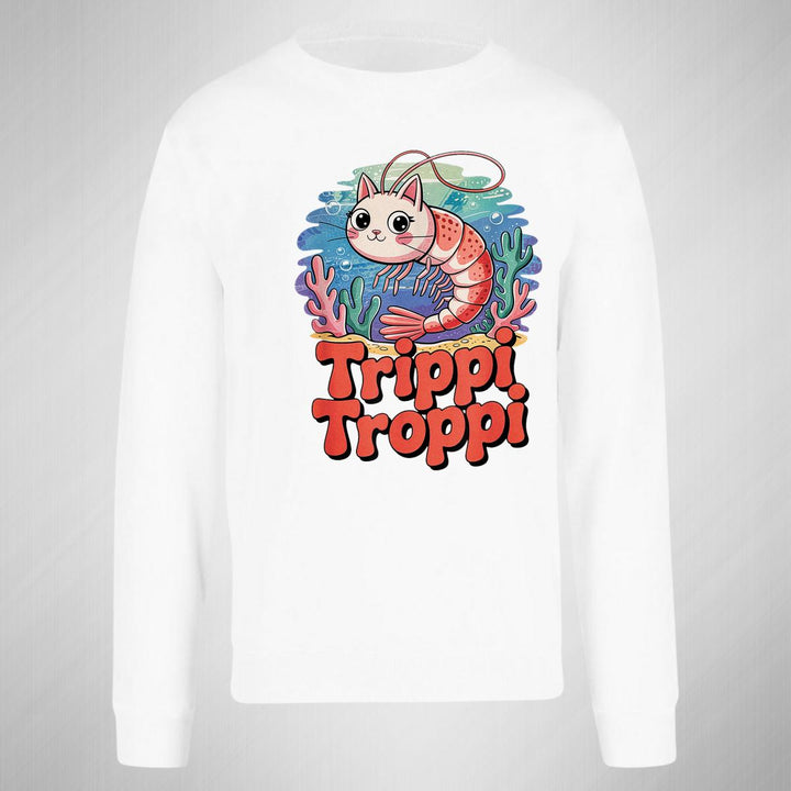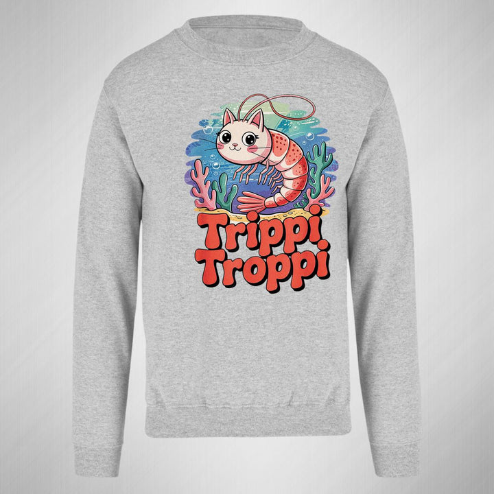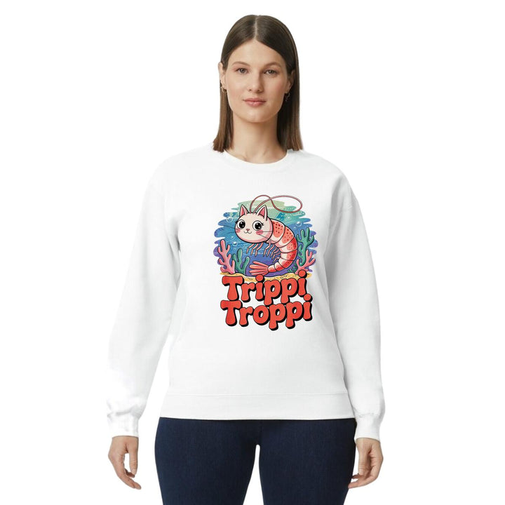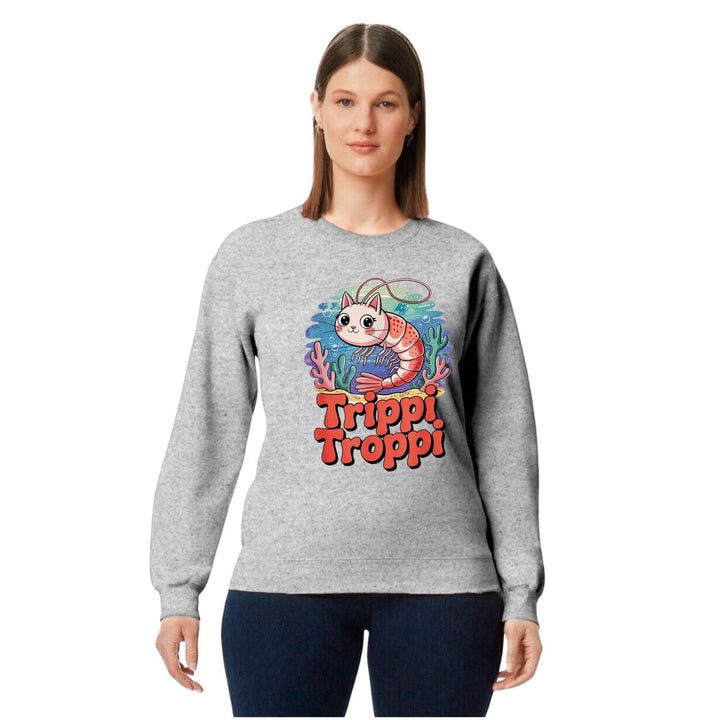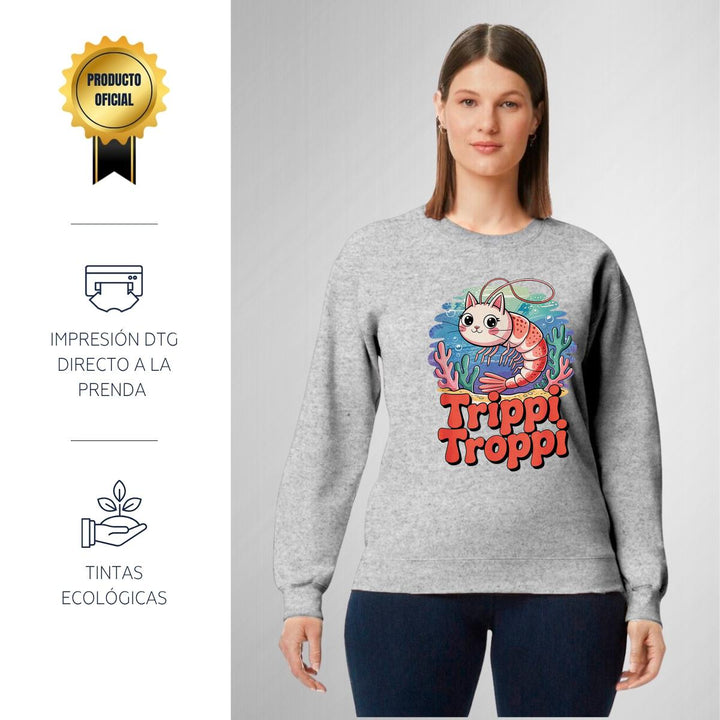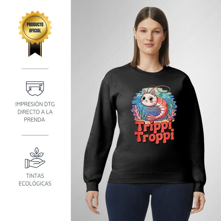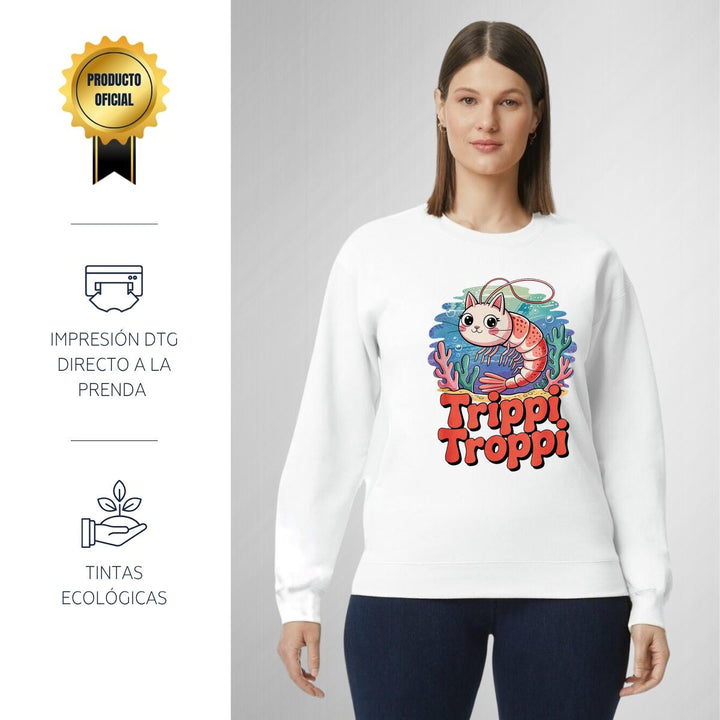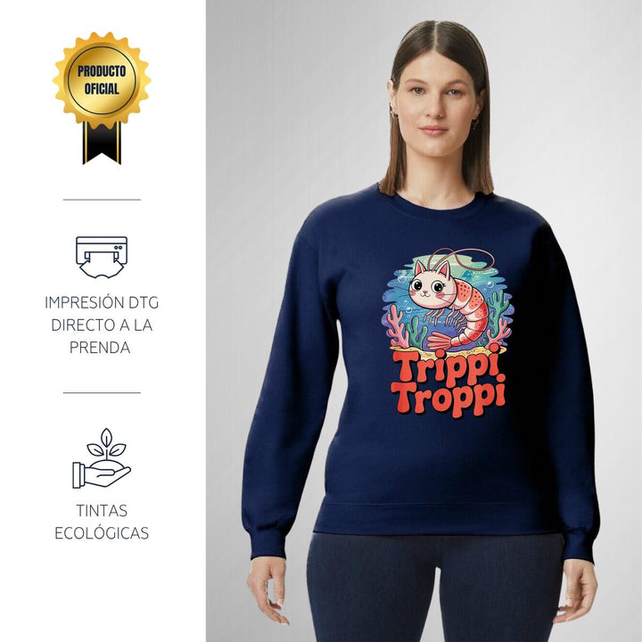 Sudadera de adulto cuello redondo sin gorro o capucha, para mujer nueva, diseño Brainrot Trippi Troppi original impreso con tecnología DTG (directo a la prenda) tacto cero, uso casual o deportiva, 50% algodón y 50% poliéster, estructura sin costura en los costados con ajuste clásico. Colores de sudadera: Negro, Blanco, Azul Marino, Gris.