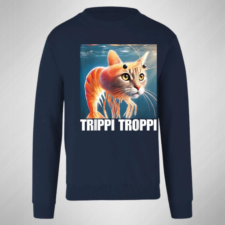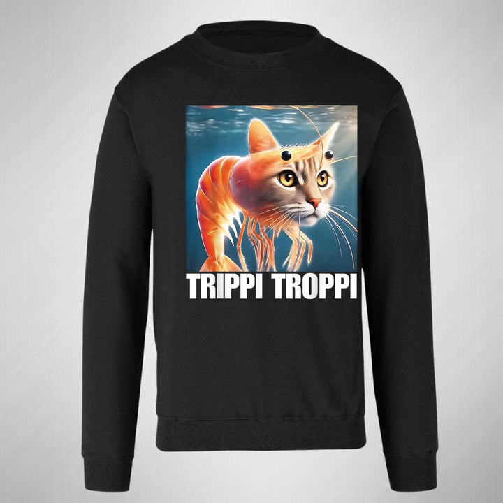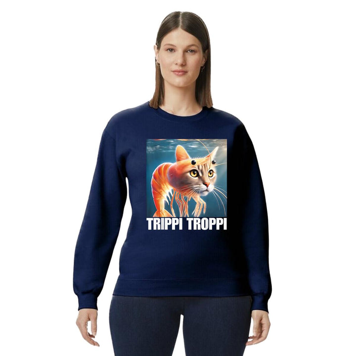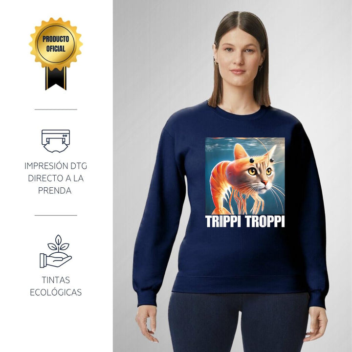 Sudadera de adulto cuello redondo sin gorro o capucha, para mujer nueva, diseño Brainrot Trippi Troppi original impreso con tecnología DTG (directo a la prenda) tacto cero, uso casual o deportiva, 50% algodón y 50% poliéster, estructura sin costura en los costados con ajuste clásico. Colores de sudadera: Negro, Azul Marino.