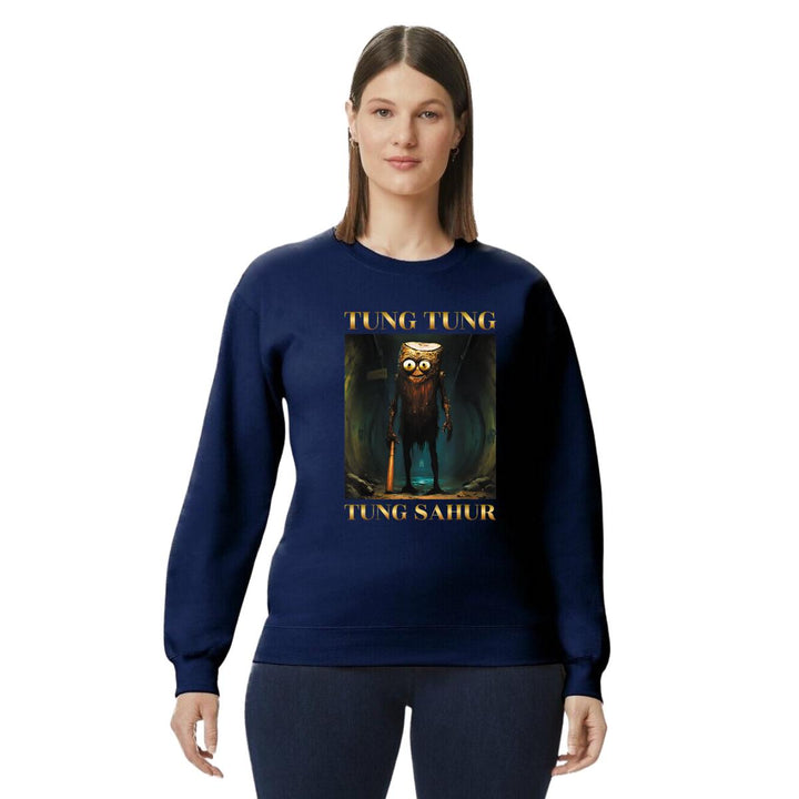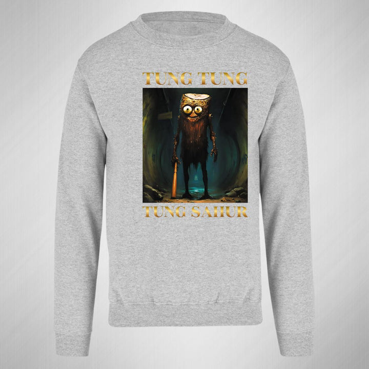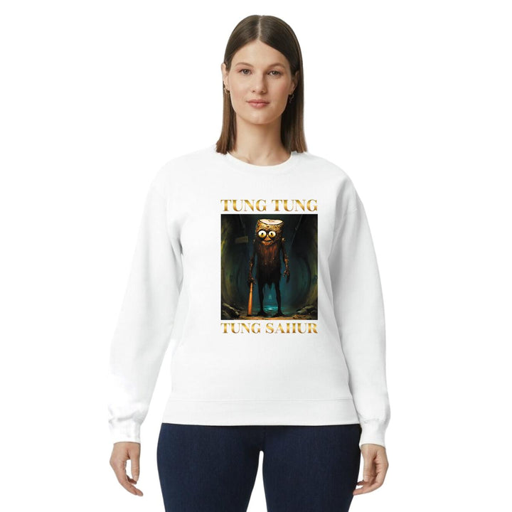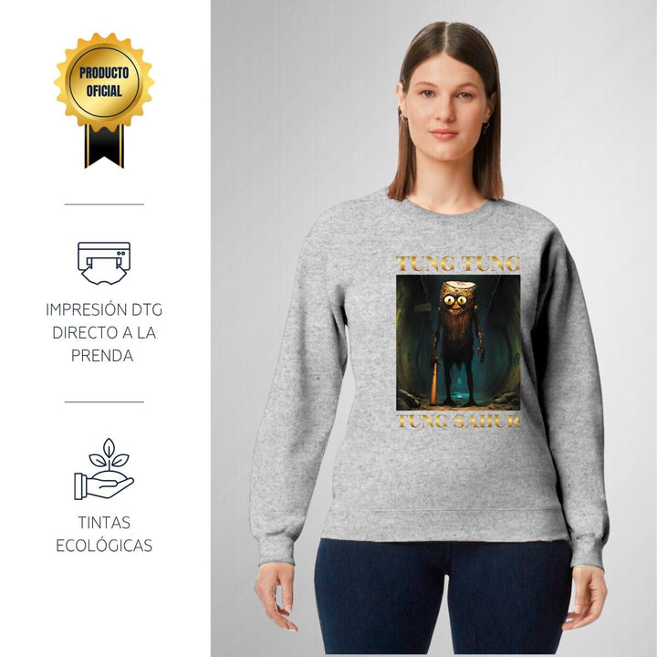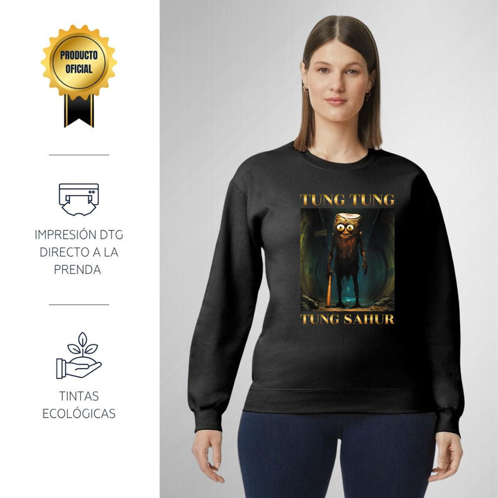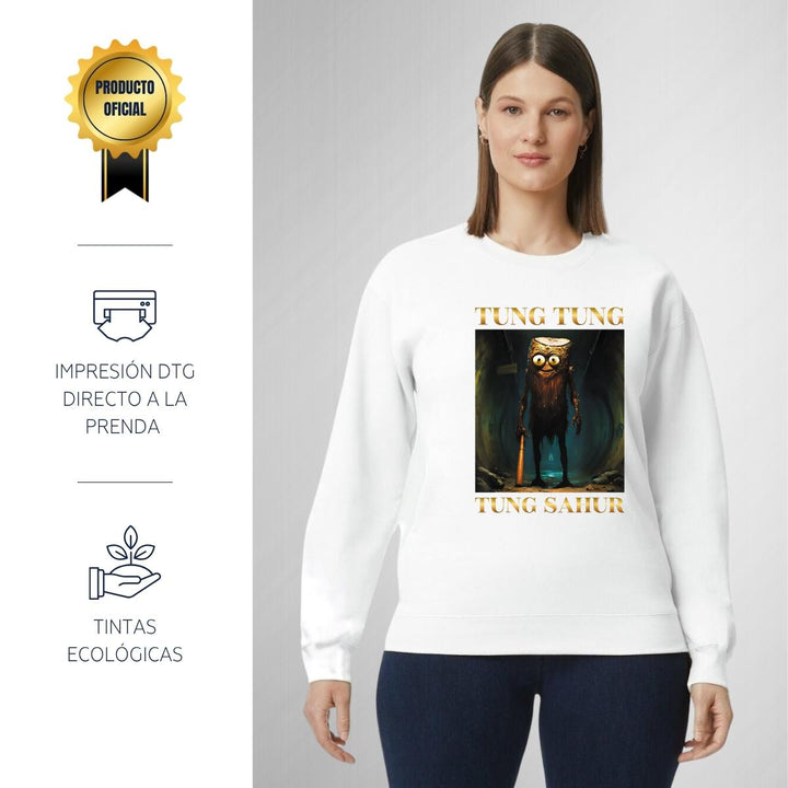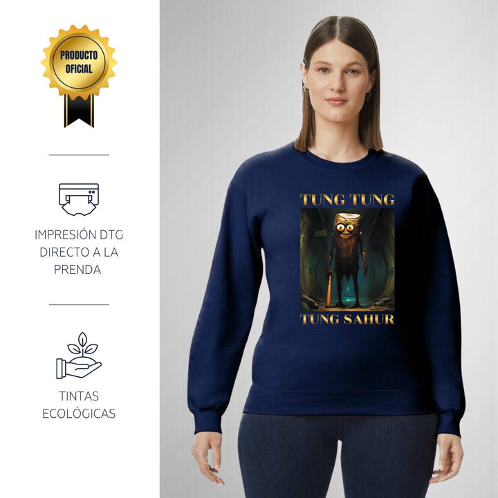 Sudadera de adulto cuello redondo sin gorro o capucha, para mujer nueva, diseño Brainrot Tung Tung Tung Sahur original impreso con tecnología DTG (directo a la prenda) tacto cero, uso casual o deportiva, 50% algodón y 50% poliéster, estructura sin costura en los costados con ajuste clásico. Colores de sudadera: Negro, Blanco, Azul Marino, Gris.