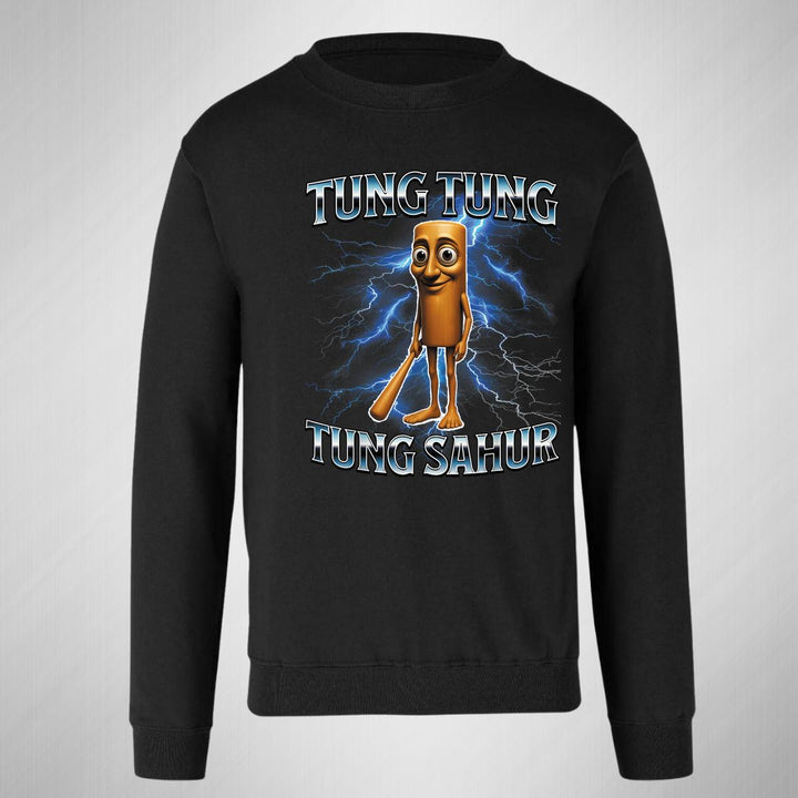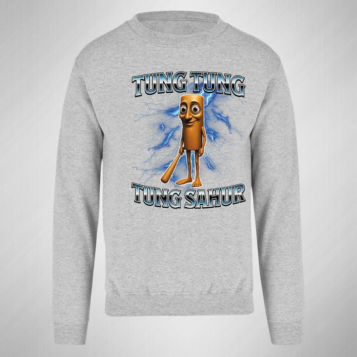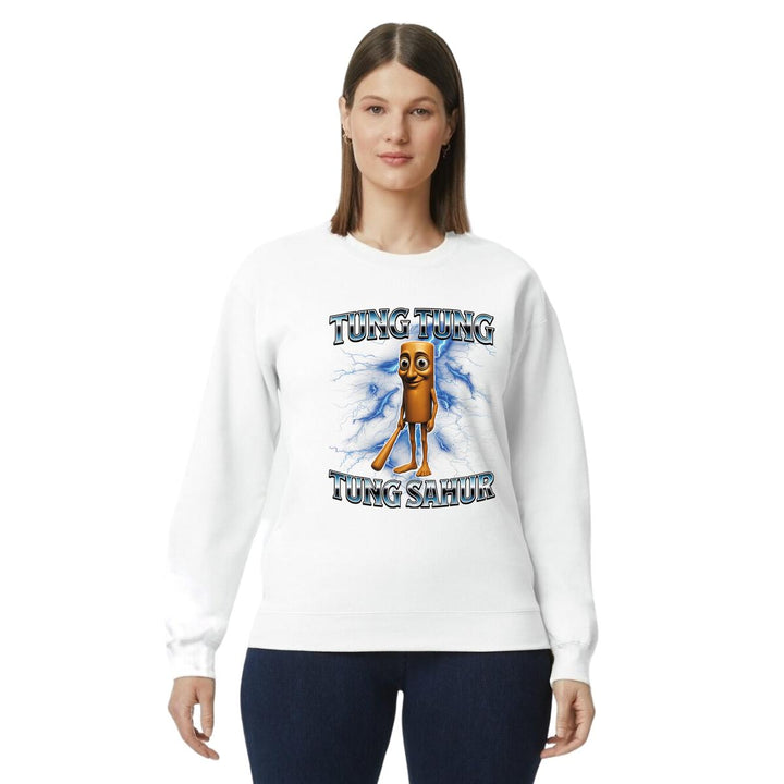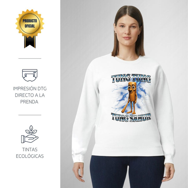 Sudadera de adulto cuello redondo sin gorro o capucha, para mujer nueva, diseño Brainrot Tung Tung Tung Sahur original impreso con tecnología DTG (directo a la prenda) tacto cero, uso casual o deportiva, 50% algodón y 50% poliéster, estructura sin costura en los costados con ajuste clásico. Colores de sudadera: Negro, Blanco, Azul Marino, Gris.