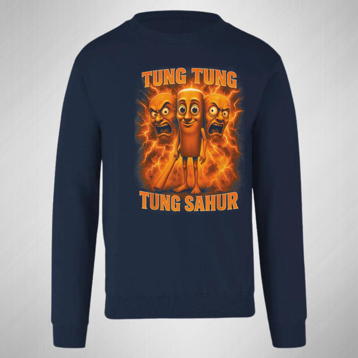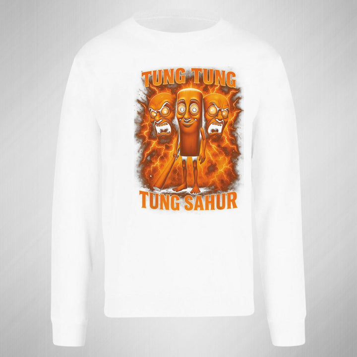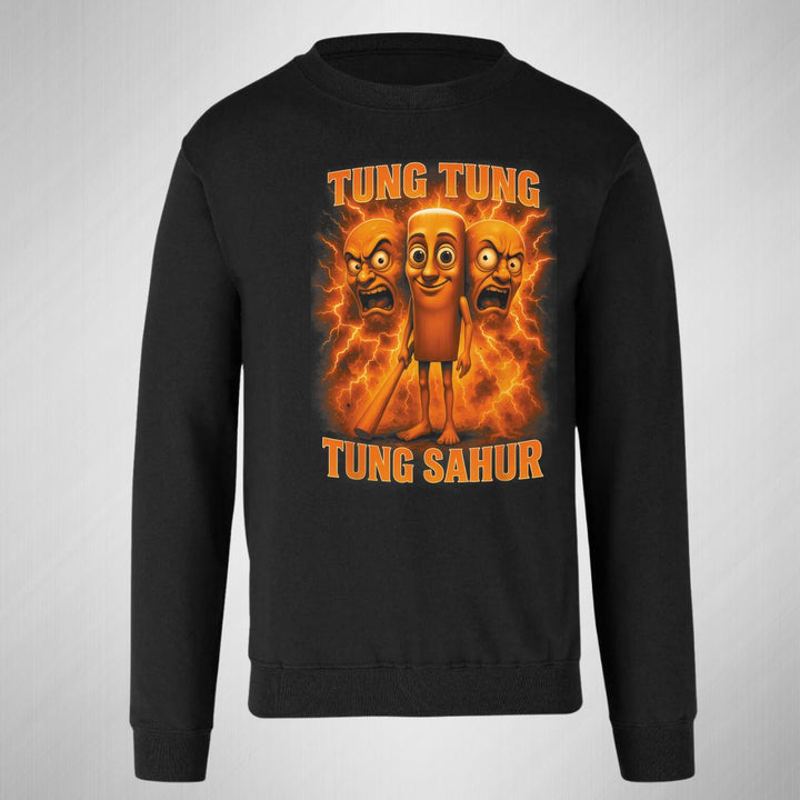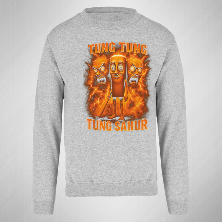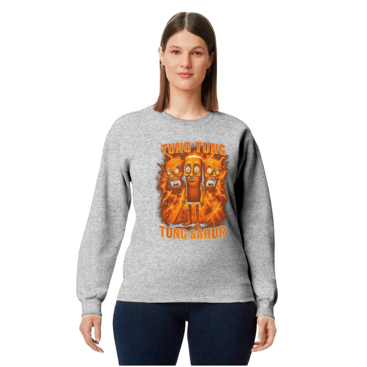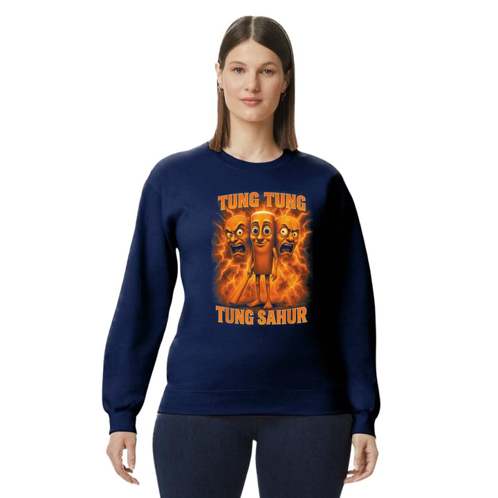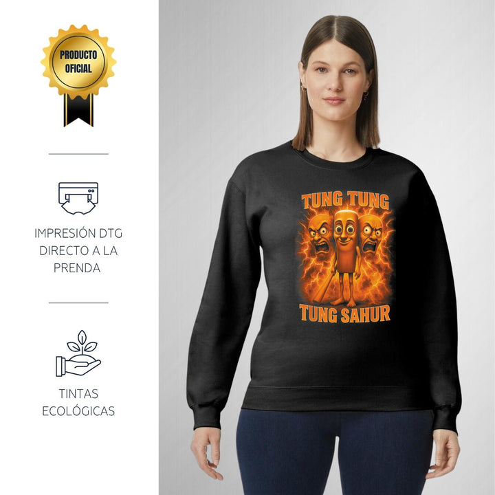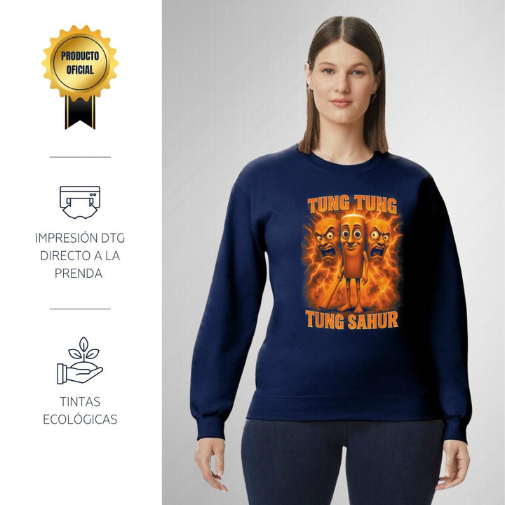 Sudadera de adulto cuello redondo sin gorro o capucha, para mujer nueva, diseño Brainrot Tung Tung Tung Sahur original impreso con tecnología DTG (directo a la prenda) tacto cero, uso casual o deportiva, 50% algodón y 50% poliéster, estructura sin costura en los costados con ajuste clásico. Colores de sudadera: Negro, Blanco, Azul Marino, Gris.