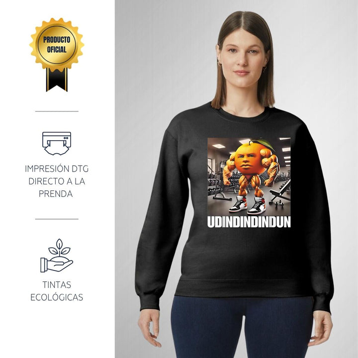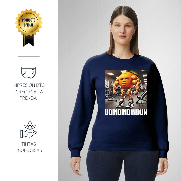 Sudadera de adulto cuello redondo sin gorro o capucha, para mujer nueva, diseño Brainrot Udindindindindung original impreso con tecnología DTG (directo a la prenda) tacto cero, uso casual o deportiva, 50% algodón y 50% poliéster, estructura sin costura en los costados con ajuste clásico. Colores de sudadera: Negro, Azul Marino.