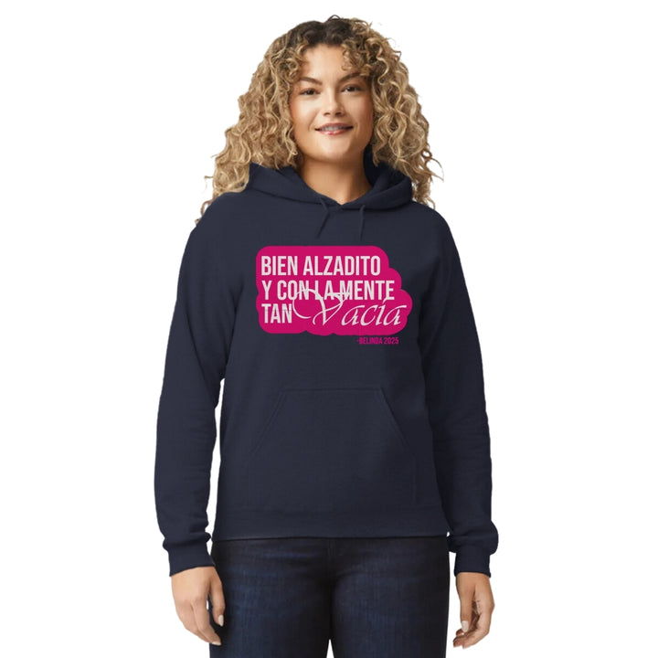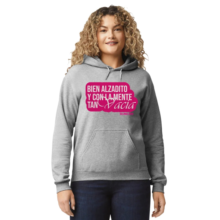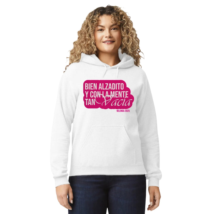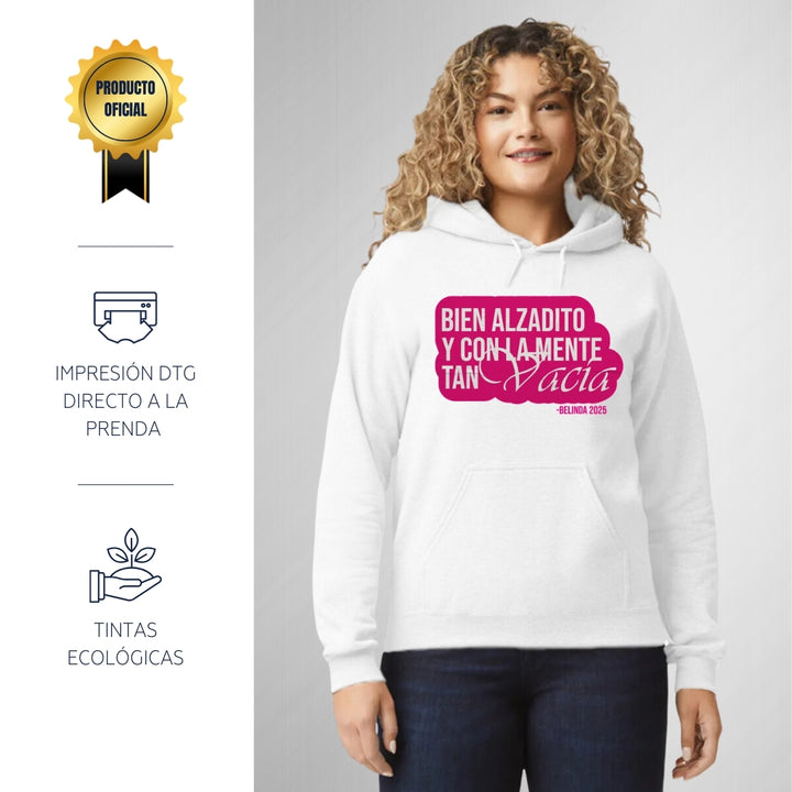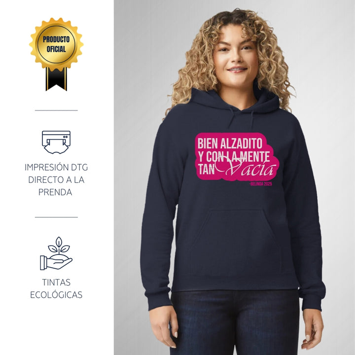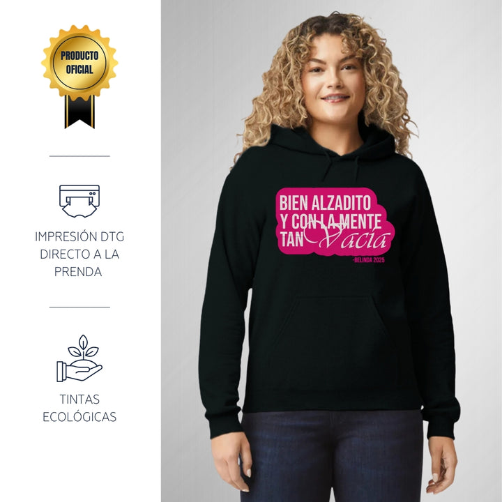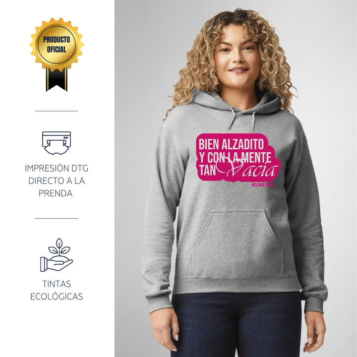 Sudadera hoodie de adulto con gorro o capucha y bolsillo frontal canguro, para mujer nueva, diseño Belinda Bien Alzadito original impreso con tecnología DTG (directo a la prenda) tacto cero, uso casual o deportiva, 50% algodón y 50% poliéster fleece pre encogido, estructura tubular con ajuste clásico. Colores de sudadera: Negro, Blanco, Azul Marino, Gris.