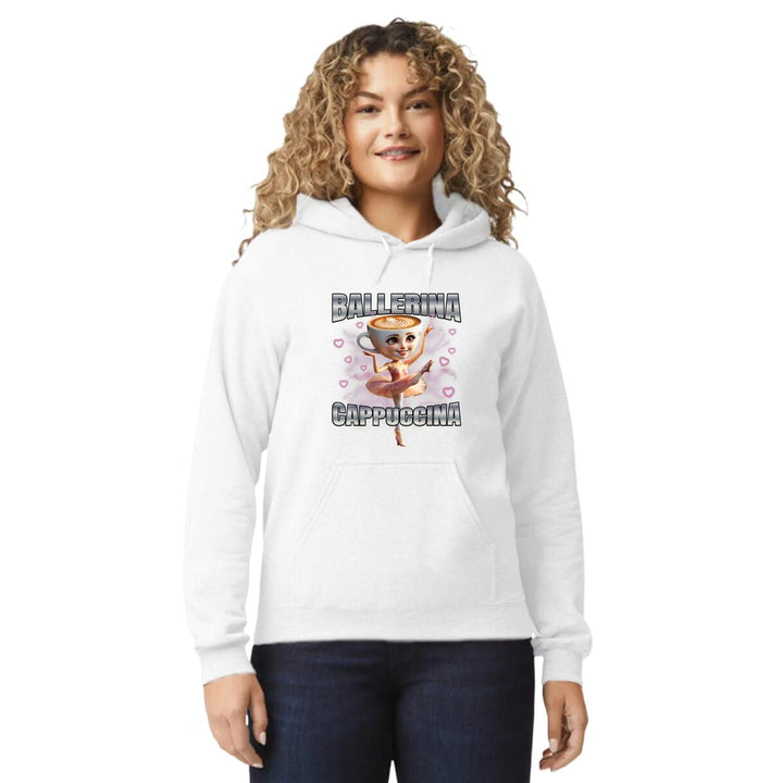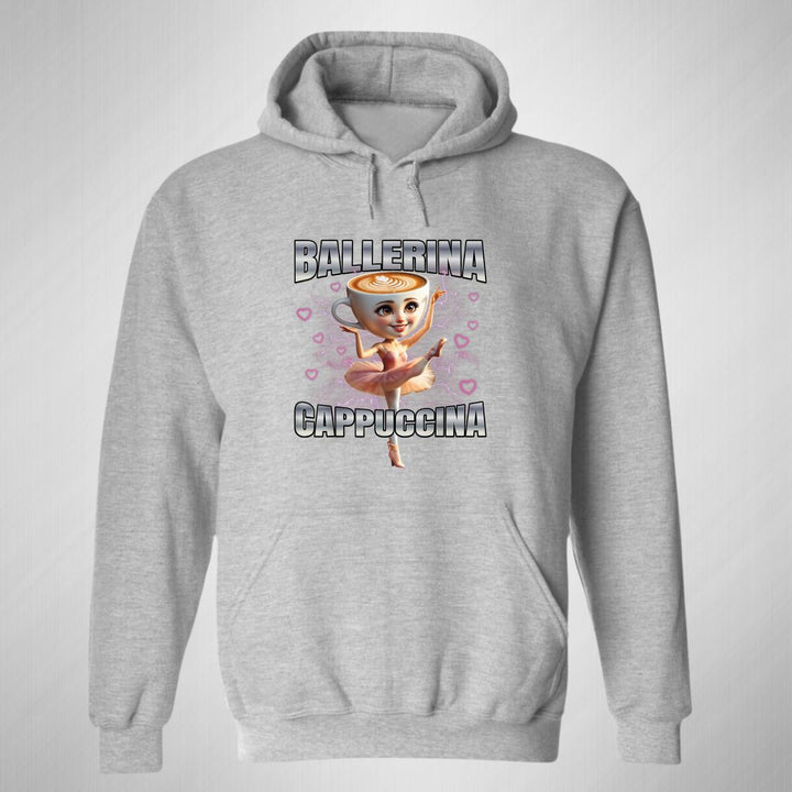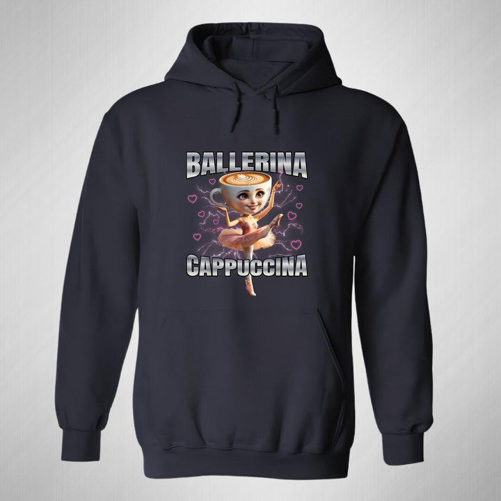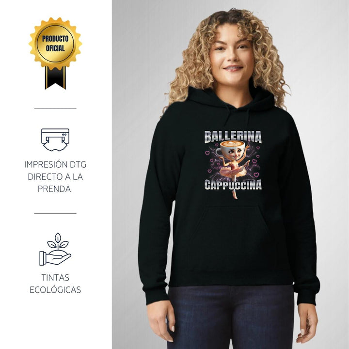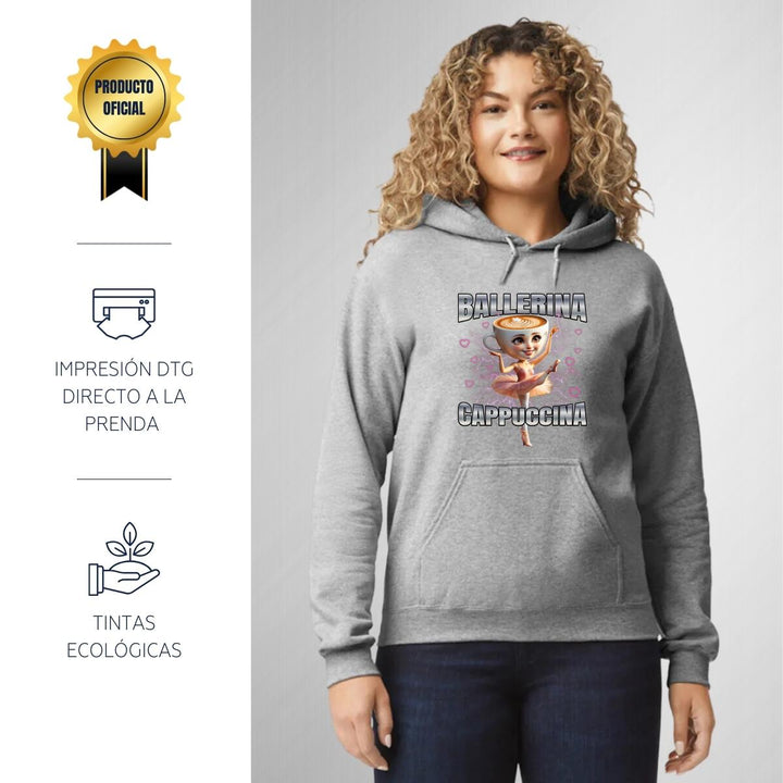 Sudadera hoodie de adulto con gorro o capucha y bolsillo frontal canguro, para mujer nueva, diseño Brainrot Ballerina Capuchina original impreso con tecnología DTG (directo a la prenda) tacto cero, uso casual o deportiva, 50% algodón y 50% poliéster fleece pre encogido, estructura tubular con ajuste clásico. Colores de sudadera: Negro, Blanco, Azul Marino, Gris.