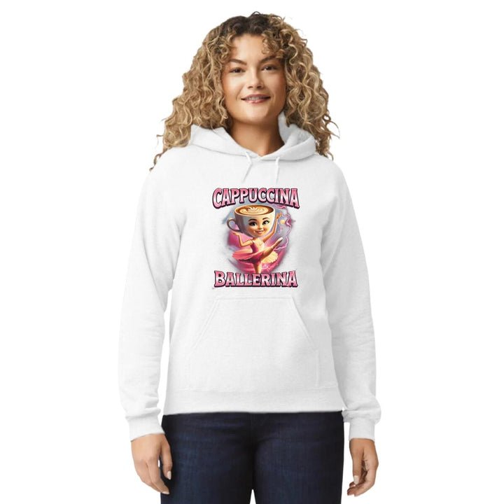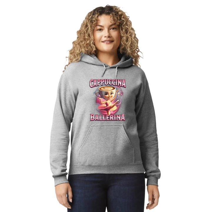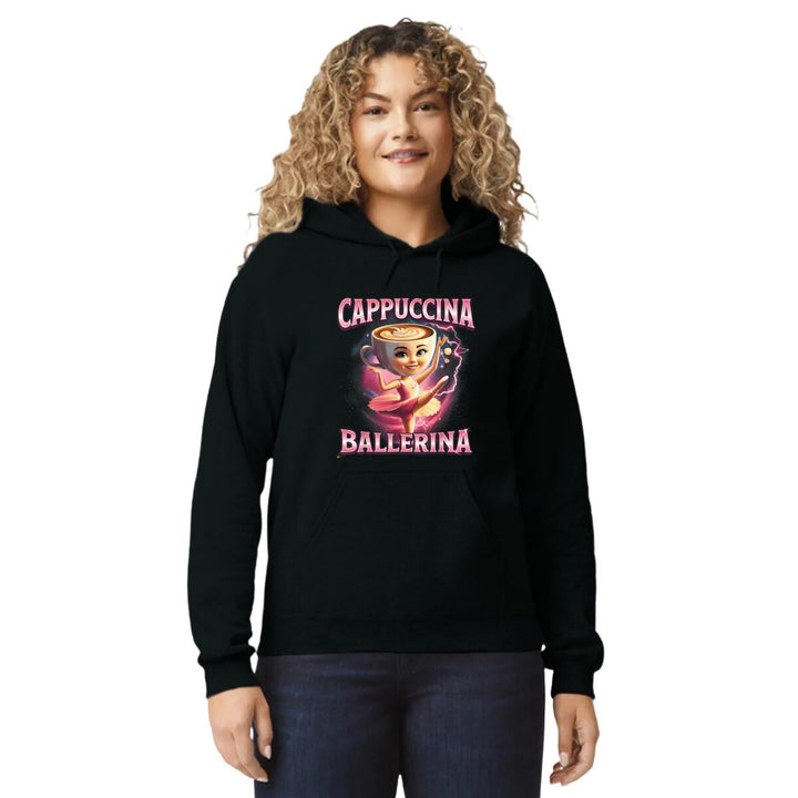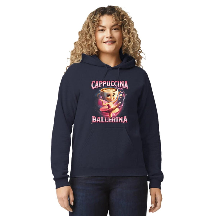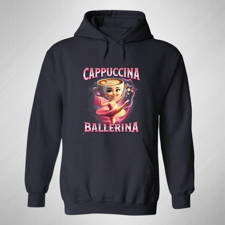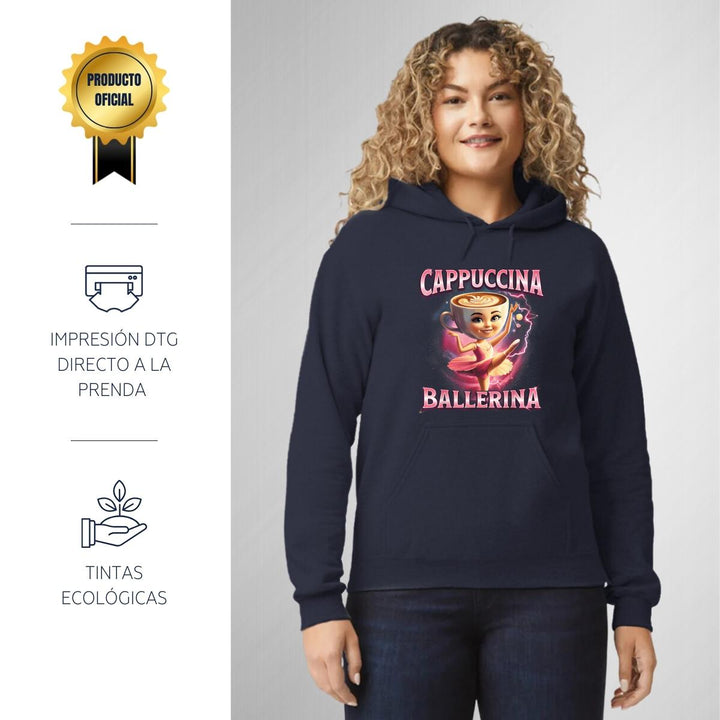 Sudadera hoodie de adulto con gorro o capucha y bolsillo frontal canguro, para mujer nueva, diseño Brainrot Ballerina Capuchina original impreso con tecnología DTG (directo a la prenda) tacto cero, uso casual o deportiva, 50% algodón y 50% poliéster fleece pre encogido, estructura tubular con ajuste clásico. Colores de sudadera: Negro, Blanco, Azul Marino, Gris.