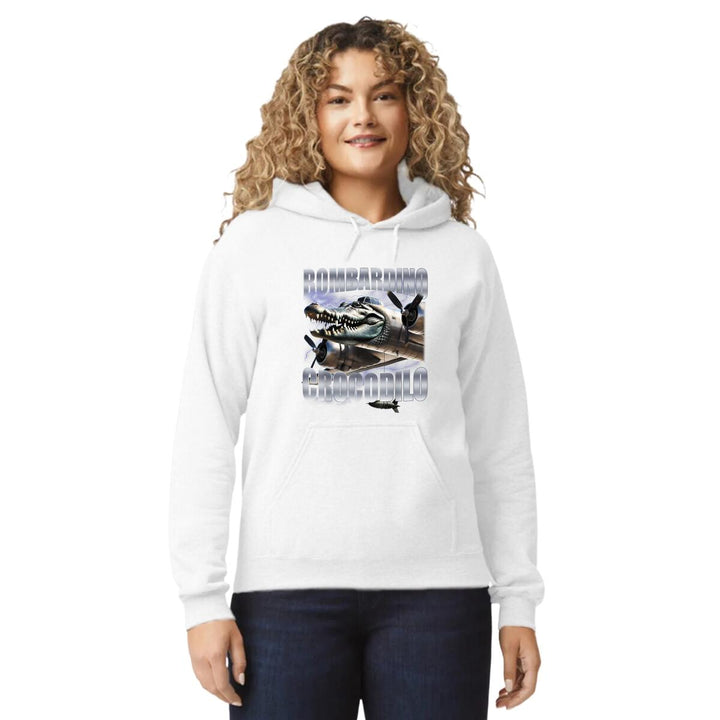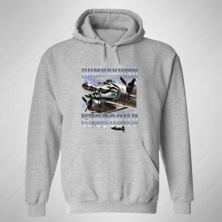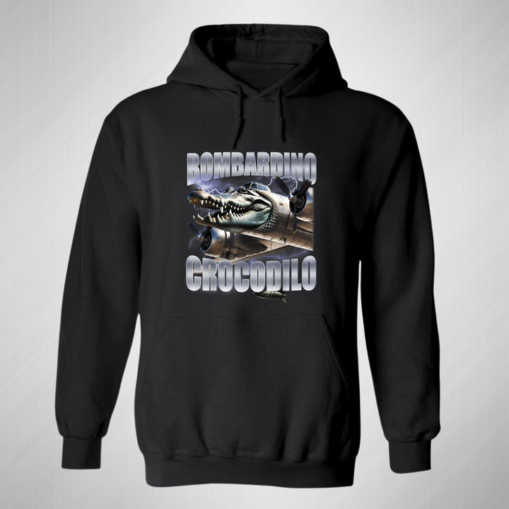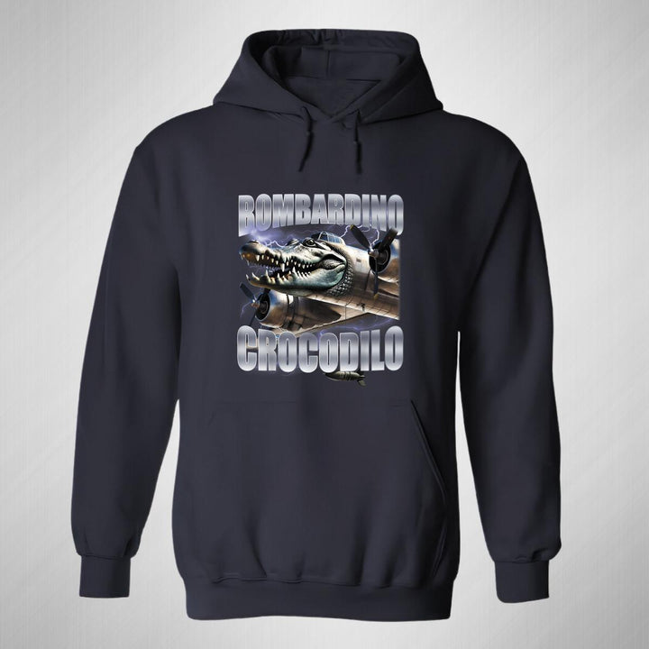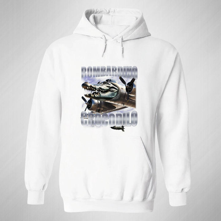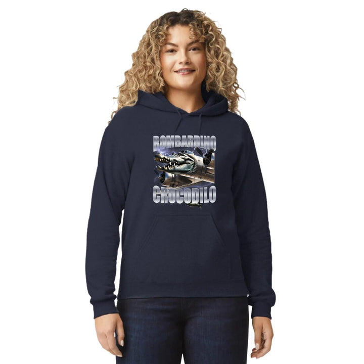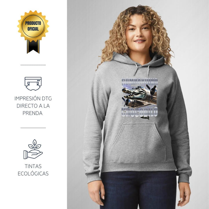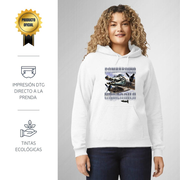 Sudadera hoodie de adulto con gorro o capucha y bolsillo frontal canguro, para mujer nueva, diseño Brainrot Bombardino Cocodrilo original impreso con tecnología DTG (directo a la prenda) tacto cero, uso casual o deportiva, 50% algodón y 50% poliéster fleece pre encogido, estructura tubular con ajuste clásico. Colores de sudadera: Negro, Blanco, Azul Marino, Gris.