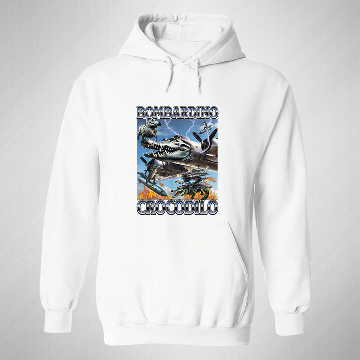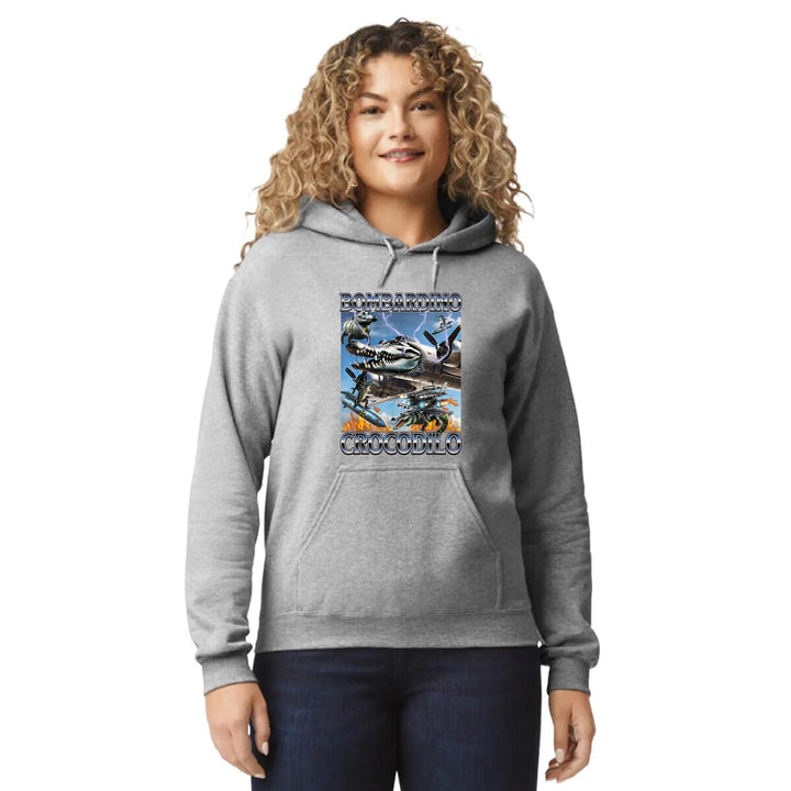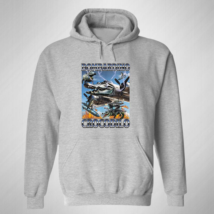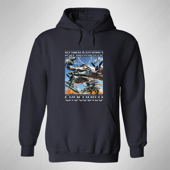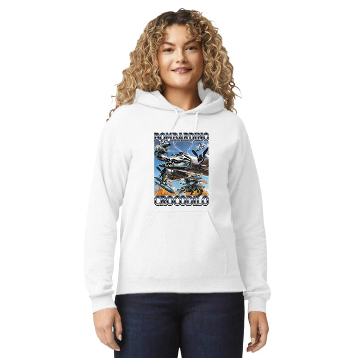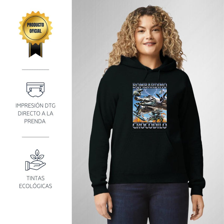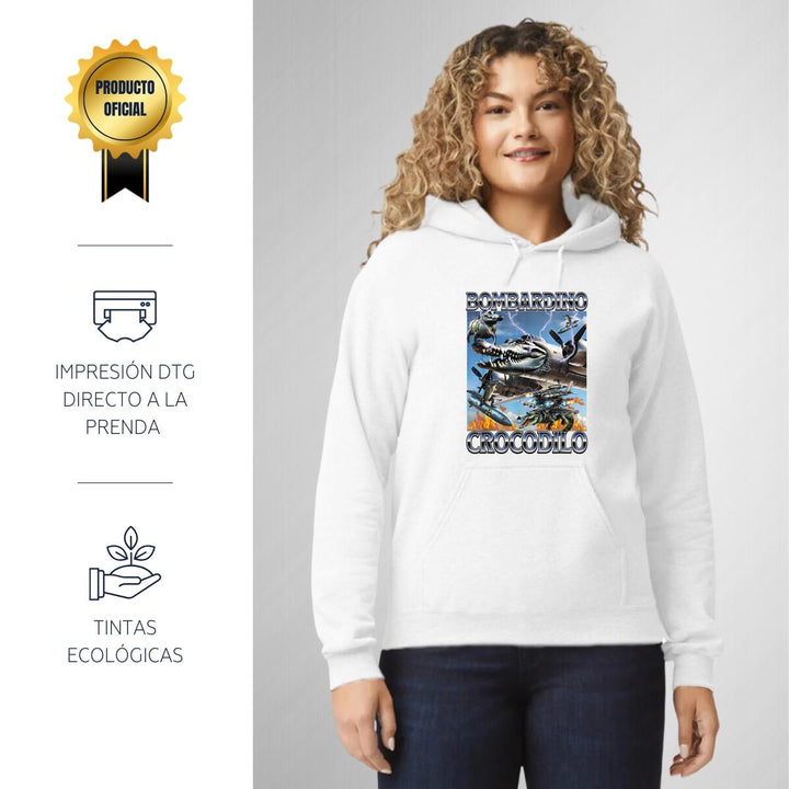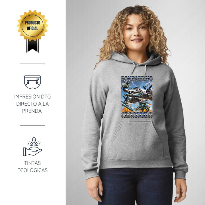 Sudadera hoodie de adulto con gorro o capucha y bolsillo frontal canguro, para mujer nueva, diseño Brainrot Bombardino Cocodrilo original impreso con tecnología DTG (directo a la prenda) tacto cero, uso casual o deportiva, 50% algodón y 50% poliéster fleece pre encogido, estructura tubular con ajuste clásico. Colores de sudadera: Negro, Blanco, Azul Marino, Gris.
