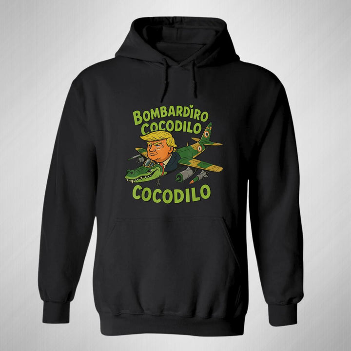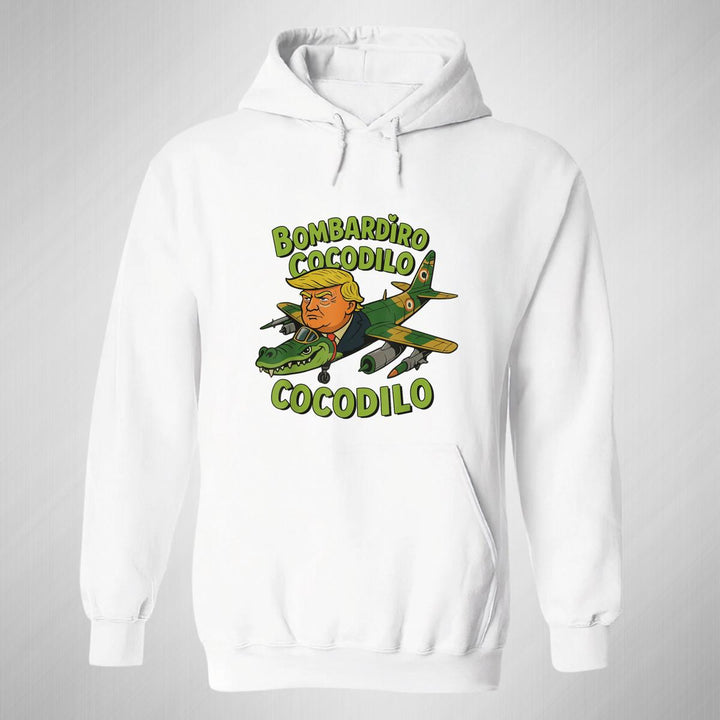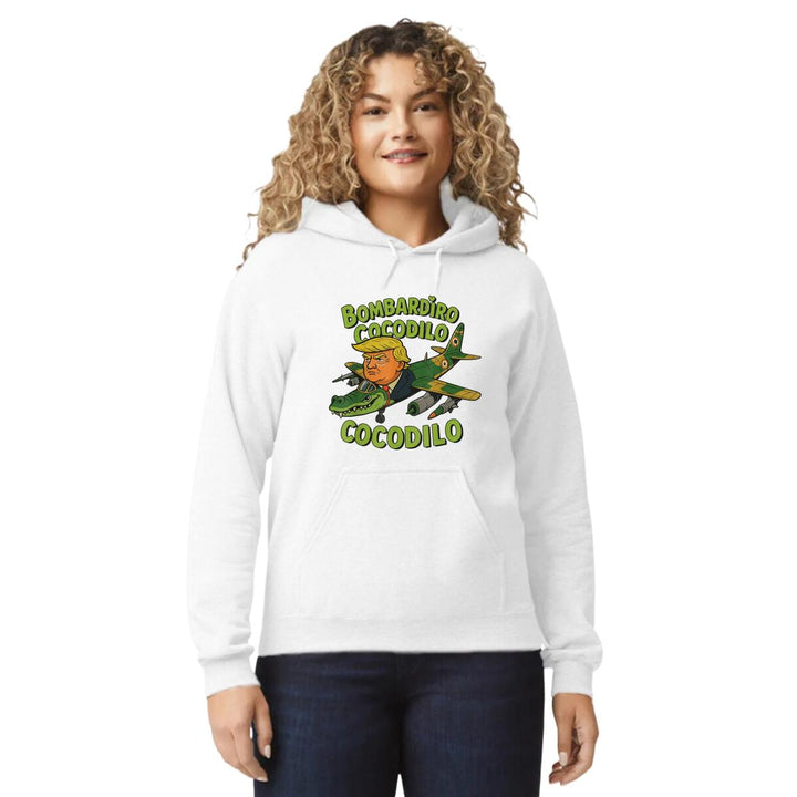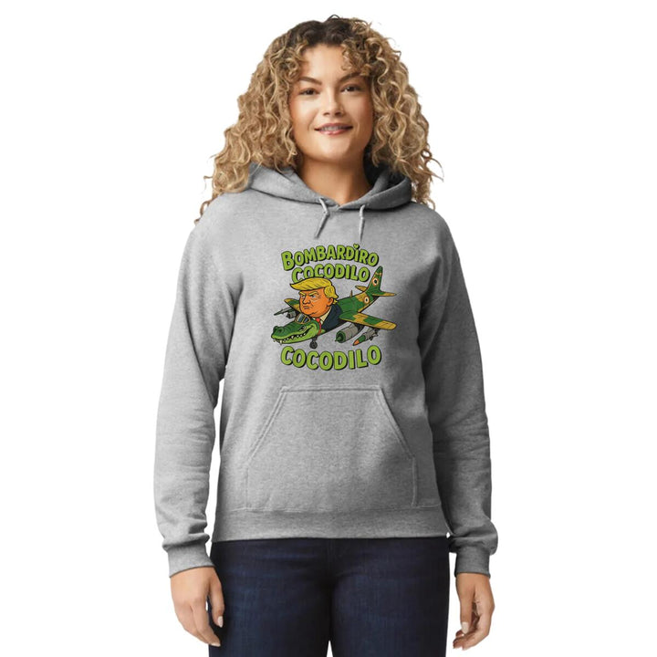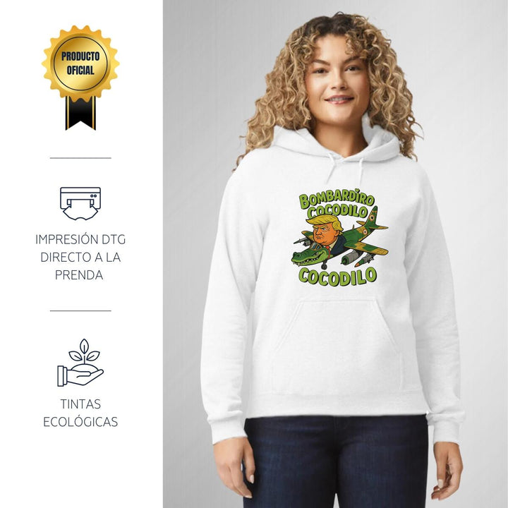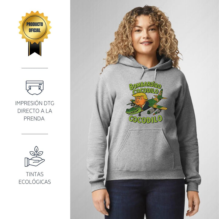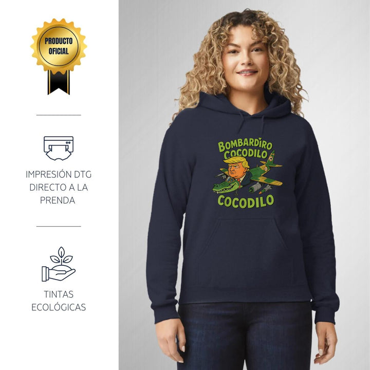 Sudadera hoodie de adulto con gorro o capucha y bolsillo frontal canguro, para mujer nueva, diseño Brainrot Bombardiro Crocodilo original impreso con tecnología DTG (directo a la prenda) tacto cero, uso casual o deportiva, 50% algodón y 50% poliéster fleece pre encogido, estructura tubular con ajuste clásico. Colores de sudadera: Negro, Blanco, Azul Marino, Gris.