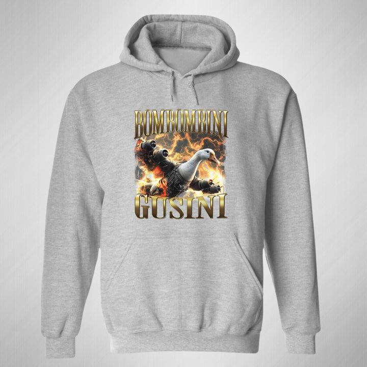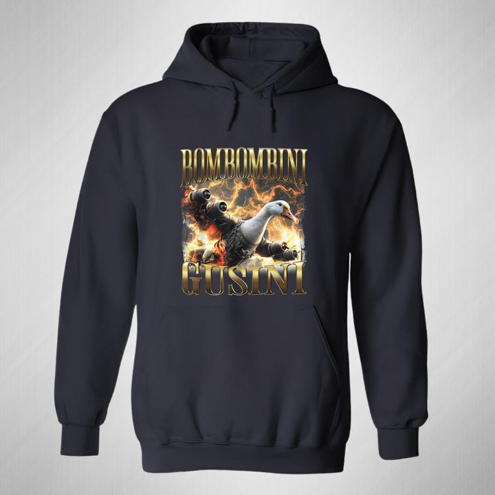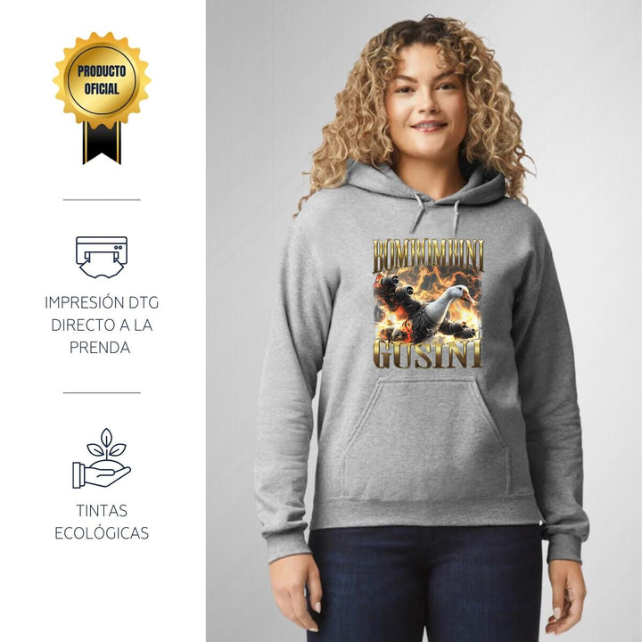 Sudadera hoodie de adulto con gorro o capucha y bolsillo frontal canguro, para mujer nueva, diseño Brainrot Bombombini Gusini original impreso con tecnología DTG (directo a la prenda) tacto cero, uso casual o deportiva, 50% algodón y 50% poliéster fleece pre encogido, estructura tubular con ajuste clásico. Colores de sudadera: Negro, Blanco, Azul Marino, Gris.