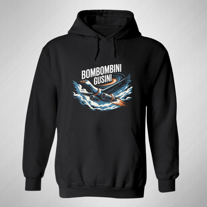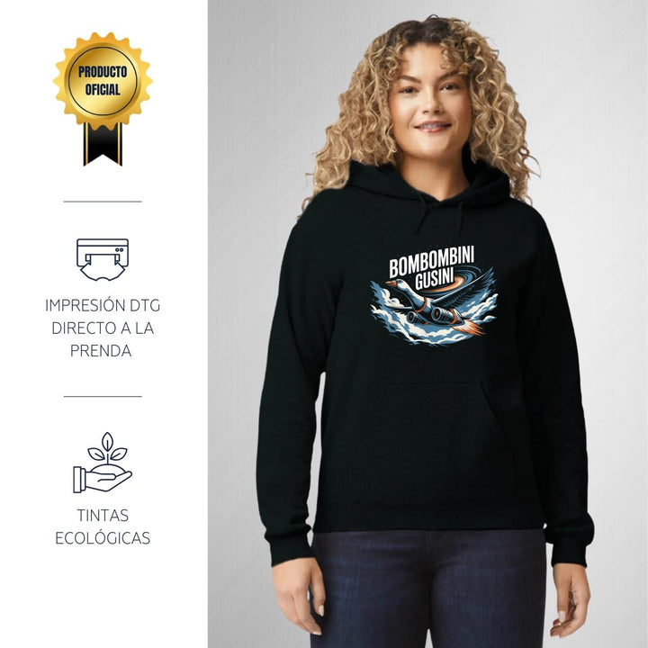 Sudadera hoodie de adulto con gorro o capucha y bolsillo frontal canguro, para mujer nueva, diseño Brainrot Bombombini Gusini original impreso con tecnología DTG (directo a la prenda) tacto cero, uso casual o deportiva, 50% algodón y 50% poliéster fleece pre encogido, estructura tubular con ajuste clásico. Colores de sudadera: Negro, Blanco, Azul Marino, Gris.