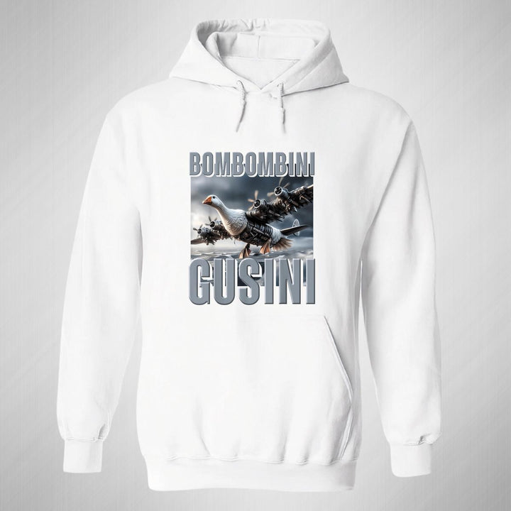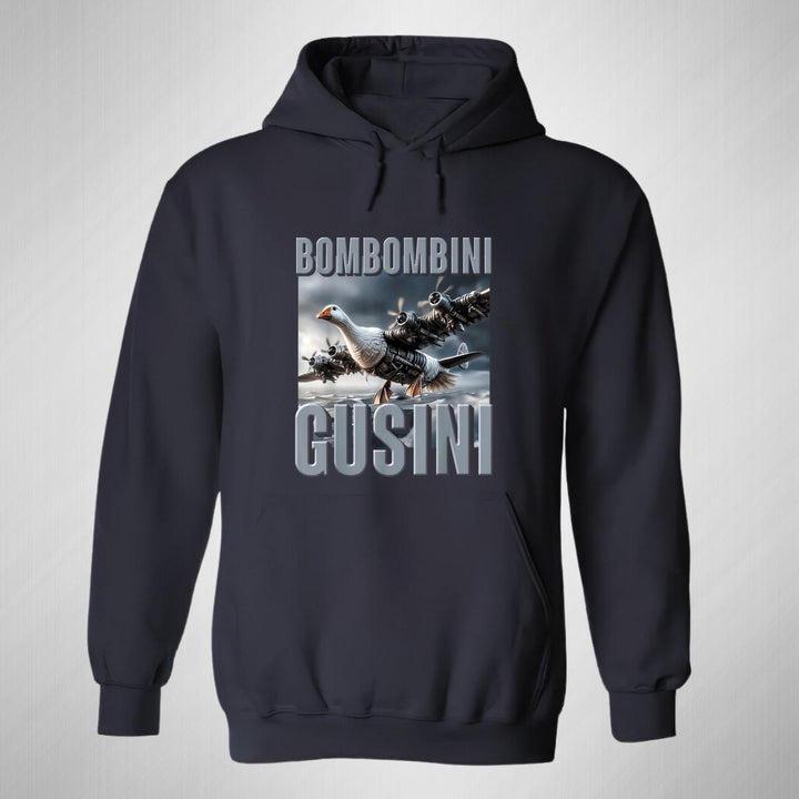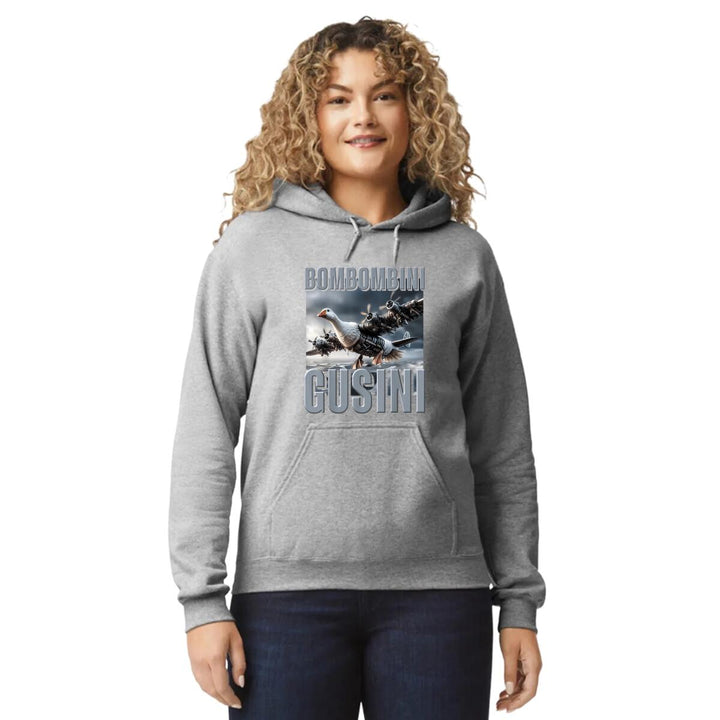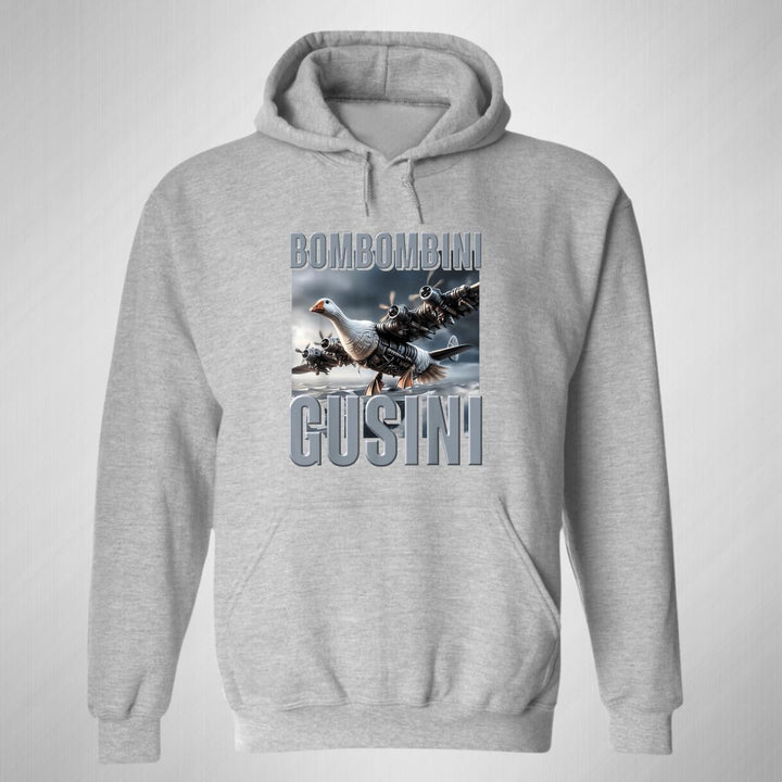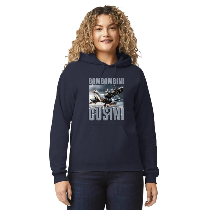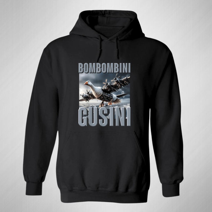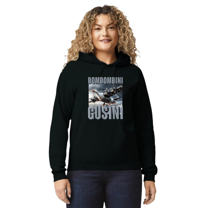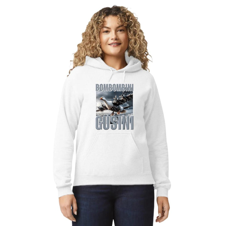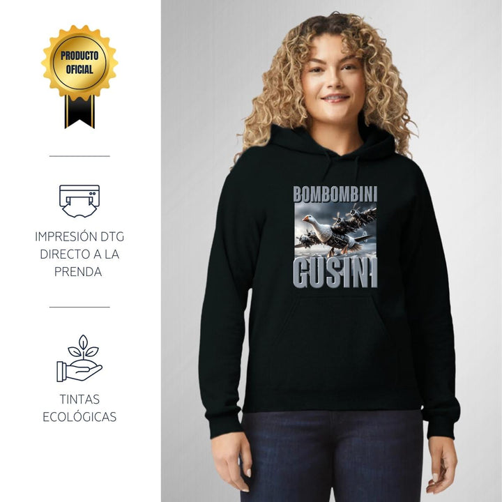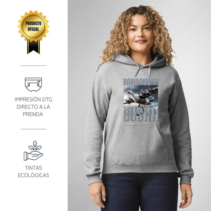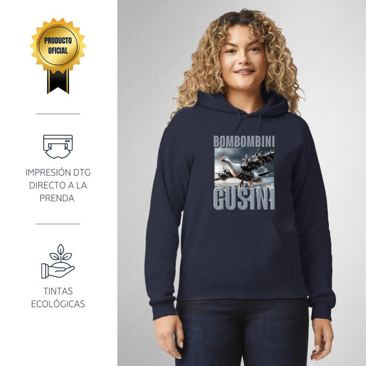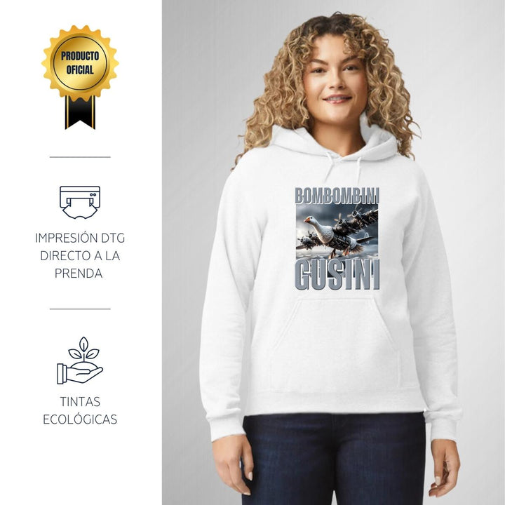 Sudadera hoodie de adulto con gorro o capucha y bolsillo frontal canguro, para mujer nueva, diseño Brainrot Bombombini Gusini original impreso con tecnología DTG (directo a la prenda) tacto cero, uso casual o deportiva, 50% algodón y 50% poliéster fleece pre encogido, estructura tubular con ajuste clásico. Colores de sudadera: Negro, Blanco, Azul Marino, Gris.