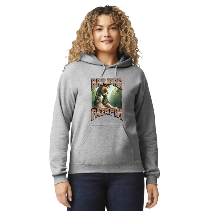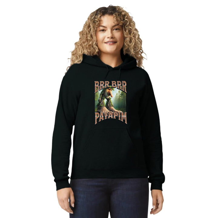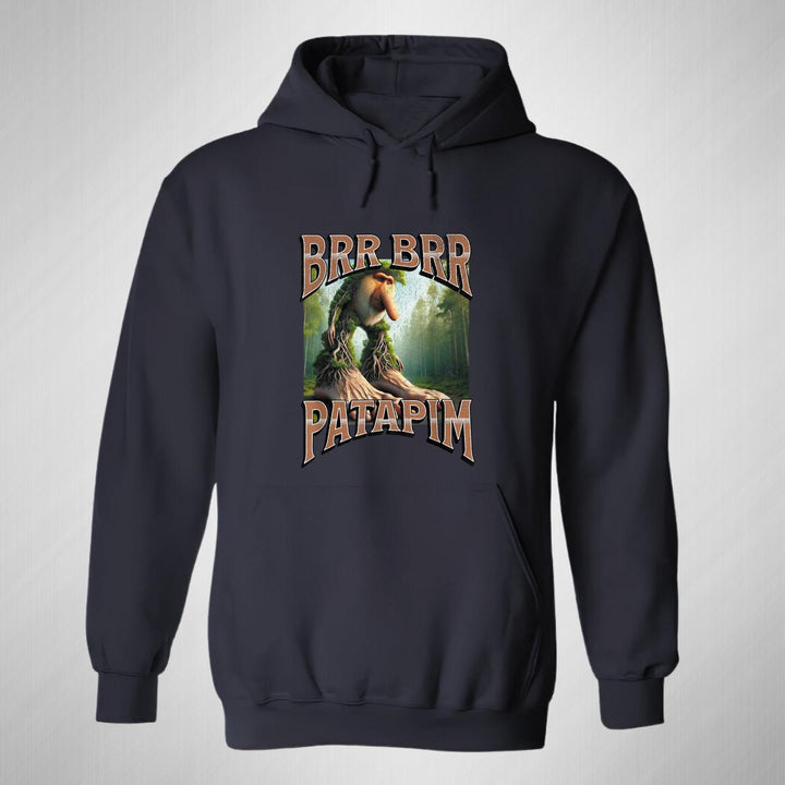 Sudadera hoodie de adulto con gorro o capucha y bolsillo frontal canguro, para mujer nueva, diseño Brainrot Brr Brr Patapim original impreso con tecnología DTG (directo a la prenda) tacto cero, uso casual o deportiva, 50% algodón y 50% poliéster fleece pre encogido, estructura tubular con ajuste clásico. Colores de sudadera: Negro, Blanco, Azul Marino, Gris.