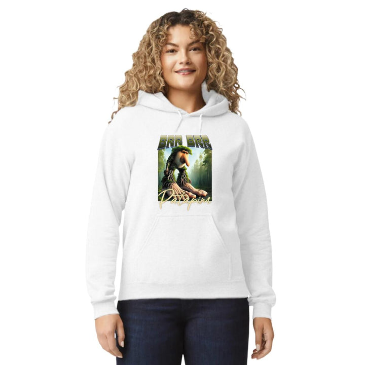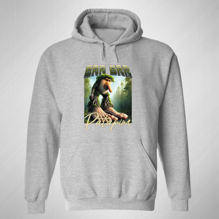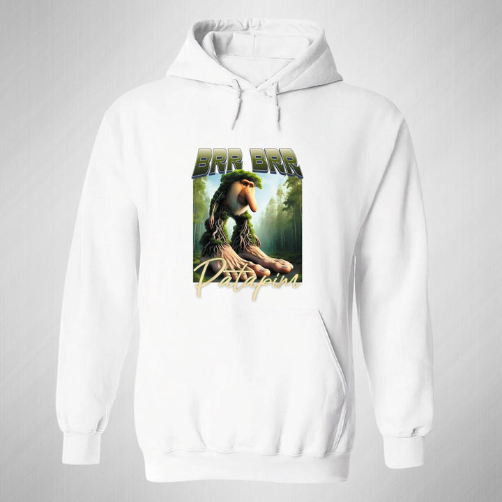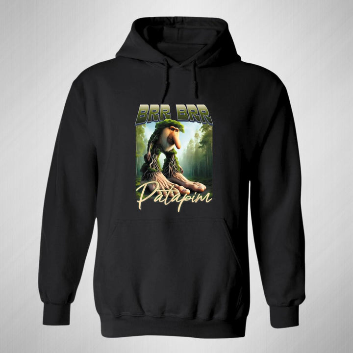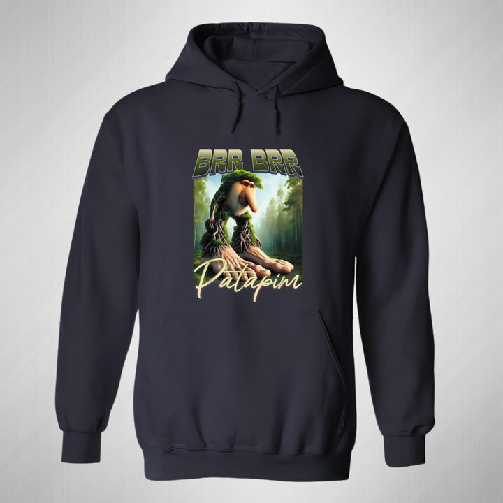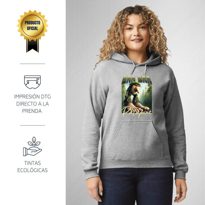 Sudadera hoodie de adulto con gorro o capucha y bolsillo frontal canguro, para mujer nueva, diseño Brainrot Brr Brr Patapim original impreso con tecnología DTG (directo a la prenda) tacto cero, uso casual o deportiva, 50% algodón y 50% poliéster fleece pre encogido, estructura tubular con ajuste clásico. Colores de sudadera: Negro, Blanco, Azul Marino, Gris.