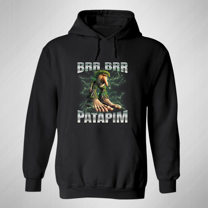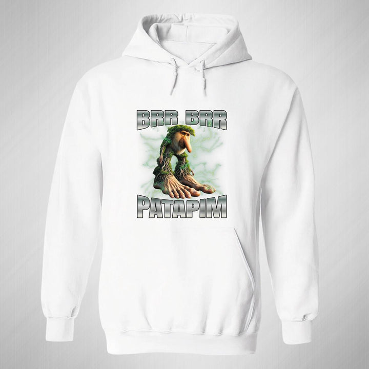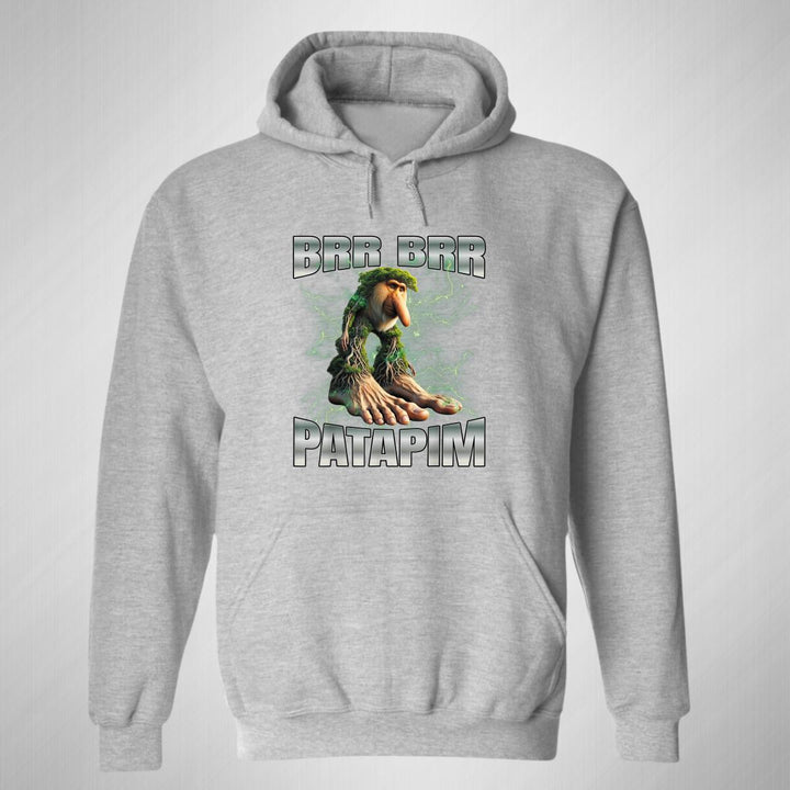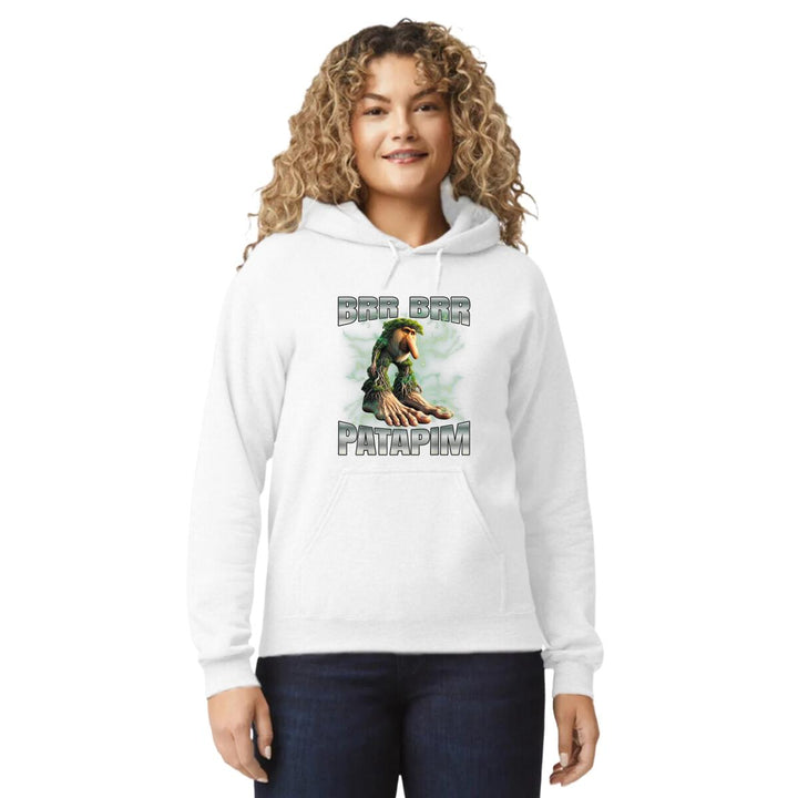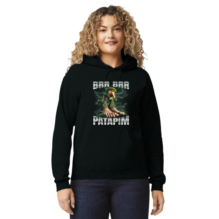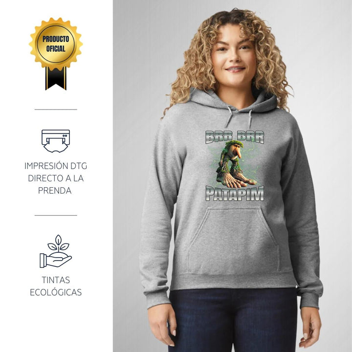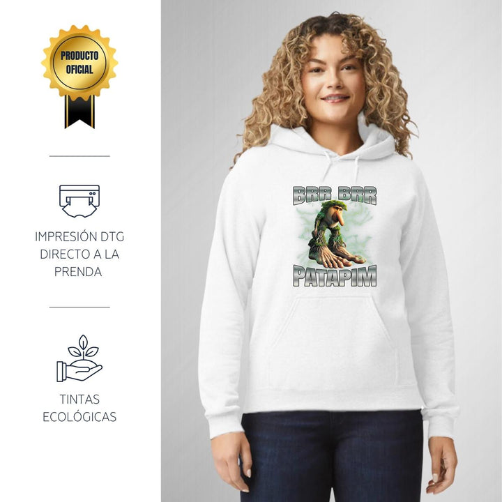 Sudadera hoodie de adulto con gorro o capucha y bolsillo frontal canguro, para mujer nueva, diseño Brainrot Brr Brr Patapim original impreso con tecnología DTG (directo a la prenda) tacto cero, uso casual o deportiva, 50% algodón y 50% poliéster fleece pre encogido, estructura tubular con ajuste clásico. Colores de sudadera: Negro, Blanco, Azul Marino, Gris.