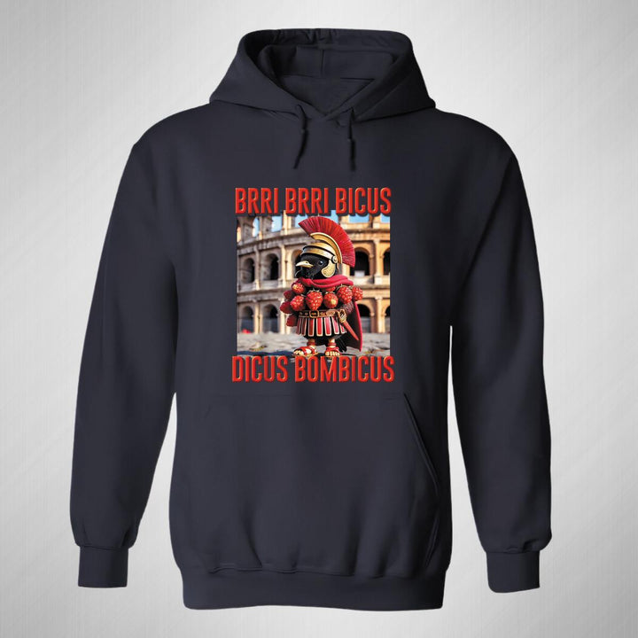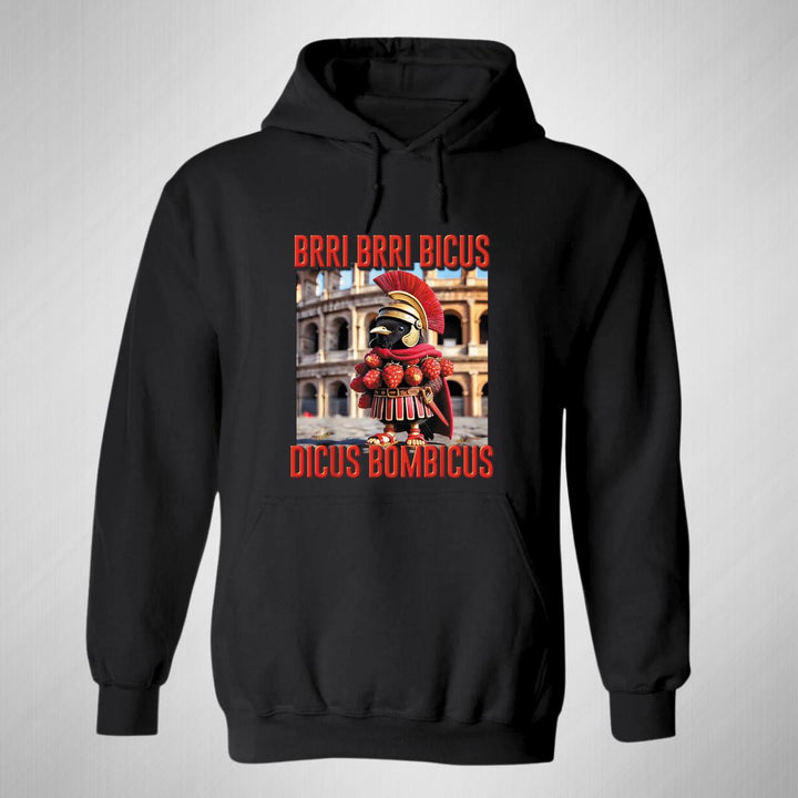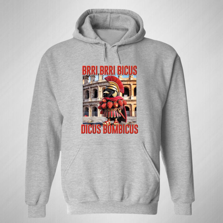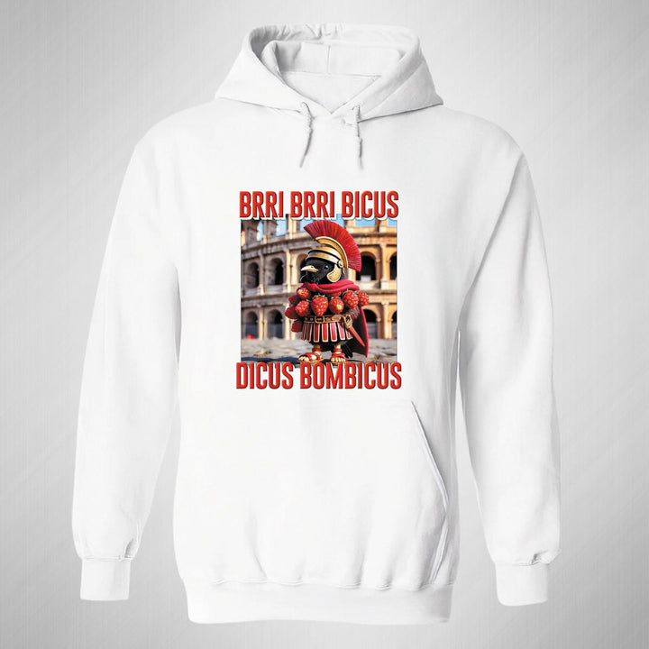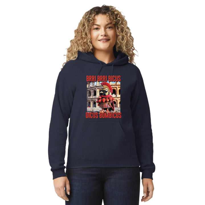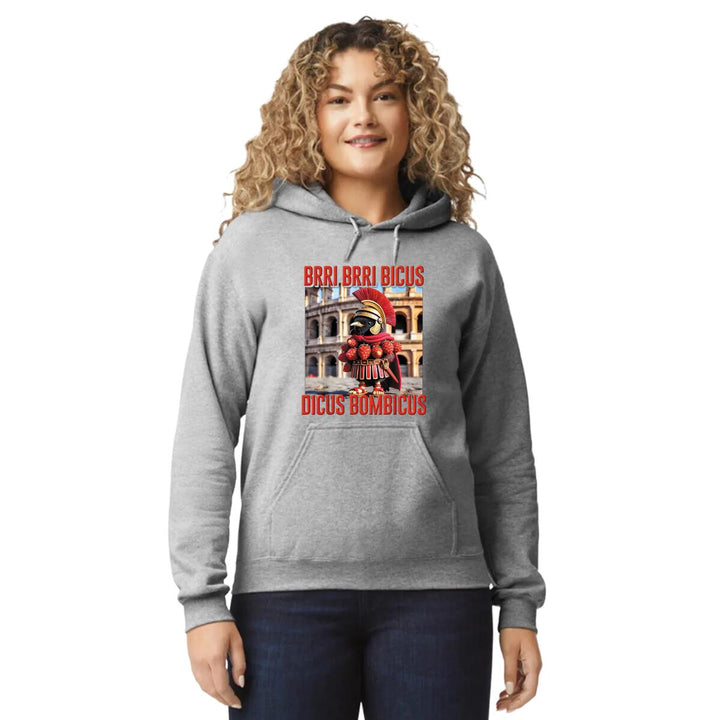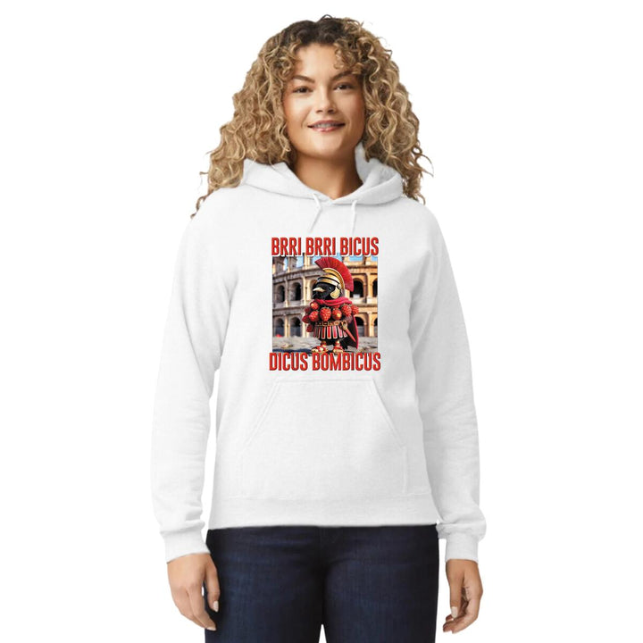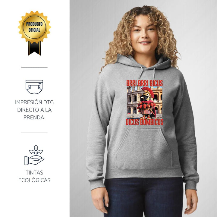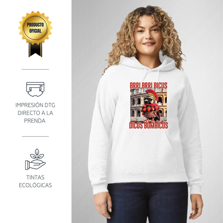 Sudadera hoodie de adulto con gorro o capucha y bolsillo frontal canguro, para mujer nueva, diseño Brainrot Brri Brri Bicus Dicus original impreso con tecnología DTG (directo a la prenda) tacto cero, uso casual o deportiva, 50% algodón y 50% poliéster fleece pre encogido, estructura tubular con ajuste clásico. Colores de sudadera: Negro, Blanco, Azul Marino, Gris.