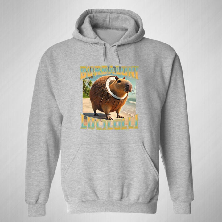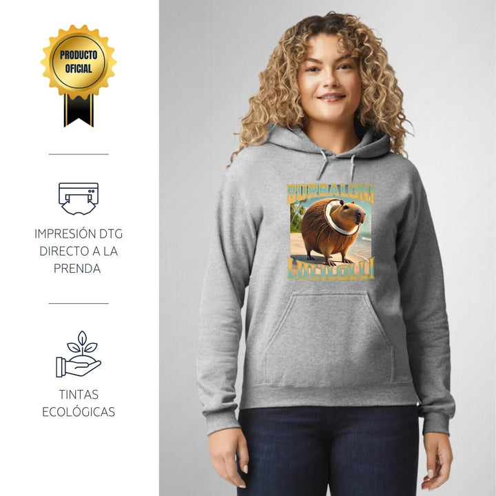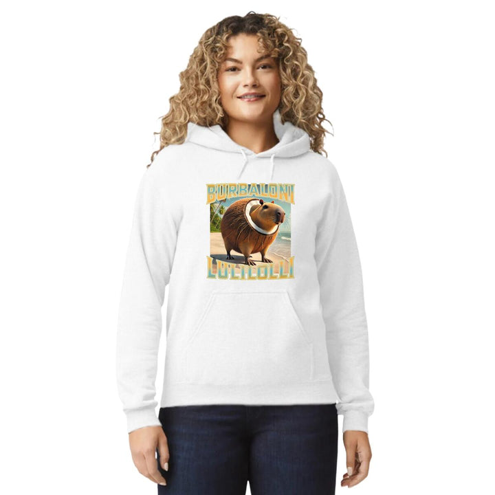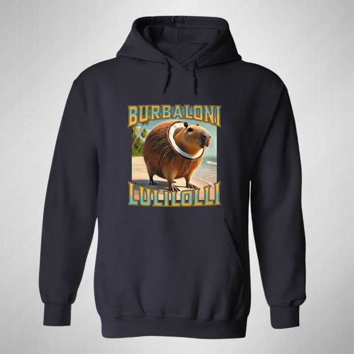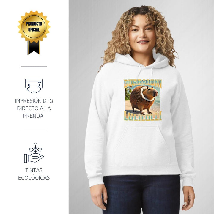 Sudadera hoodie de adulto con gorro o capucha y bolsillo frontal canguro, para mujer nueva, diseño Brainrot Burbaloni Luliloli original impreso con tecnología DTG (directo a la prenda) tacto cero, uso casual o deportiva, 50% algodón y 50% poliéster fleece pre encogido, estructura tubular con ajuste clásico. Colores de sudadera: Negro, Azul Marino.