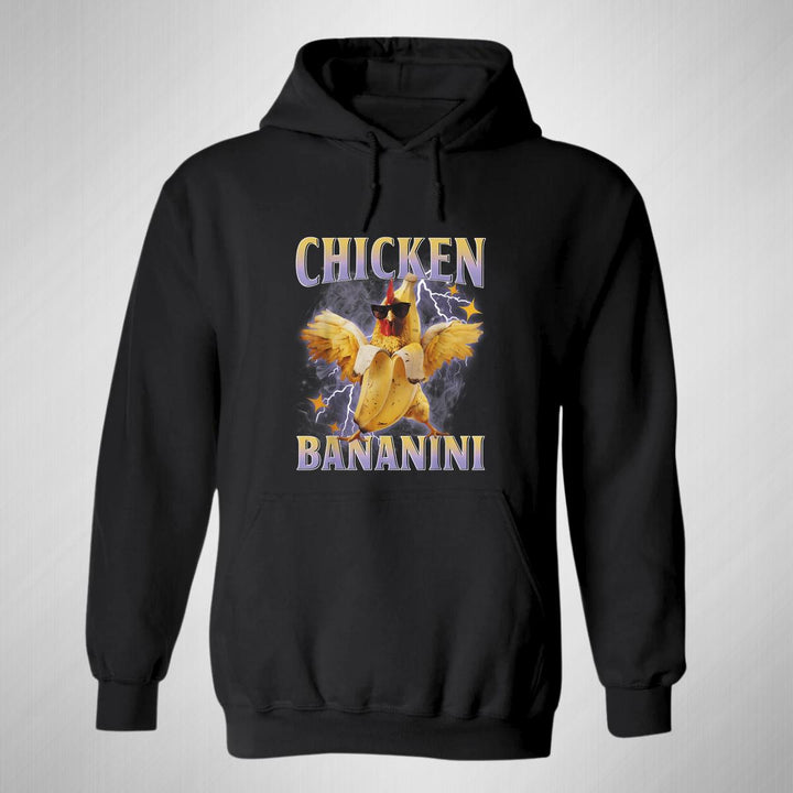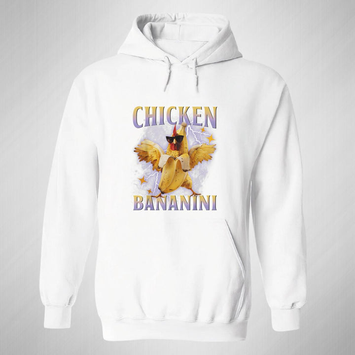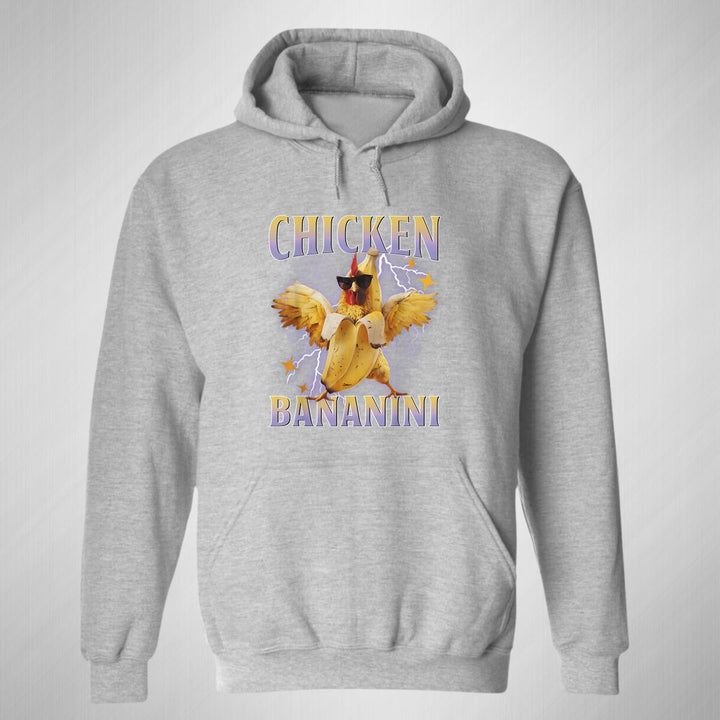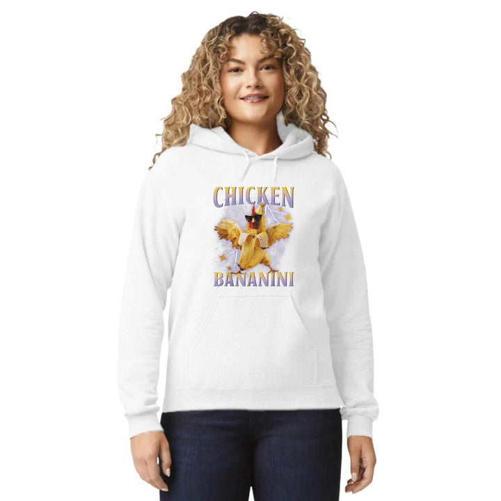Sudadera hoodie de adulto con gorro o capucha y bolsillo frontal canguro, para mujer nueva, diseño Brainrot Chicken Banana original impreso con tecnología DTG (directo a la prenda) tacto cero, uso casual o deportiva, 50% algodón y 50% poliéster fleece pre encogido, estructura tubular con ajuste clásico. Colores de sudadera: Negro, Blanco, Azul Marino, Gris.
