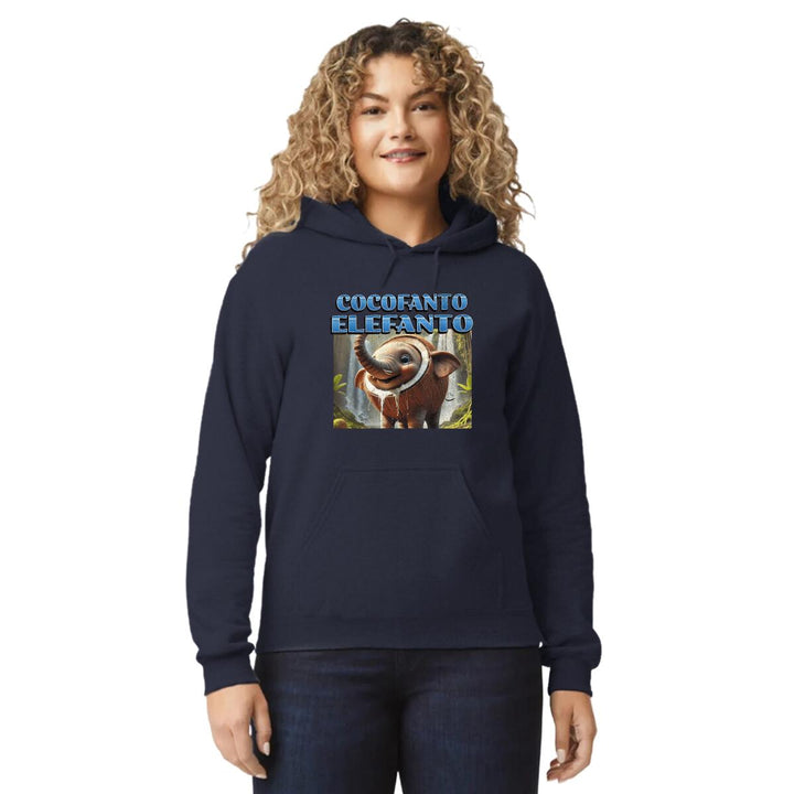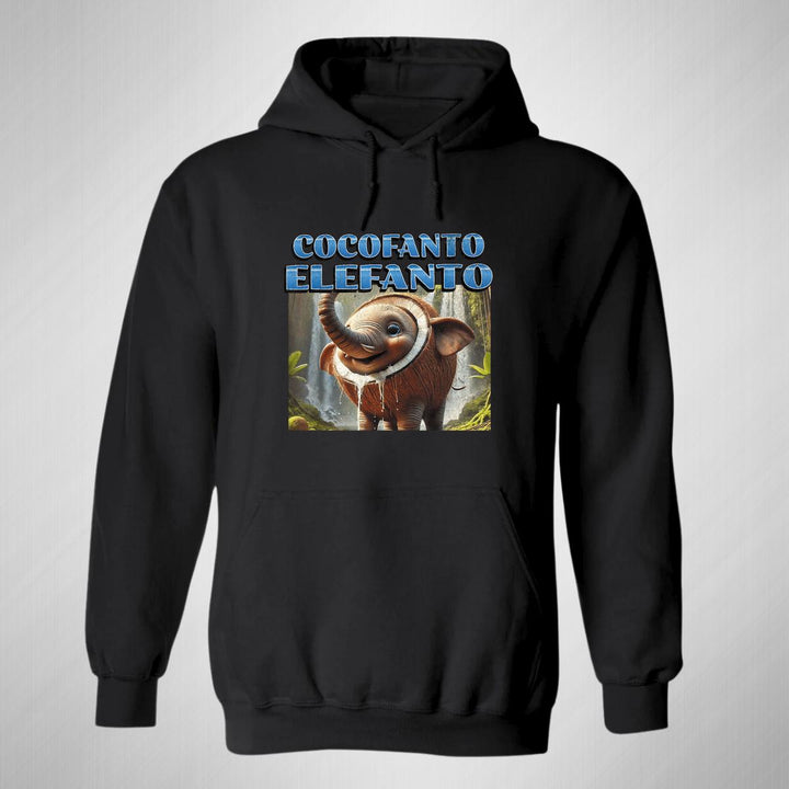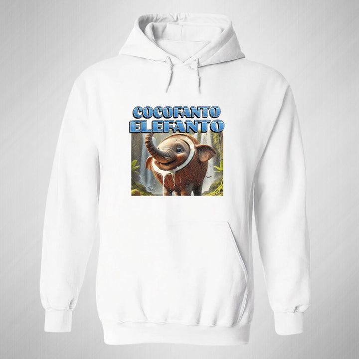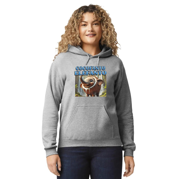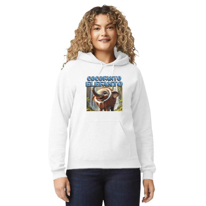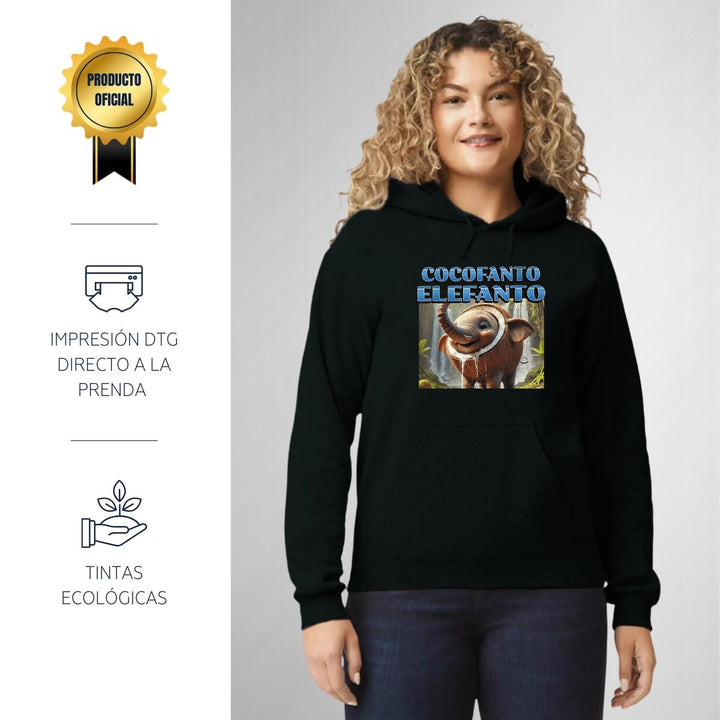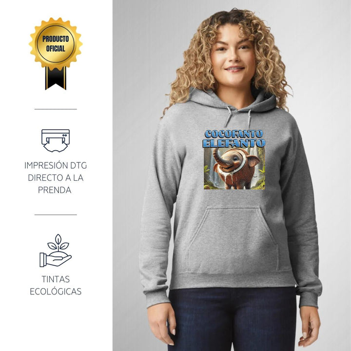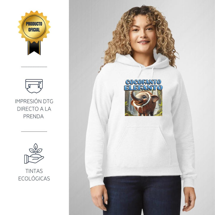 Sudadera hoodie de adulto con gorro o capucha y bolsillo frontal canguro, para mujer nueva, diseño Brainrot Cocofanto Elefanto original impreso con tecnología DTG (directo a la prenda) tacto cero, uso casual o deportiva, 50% algodón y 50% poliéster fleece pre encogido, estructura tubular con ajuste clásico. Colores de sudadera: Negro, Blanco, Azul Marino, Gris.