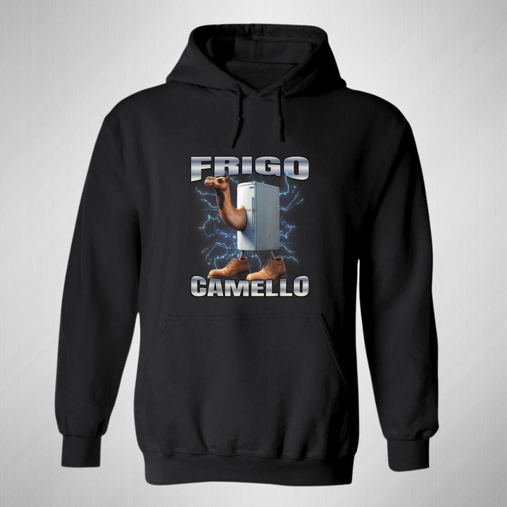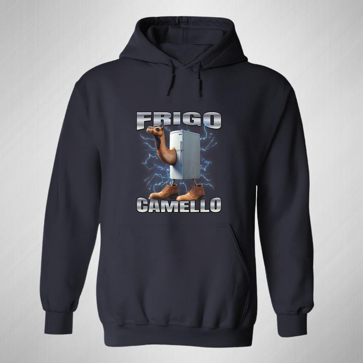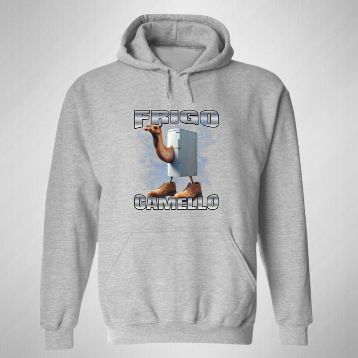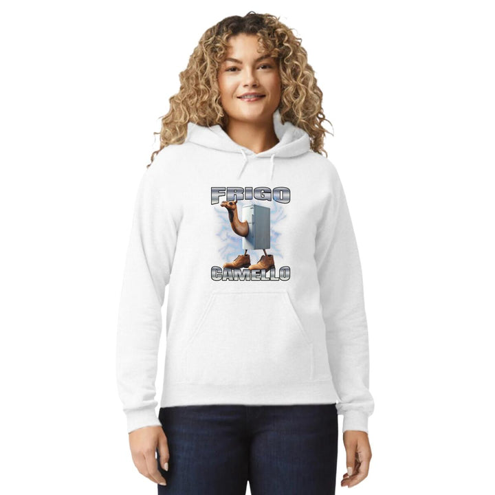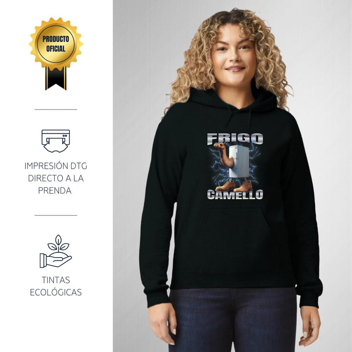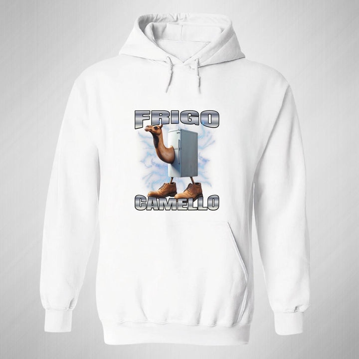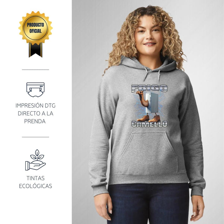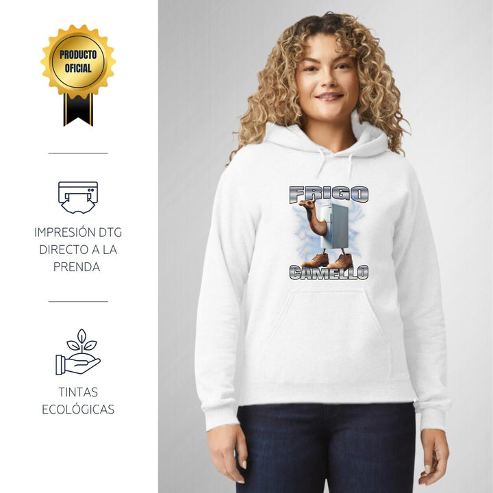 Sudadera hoodie de adulto con gorro o capucha y bolsillo frontal canguro, para mujer nueva, diseño Brainrot Frigo Camello original impreso con tecnología DTG (directo a la prenda) tacto cero, uso casual o deportiva, 50% algodón y 50% poliéster fleece pre encogido, estructura tubular con ajuste clásico. Colores de sudadera: Negro, Blanco, Azul Marino, Gris.