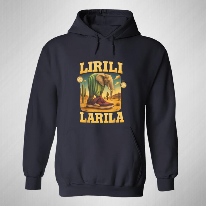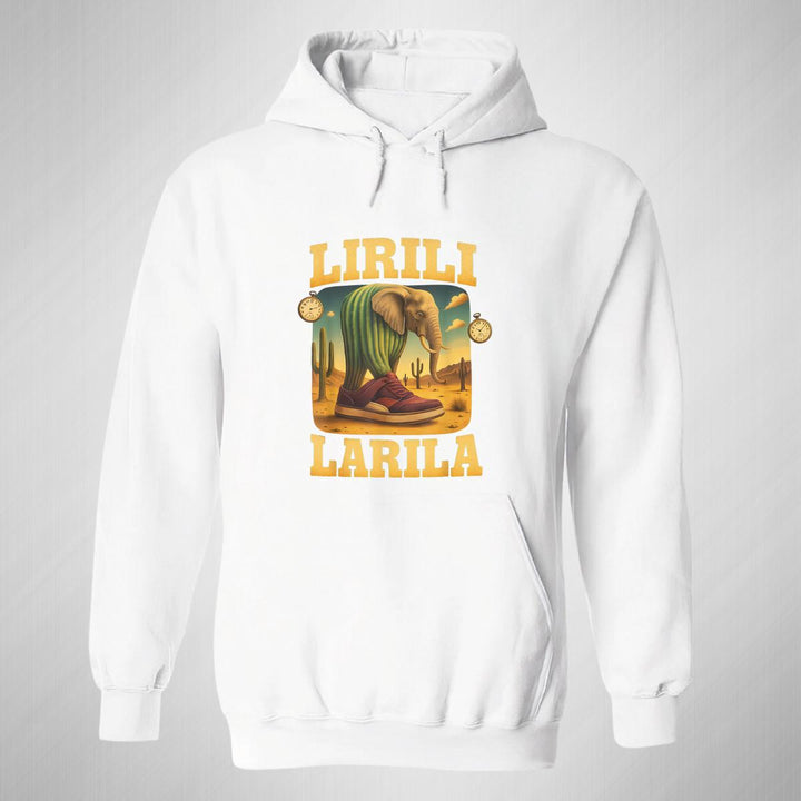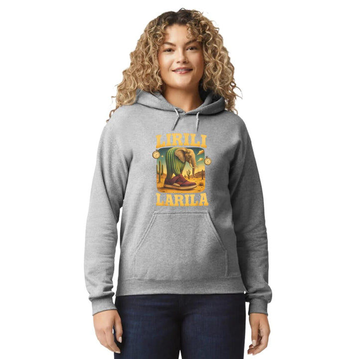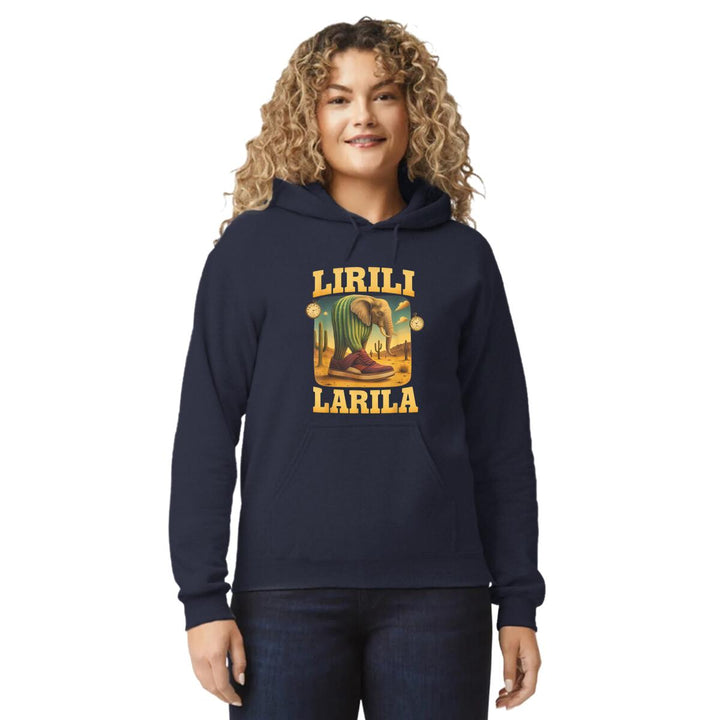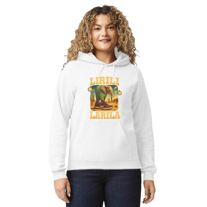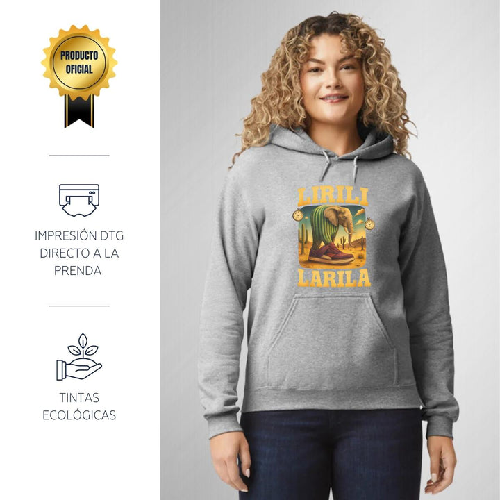 Sudadera hoodie de adulto con gorro o capucha y bolsillo frontal canguro, para mujer nueva, diseño Brainrot Lirili Larila original impreso con tecnología DTG (directo a la prenda) tacto cero, uso casual o deportiva, 50% algodón y 50% poliéster fleece pre encogido, estructura tubular con ajuste clásico. Colores de sudadera: Negro, Blanco, Azul Marino, Gris.