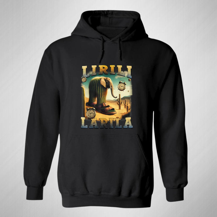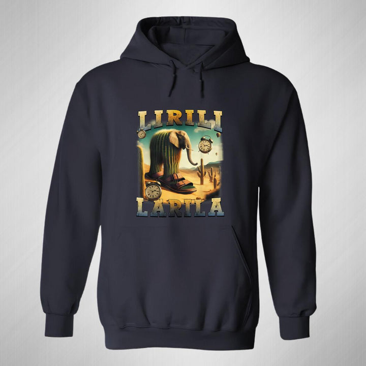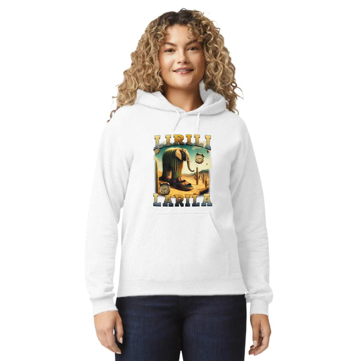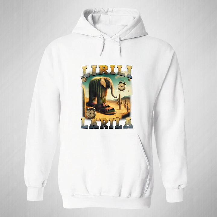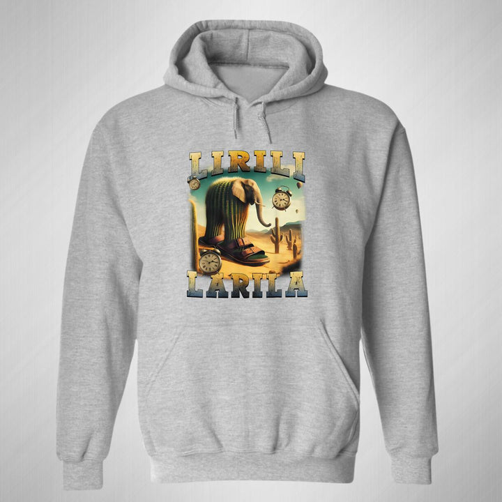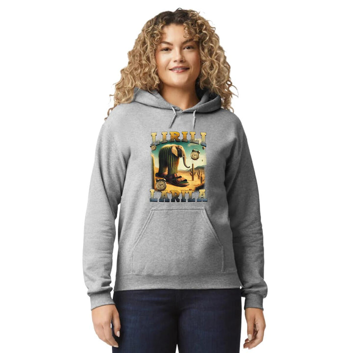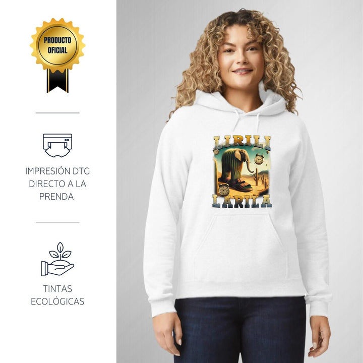 Sudadera hoodie de adulto con gorro o capucha y bolsillo frontal canguro, para mujer nueva, diseño Brainrot Lirili Larila original impreso con tecnología DTG (directo a la prenda) tacto cero, uso casual o deportiva, 50% algodón y 50% poliéster fleece pre encogido, estructura tubular con ajuste clásico. Colores de sudadera: Negro, Blanco, Azul Marino, Gris.