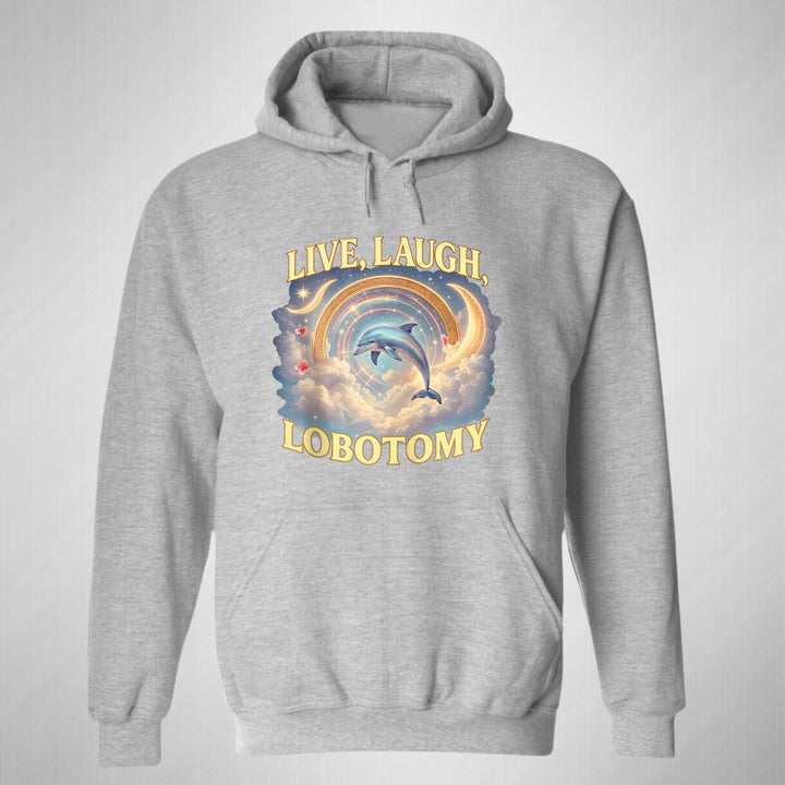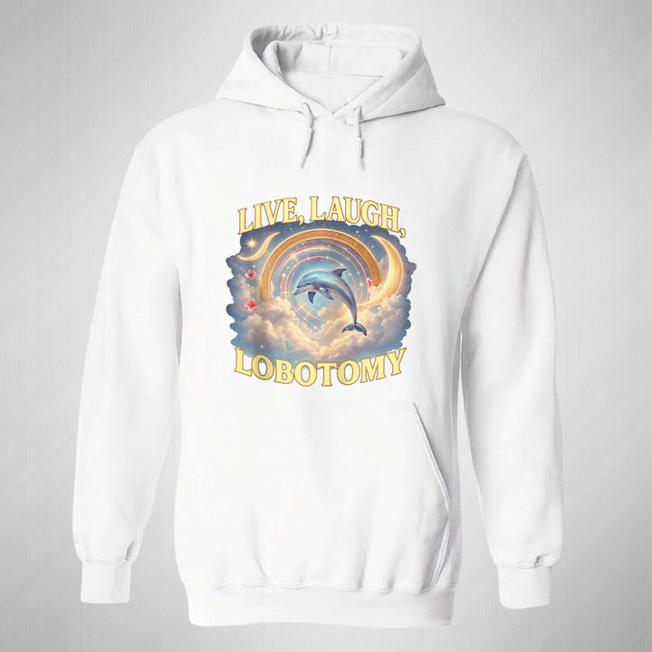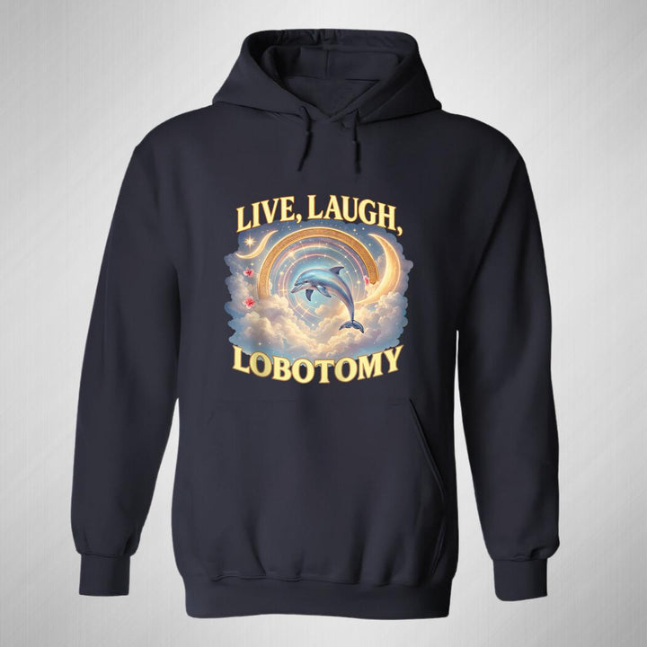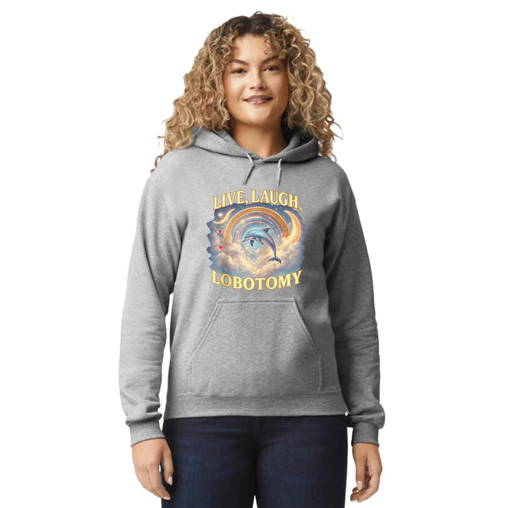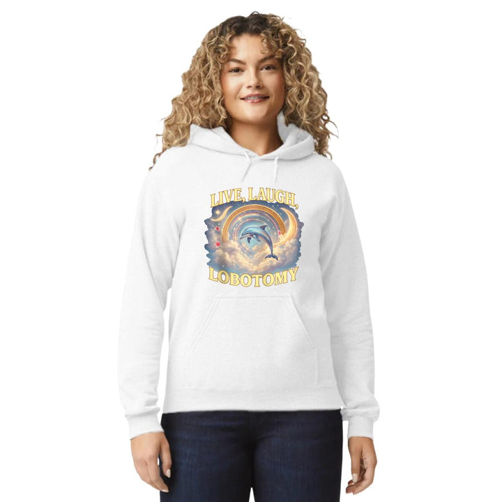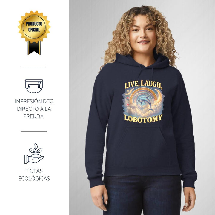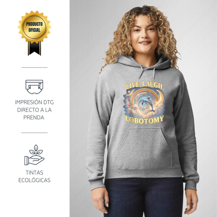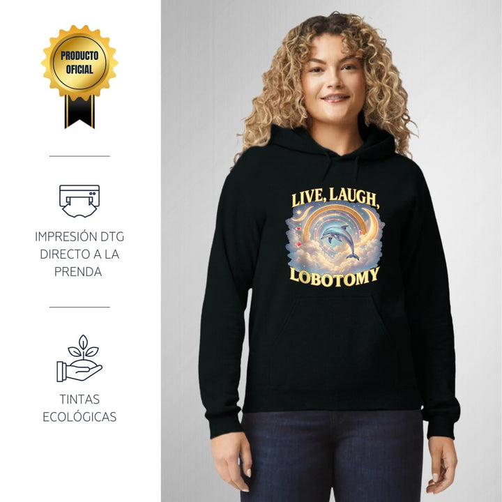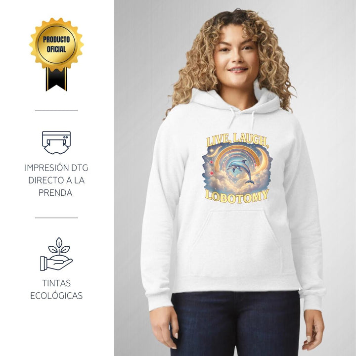 Sudadera hoodie de adulto con gorro o capucha y bolsillo frontal canguro, para mujer nueva, diseño Brainrot Live Laugh Lobotomy original impreso con tecnología DTG (directo a la prenda) tacto cero, uso casual o deportiva, 50% algodón y 50% poliéster fleece pre encogido, estructura tubular con ajuste clásico. Colores de sudadera: Negro, Blanco, Azul Marino, Gris.