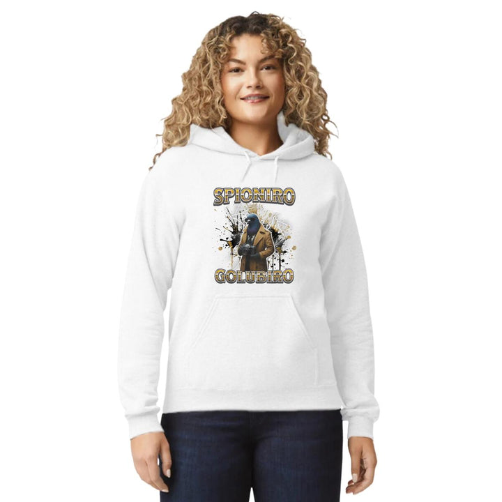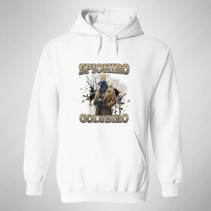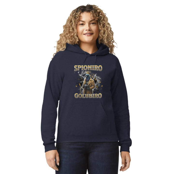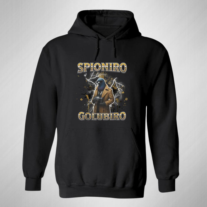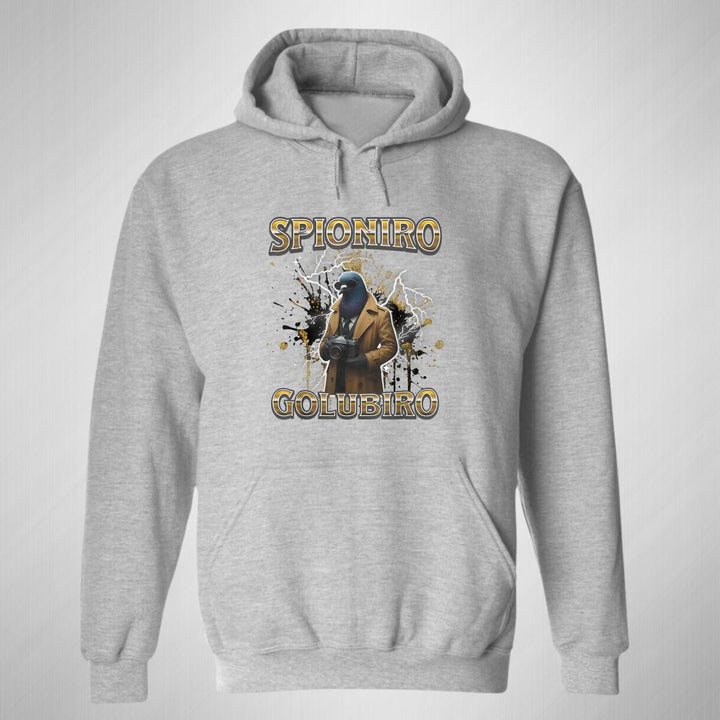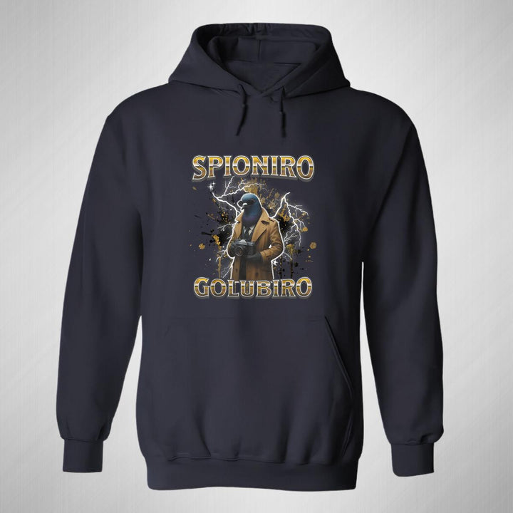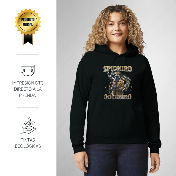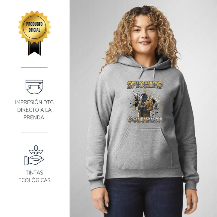 Sudadera hoodie de adulto con gorro o capucha y bolsillo frontal canguro, para mujer nueva, diseño Brainrot Spioniro Golubiro original impreso con tecnología DTG (directo a la prenda) tacto cero, uso casual o deportiva, 50% algodón y 50% poliéster fleece pre encogido, estructura tubular con ajuste clásico. Colores de sudadera: Negro, Blanco, Azul Marino, Gris.