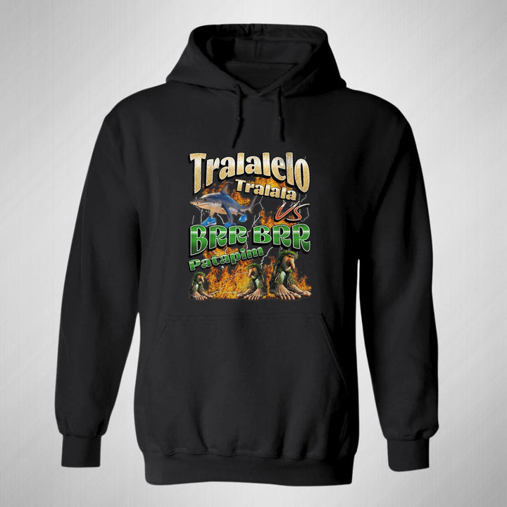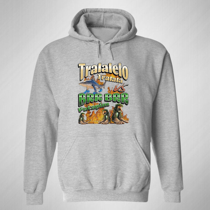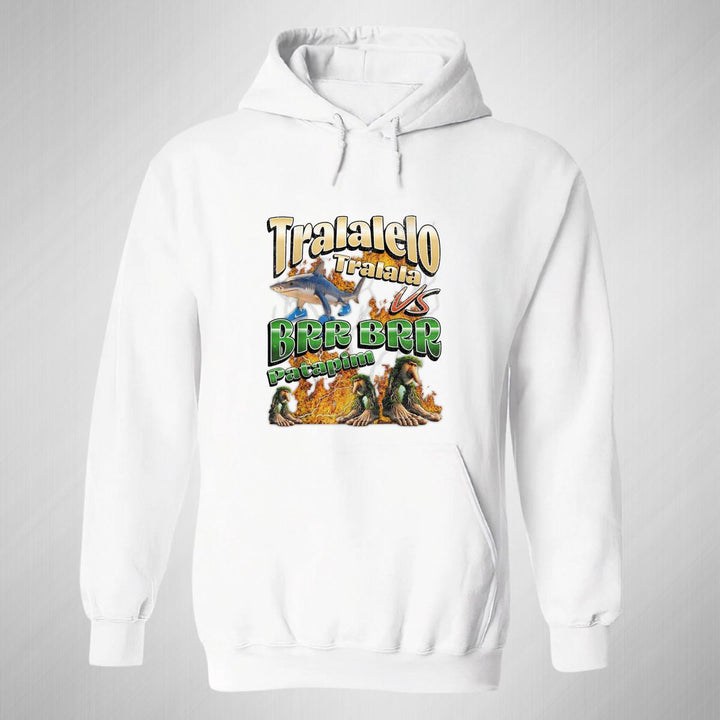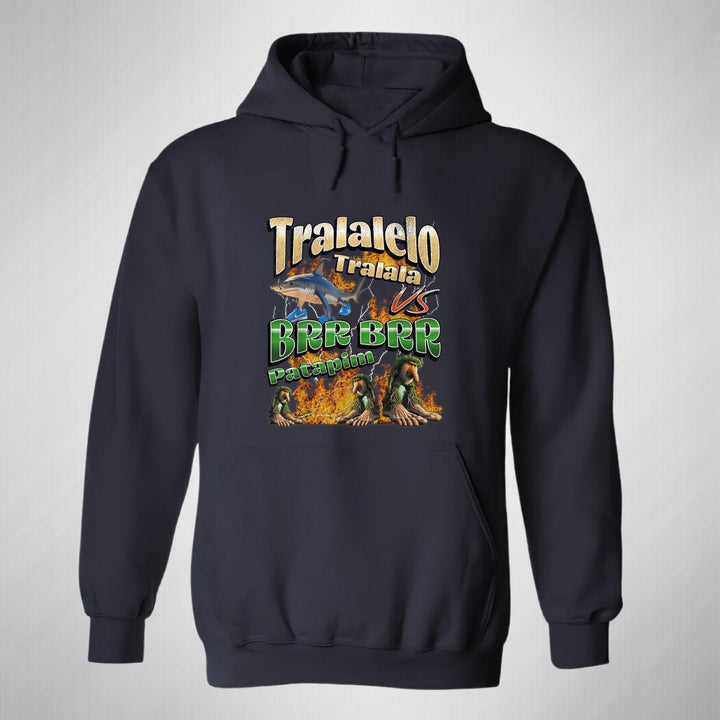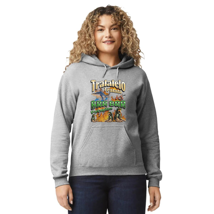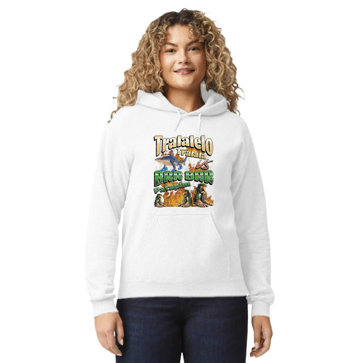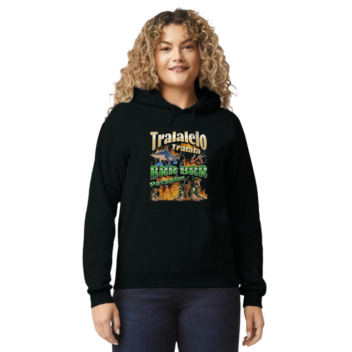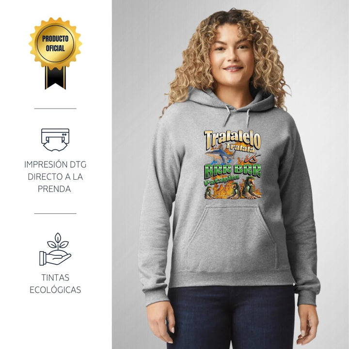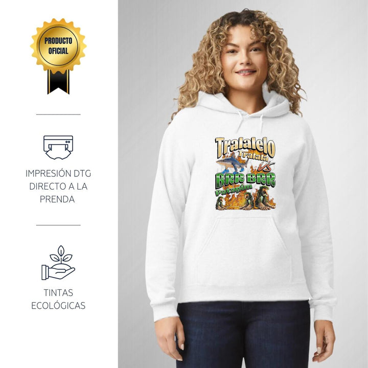 Sudadera hoodie de adulto con gorro o capucha y bolsillo frontal canguro, para mujer nueva, diseño Brainrot Tralalero Brr Brr original impreso con tecnología DTG (directo a la prenda) tacto cero, uso casual o deportiva, 50% algodón y 50% poliéster fleece pre encogido, estructura tubular con ajuste clásico. Colores de sudadera: Negro, Blanco, Azul Marino, Gris.