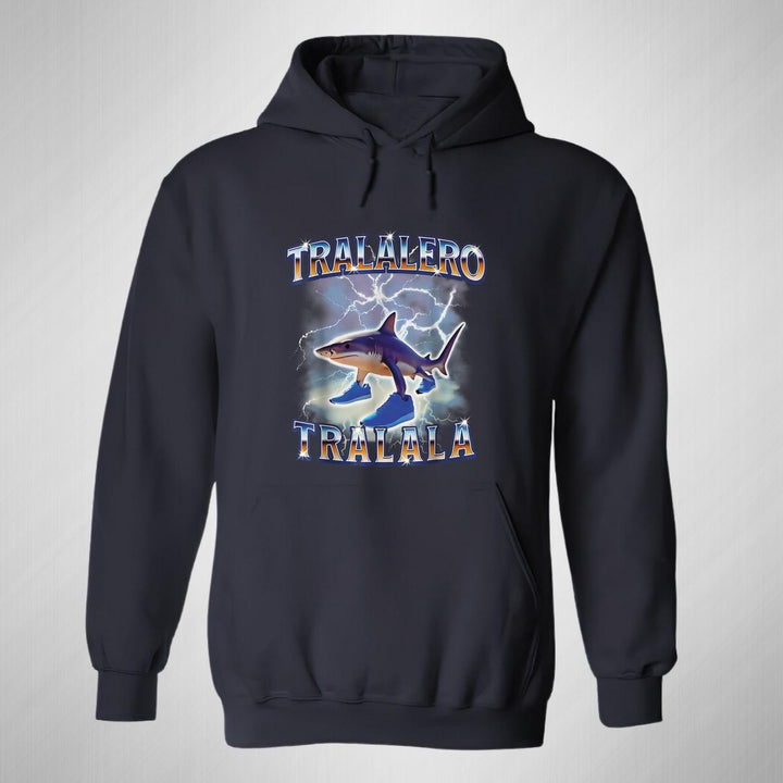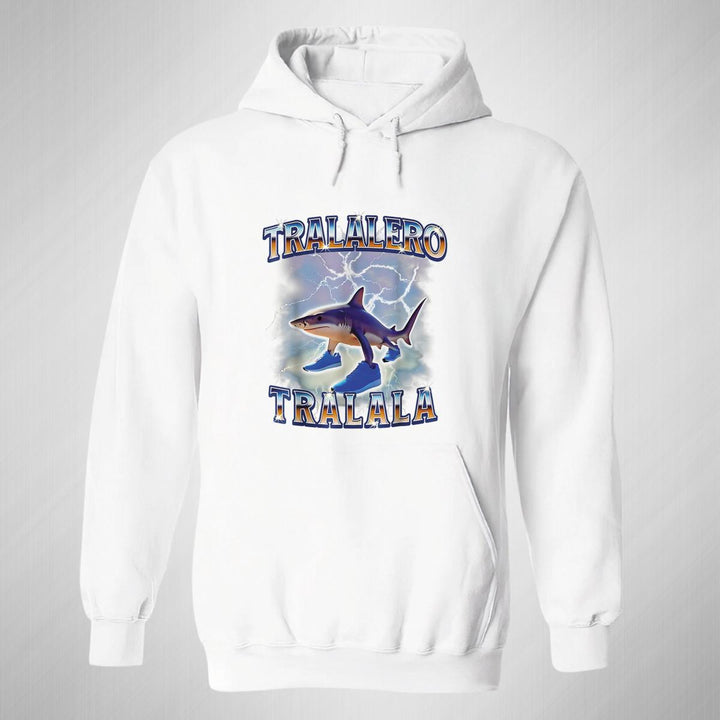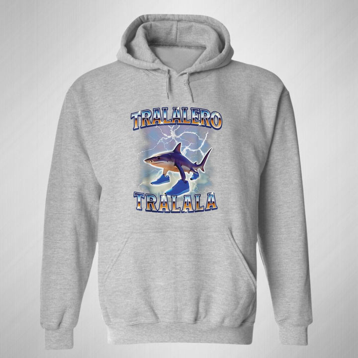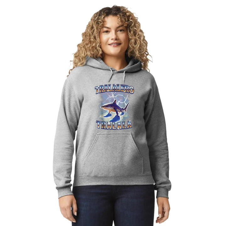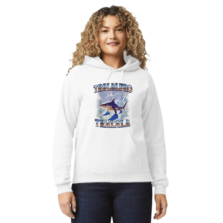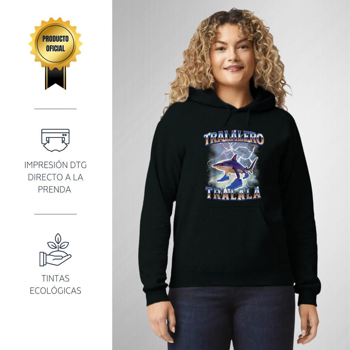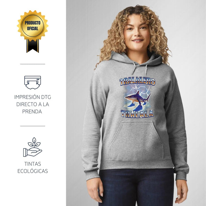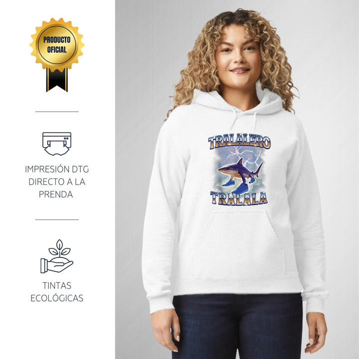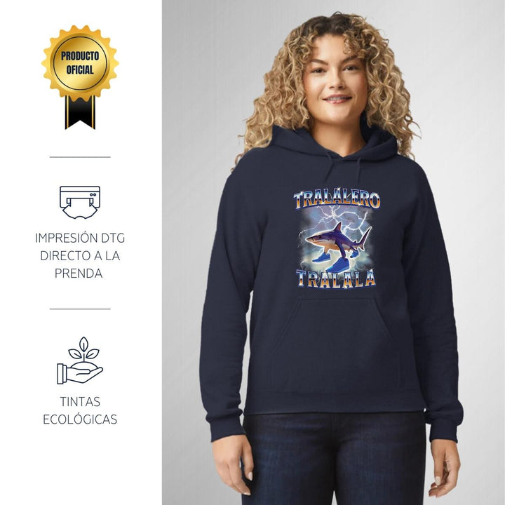 Sudadera hoodie de adulto con gorro o capucha y bolsillo frontal canguro, para mujer nueva, diseño Brainrot Tralalero Tralala original impreso con tecnología DTG (directo a la prenda) tacto cero, uso casual o deportiva, 50% algodón y 50% poliéster fleece pre encogido, estructura tubular con ajuste clásico. Colores de sudadera: Negro, Blanco, Azul Marino, Gris.