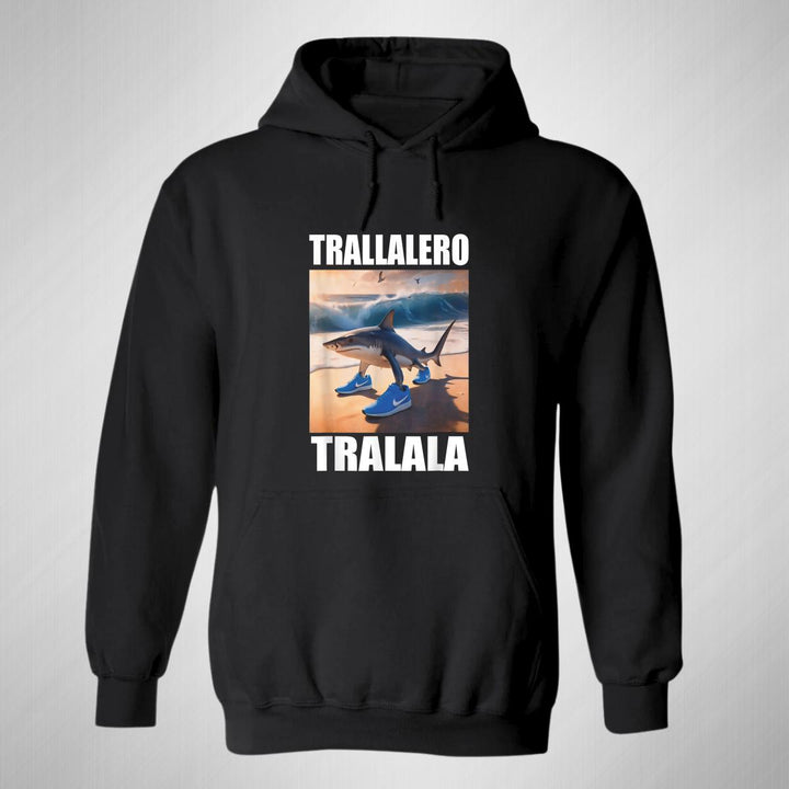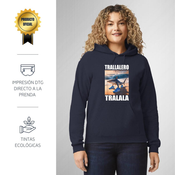 Sudadera hoodie de adulto con gorro o capucha y bolsillo frontal canguro, para mujer nueva, diseño Brainrot Tralalero Tralala original impreso con tecnología DTG (directo a la prenda) tacto cero, uso casual o deportiva, 50% algodón y 50% poliéster fleece pre encogido, estructura tubular con ajuste clásico. Colores de sudadera: Negro, Azul Marino.