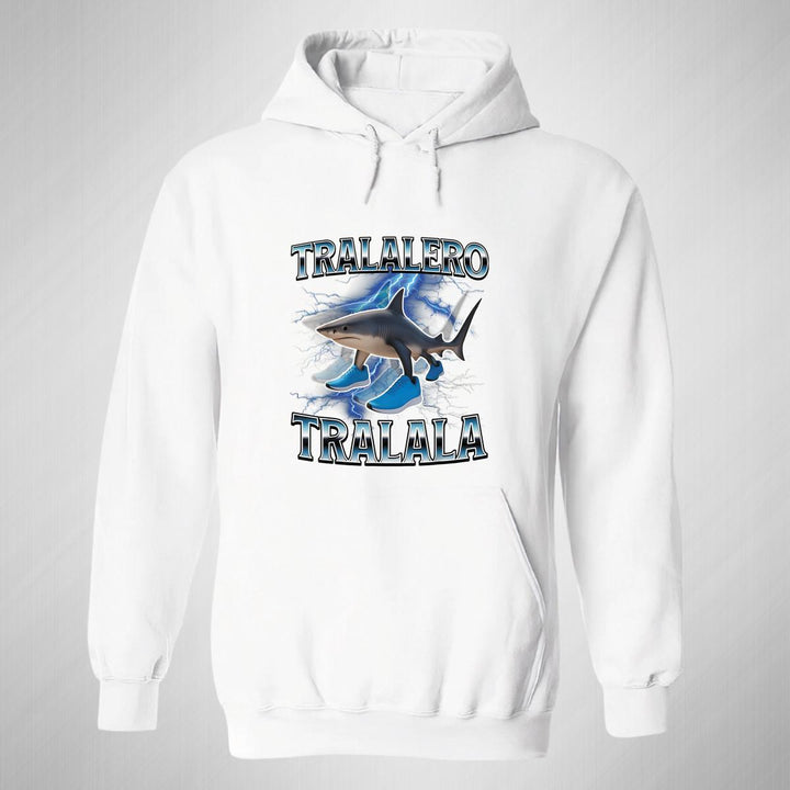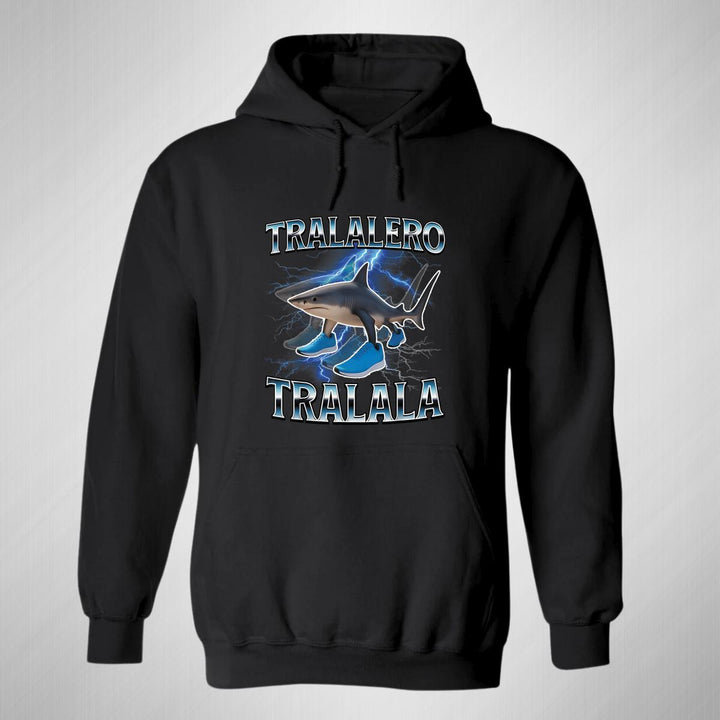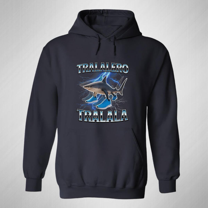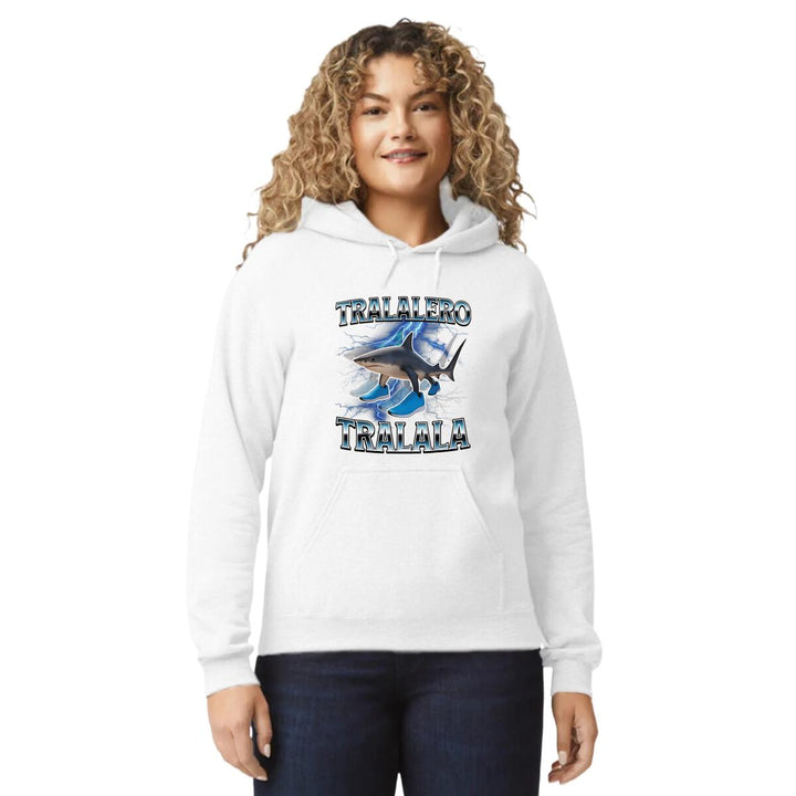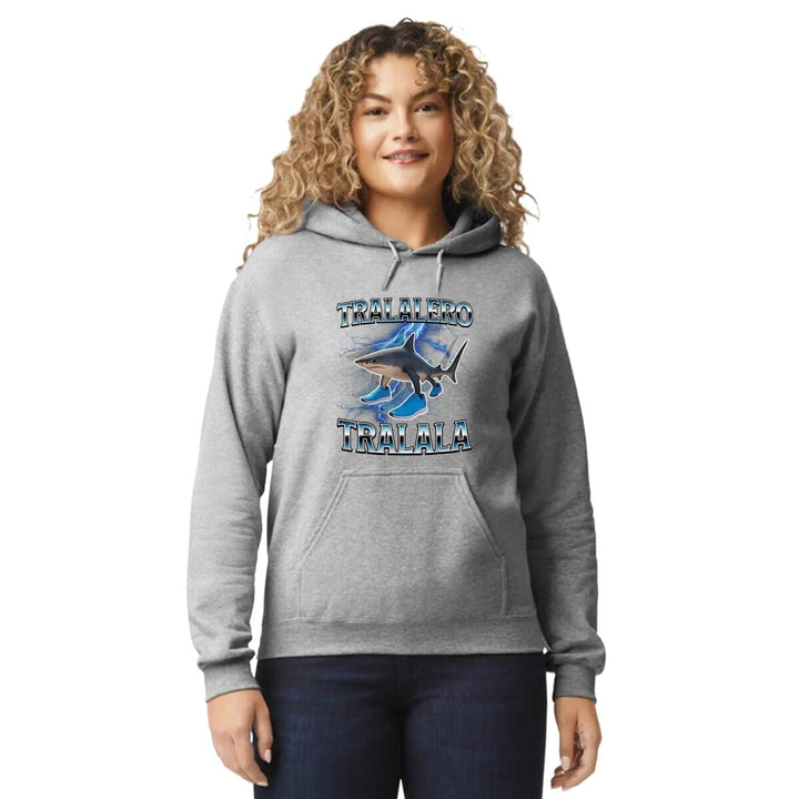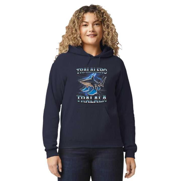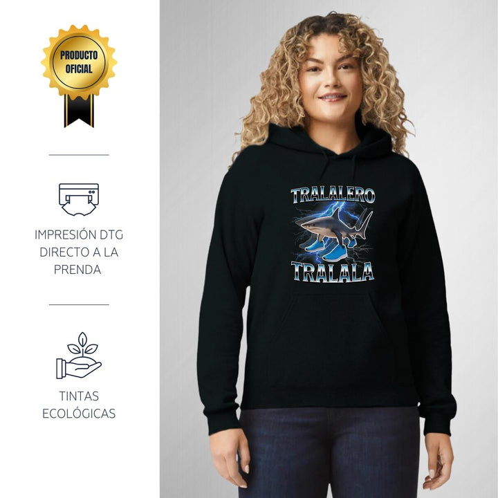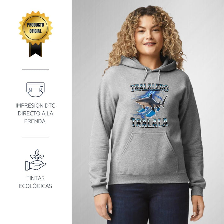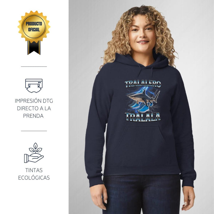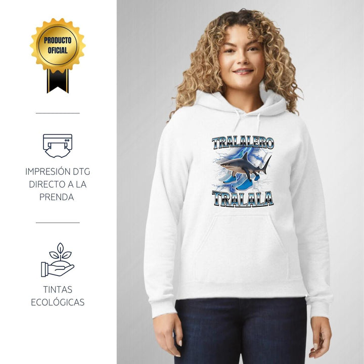 Sudadera hoodie de adulto con gorro o capucha y bolsillo frontal canguro, para mujer nueva, diseño Brainrot Tralalero Tralala original impreso con tecnología DTG (directo a la prenda) tacto cero, uso casual o deportiva, 50% algodón y 50% poliéster fleece pre encogido, estructura tubular con ajuste clásico. Colores de sudadera: Negro, Blanco, Azul Marino, Gris.