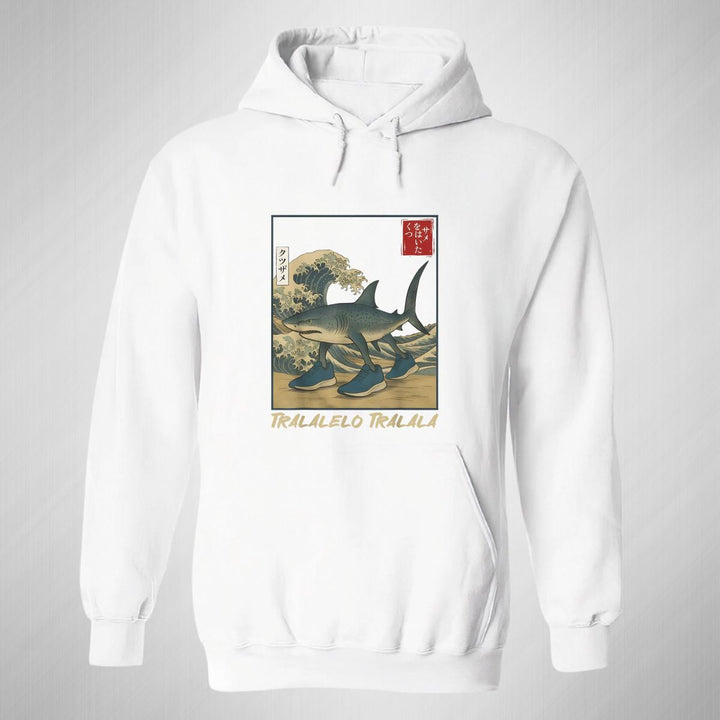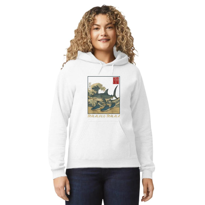 Sudadera hoodie de adulto con gorro o capucha y bolsillo frontal canguro, para mujer nueva, diseño Brainrot Tralalero Tralala original impreso con tecnología DTG (directo a la prenda) tacto cero, uso casual o deportiva, 50% algodón y 50% poliéster fleece pre encogido, estructura tubular con ajuste clásico. Colores de sudadera: Negro, Blanco, Azul Marino, Gris.