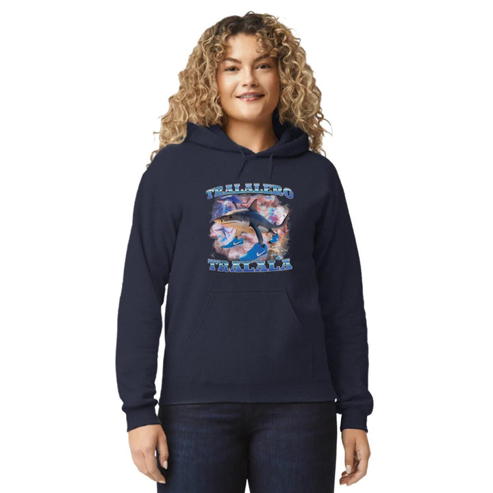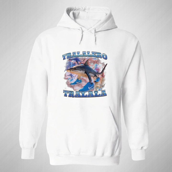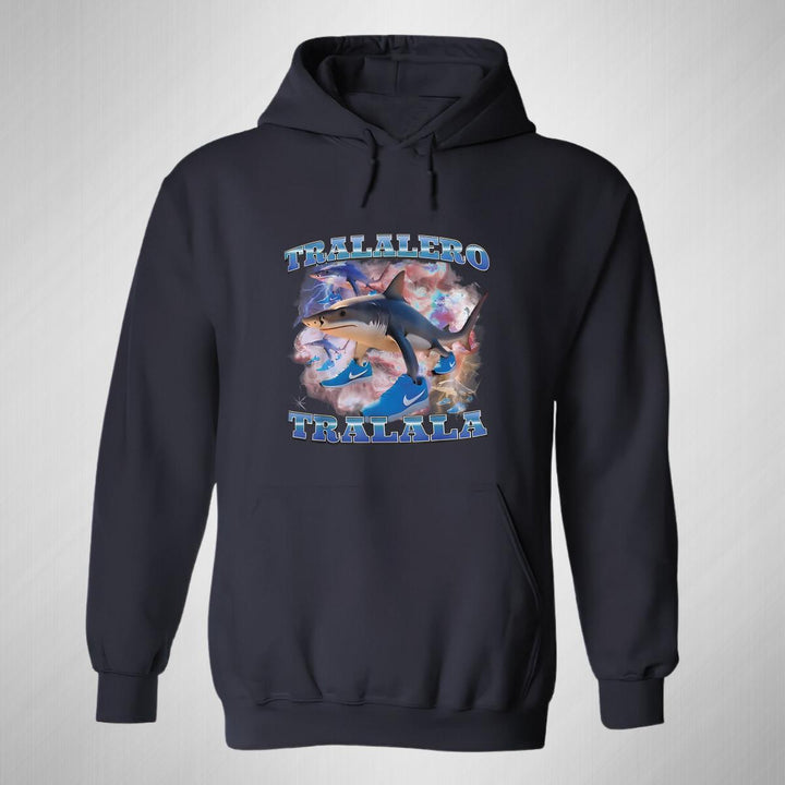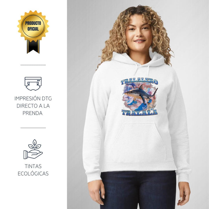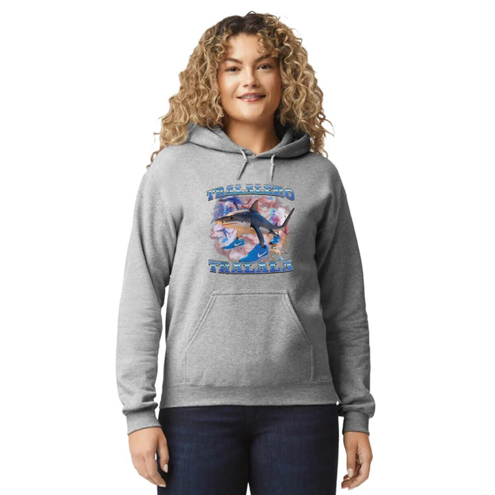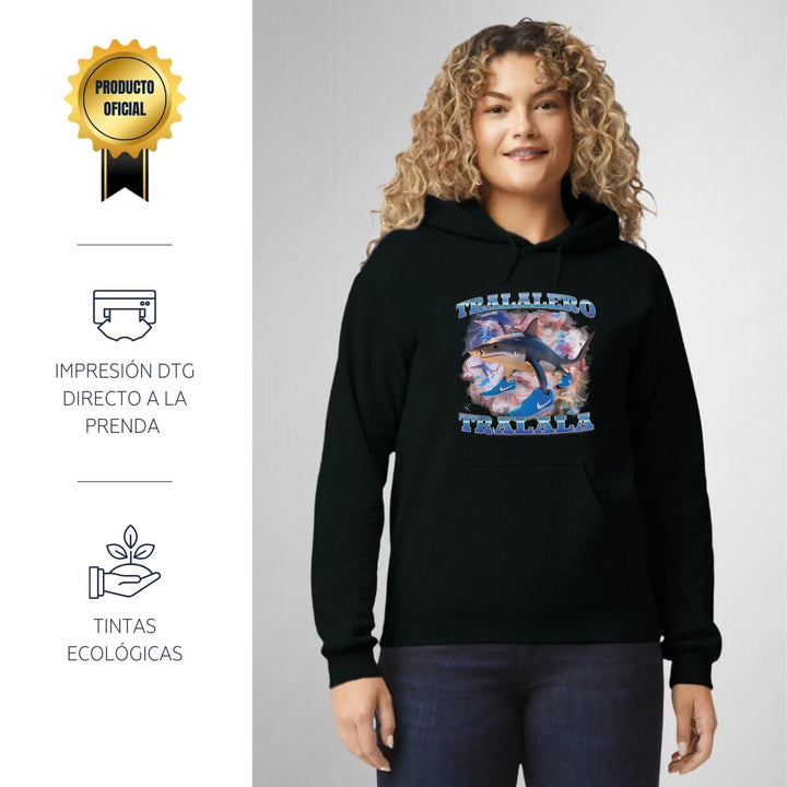 Sudadera hoodie de adulto con gorro o capucha y bolsillo frontal canguro, para mujer nueva, diseño Brainrot Tralalero Tralala original impreso con tecnología DTG (directo a la prenda) tacto cero, uso casual o deportiva, 50% algodón y 50% poliéster fleece pre encogido, estructura tubular con ajuste clásico. Colores de sudadera: Negro, Blanco, Azul Marino, Gris.