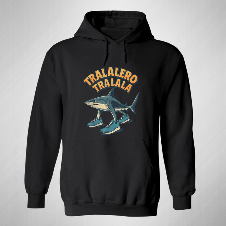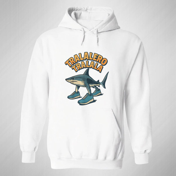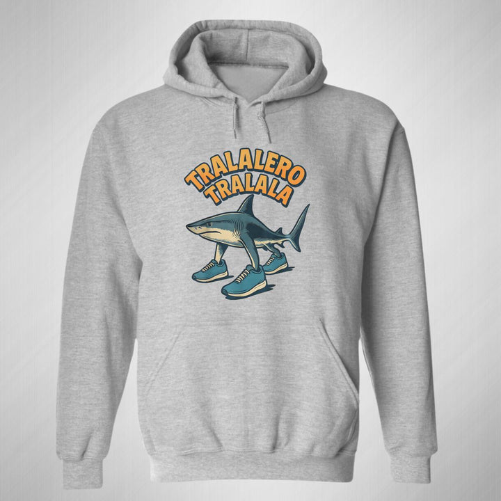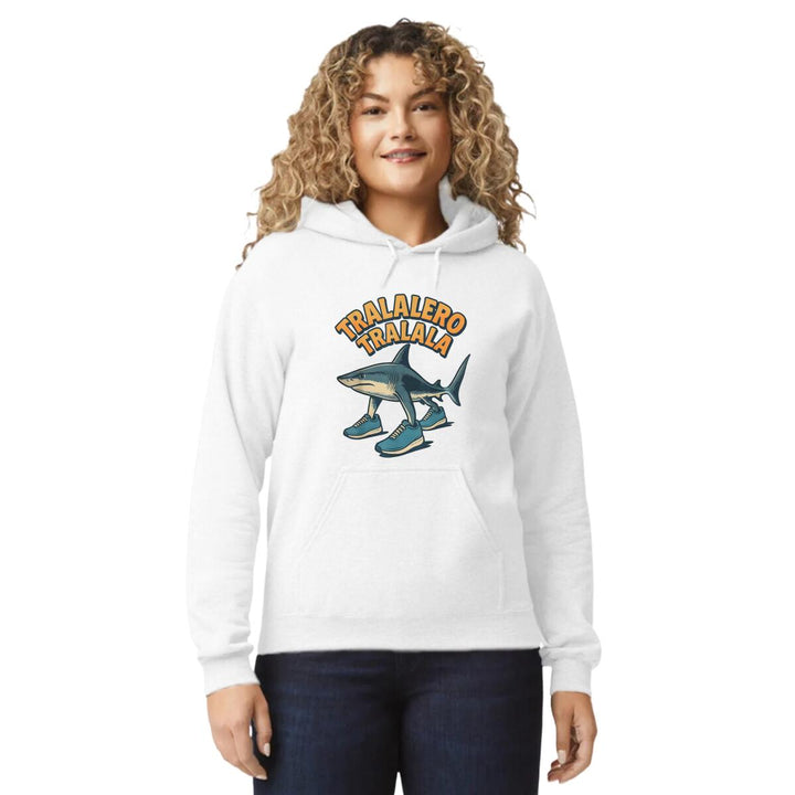 Sudadera hoodie de adulto con gorro o capucha y bolsillo frontal canguro, para mujer nueva, diseño Brainrot Tralalero Tralala original impreso con tecnología DTG (directo a la prenda) tacto cero, uso casual o deportiva, 50% algodón y 50% poliéster fleece pre encogido, estructura tubular con ajuste clásico. Colores de sudadera: Negro, Blanco, Azul Marino, Gris.