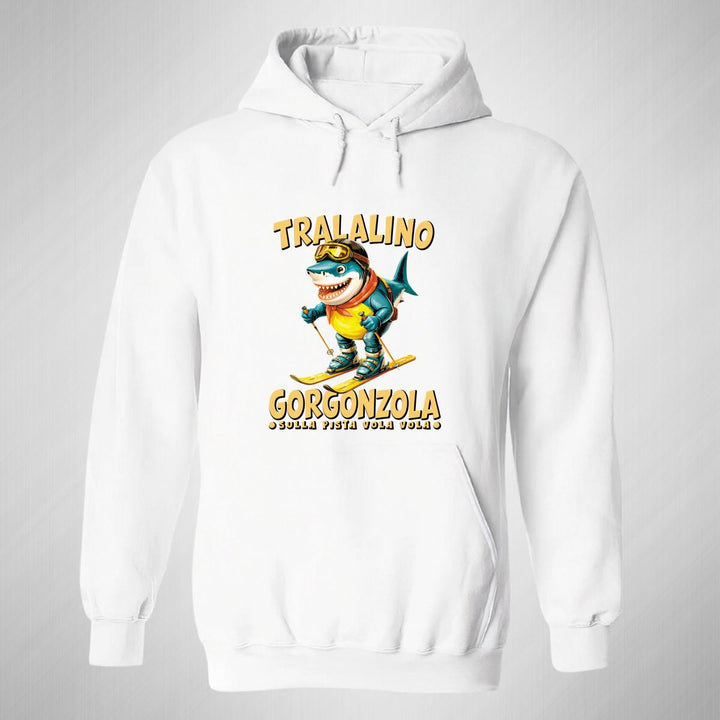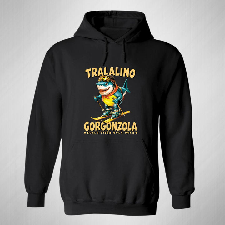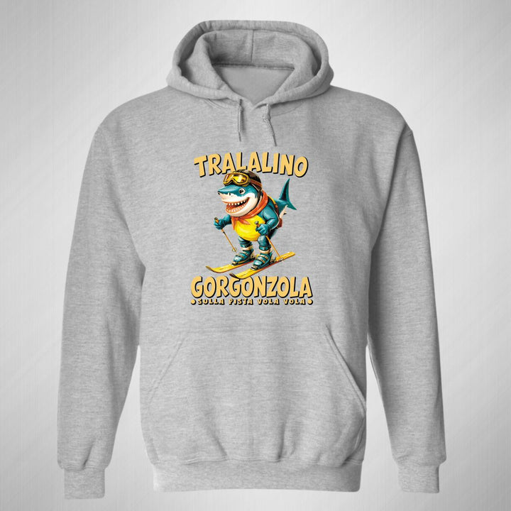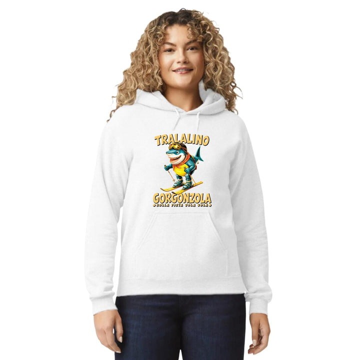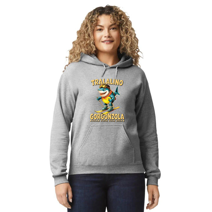 Sudadera hoodie de adulto con gorro o capucha y bolsillo frontal canguro, para mujer nueva, diseño Brainrot Tralalino Gorgonzola original impreso con tecnología DTG (directo a la prenda) tacto cero, uso casual o deportiva, 50% algodón y 50% poliéster fleece pre encogido, estructura tubular con ajuste clásico. Colores de sudadera: Negro, Blanco, Azul Marino, Gris.