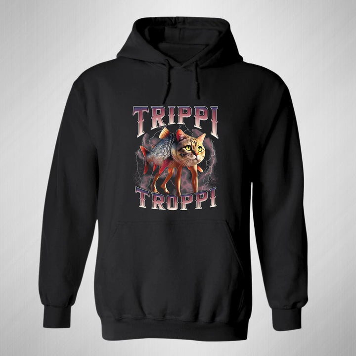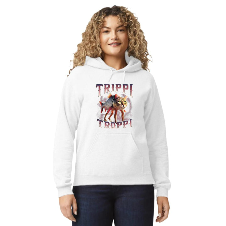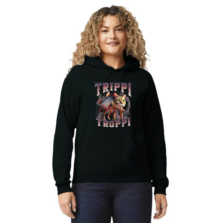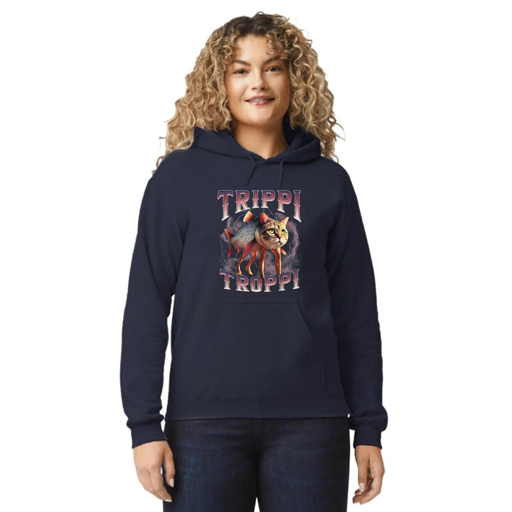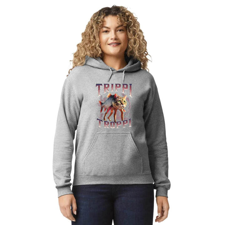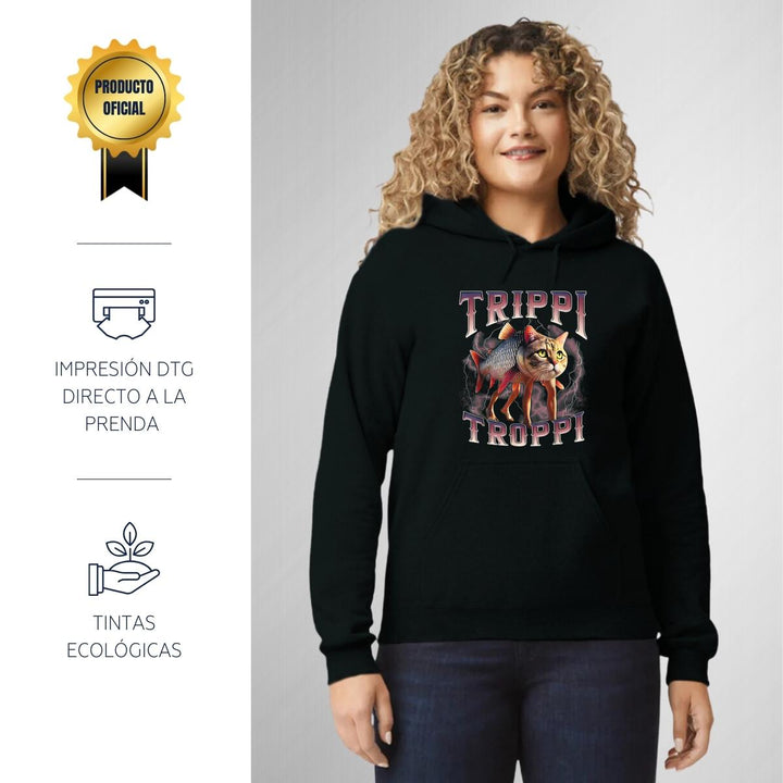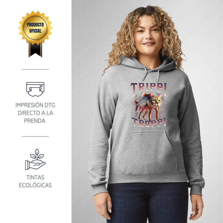 Sudadera hoodie de adulto con gorro o capucha y bolsillo frontal canguro, para mujer nueva, diseño Brainrot Trippi Troppi original impreso con tecnología DTG (directo a la prenda) tacto cero, uso casual o deportiva, 50% algodón y 50% poliéster fleece pre encogido, estructura tubular con ajuste clásico. Colores de sudadera: Negro, Blanco, Azul Marino, Gris.