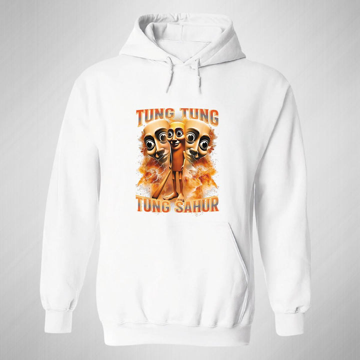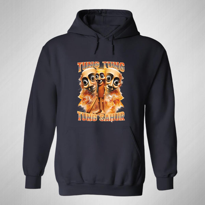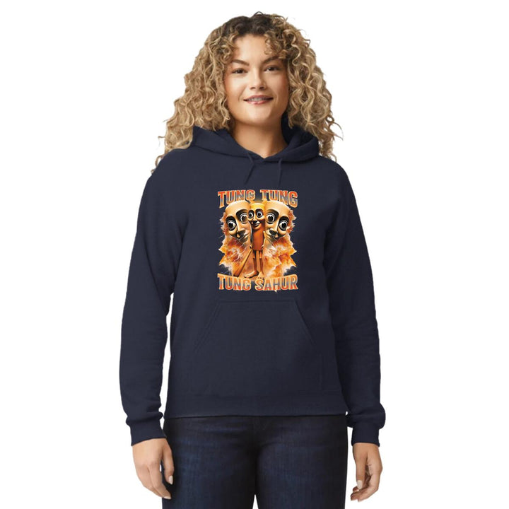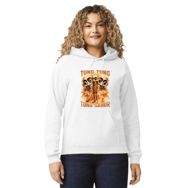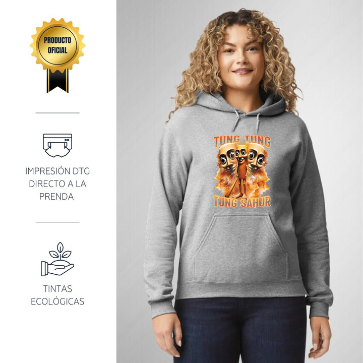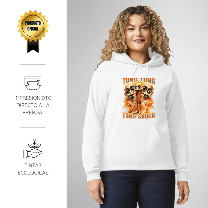 Sudadera hoodie de adulto con gorro o capucha y bolsillo frontal canguro, para mujer nueva, diseño Brainrot Tung Tung Tung Sahur original impreso con tecnología DTG (directo a la prenda) tacto cero, uso casual o deportiva, 50% algodón y 50% poliéster fleece pre encogido, estructura tubular con ajuste clásico. Colores de sudadera: Negro, Blanco, Azul Marino, Gris.