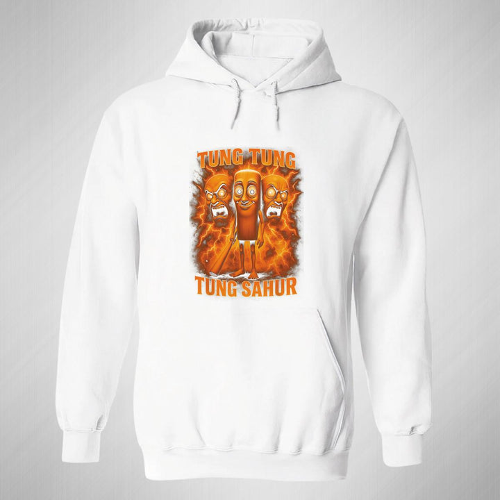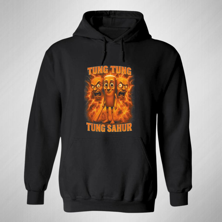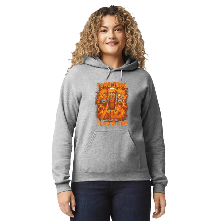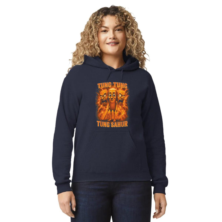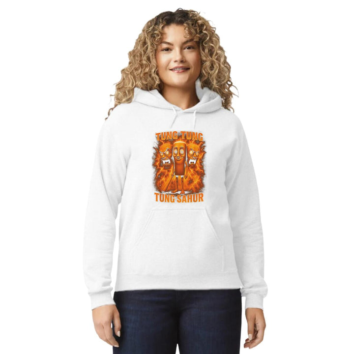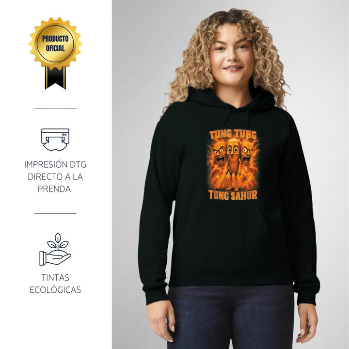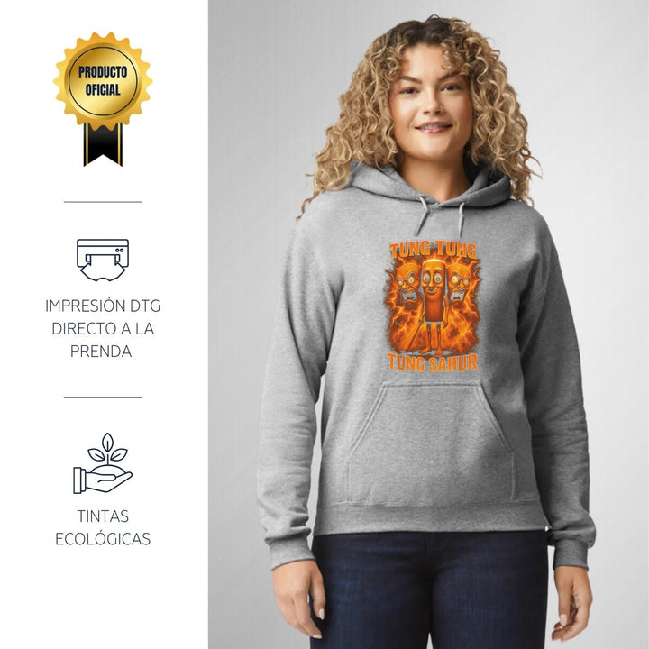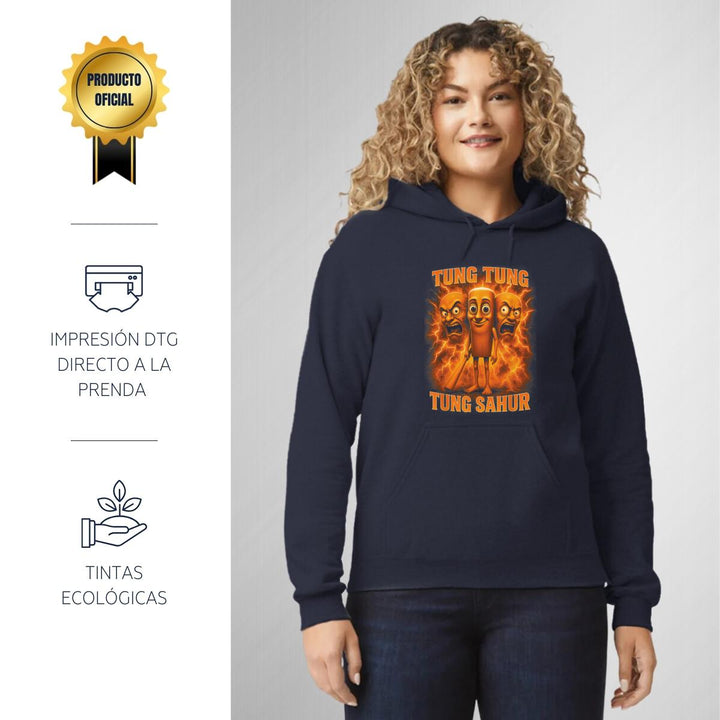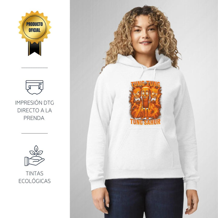 Sudadera hoodie de adulto con gorro o capucha y bolsillo frontal canguro, para mujer nueva, diseño Brainrot Tung Tung Tung Sahur original impreso con tecnología DTG (directo a la prenda) tacto cero, uso casual o deportiva, 50% algodón y 50% poliéster fleece pre encogido, estructura tubular con ajuste clásico. Colores de sudadera: Negro, Blanco, Azul Marino, Gris.