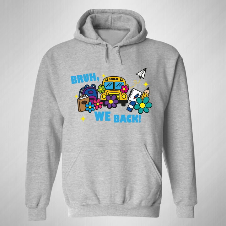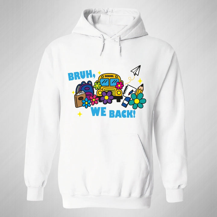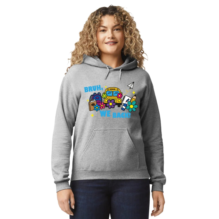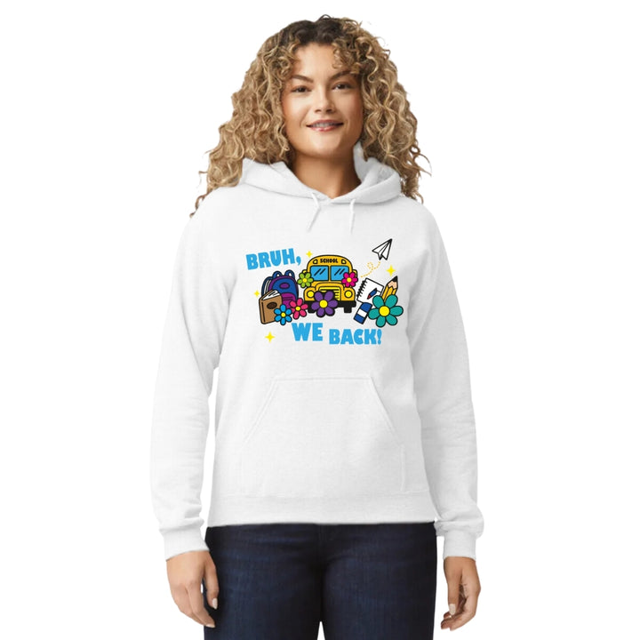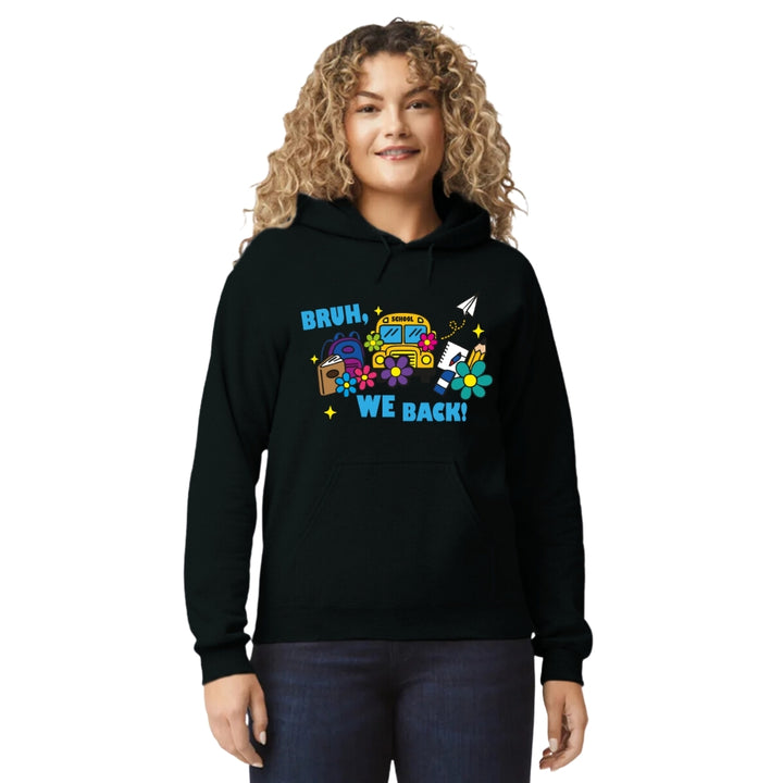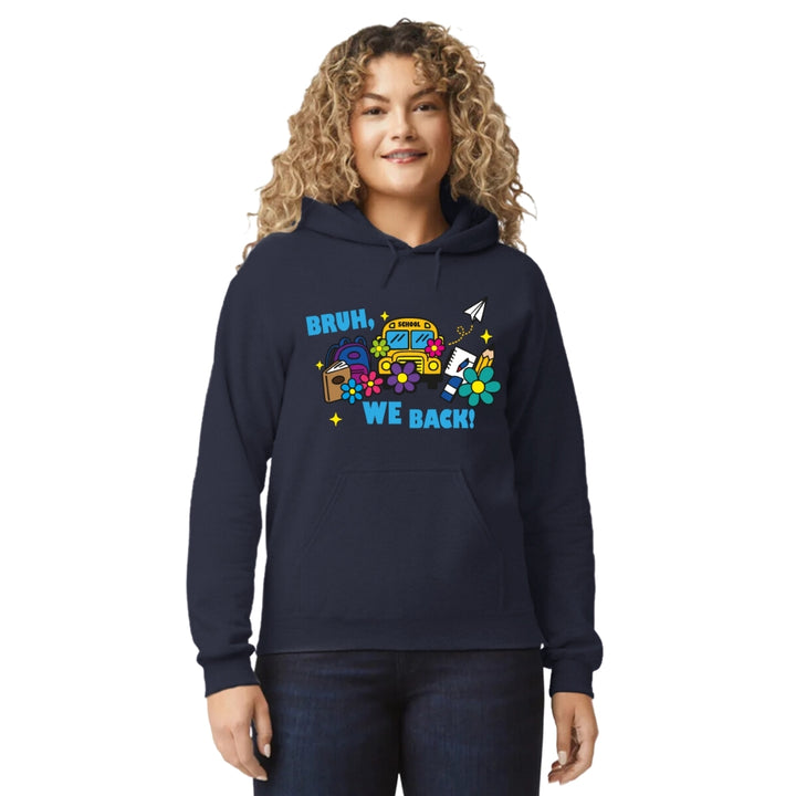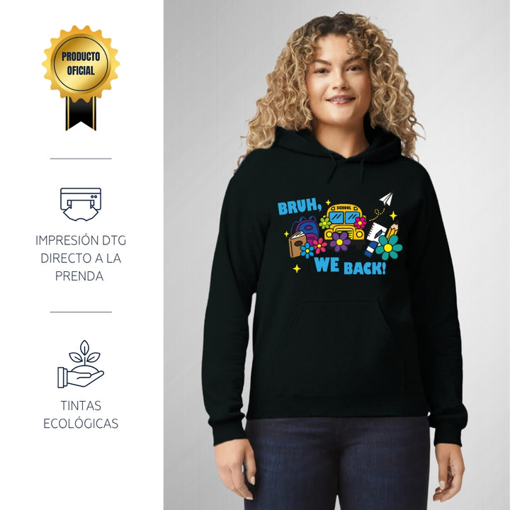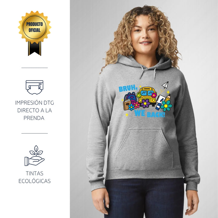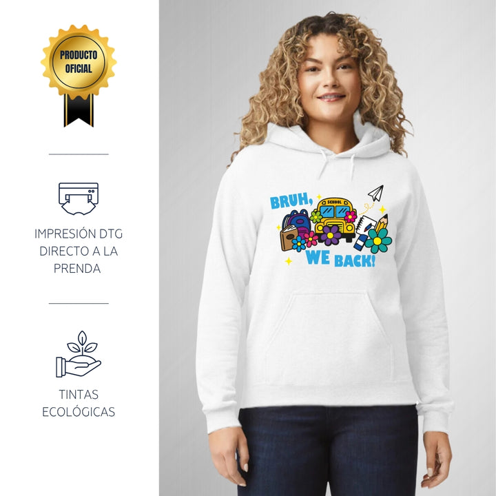 Sudadera hoodie de adulto con gorro o capucha y bolsillo frontal canguro, para mujer nueva, diseño Bruh We Back original impreso con tecnología DTG (directo a la prenda) tacto cero, uso casual o deportiva, 50% algodón y 50% poliéster fleece pre encogido, estructura tubular con ajuste clásico. Colores de sudadera: Negro, Blanco, Azul Marino, Gris.