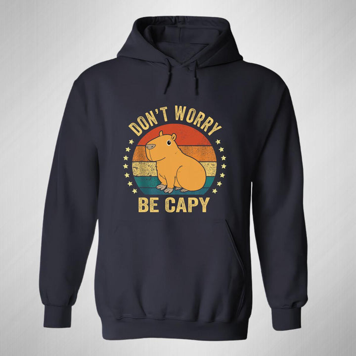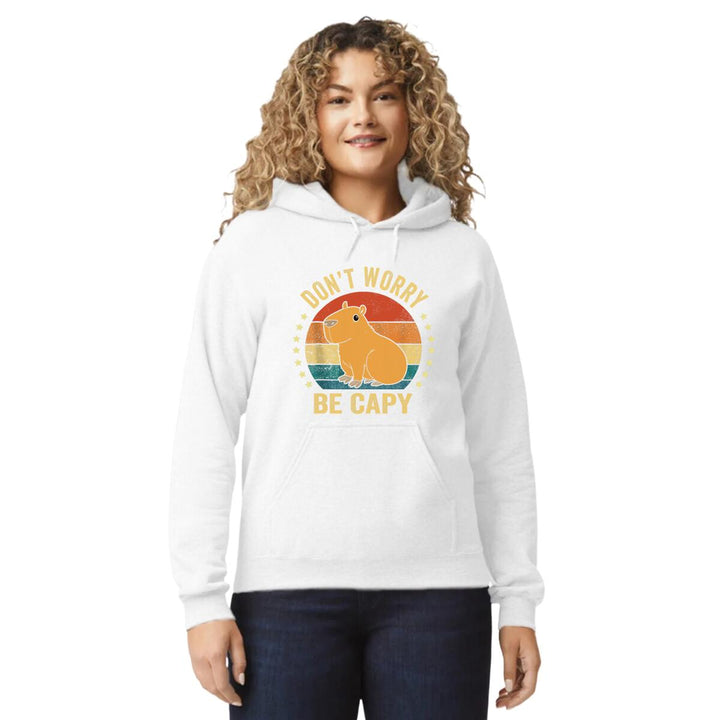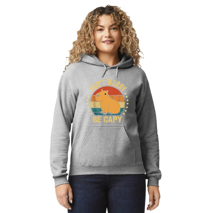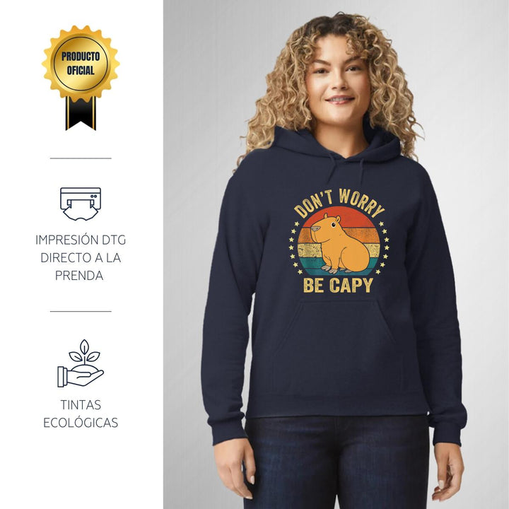 Sudadera hoodie de adulto con gorro o capucha y bolsillo frontal canguro, para mujer nueva, diseño Capibara Carpincho Frases original impreso con tecnología DTG (directo a la prenda) tacto cero, uso casual o deportiva, 50% algodón y 50% poliéster fleece pre encogido, estructura tubular con ajuste clásico. Colores de sudadera: Negro, Blanco, Azul Marino, Gris.